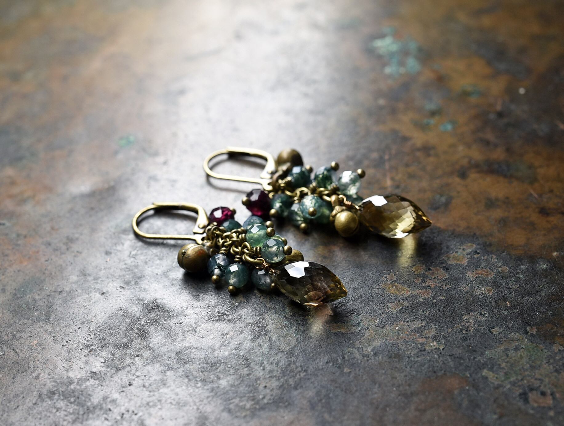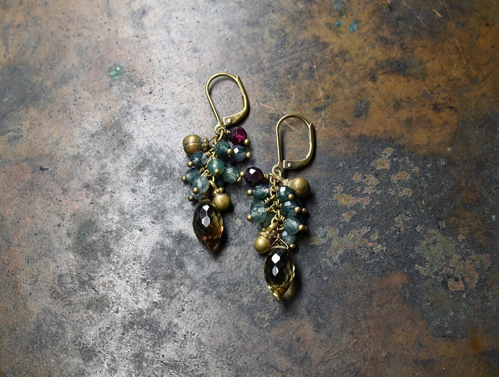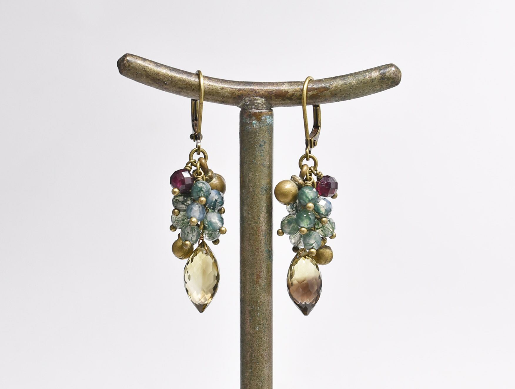 スモーキークォーツとたわわなモスアゲート、ガーネットと民族鈴のピアス
