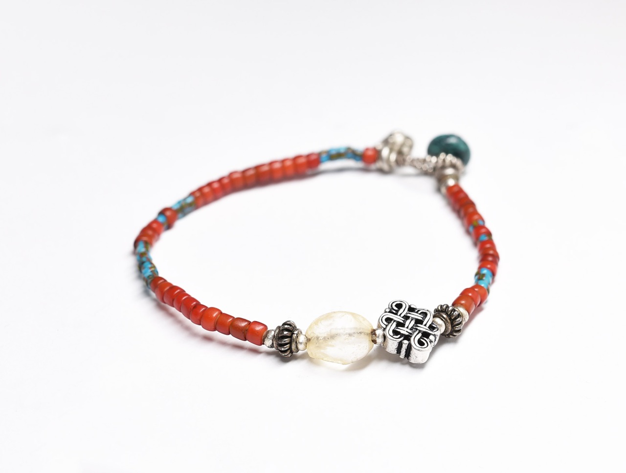 古代水晶とエンドレスノット、飴色&ターコイズブルーホワイトハーツを繋いだブレスです。