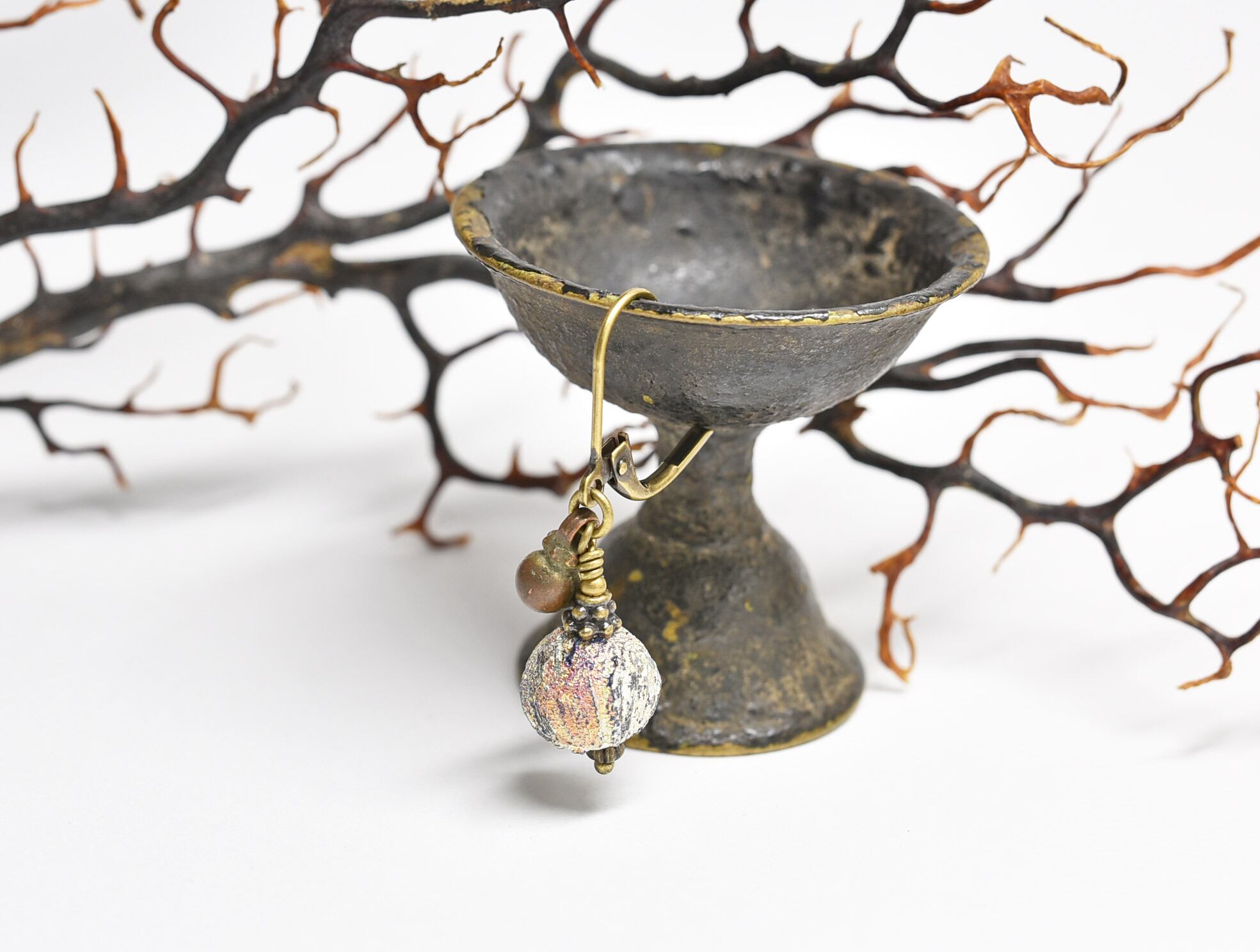 退廃的な銀化ローマングラスビーズと民族鈴を繋いだ小さな片耳のピアスです。
