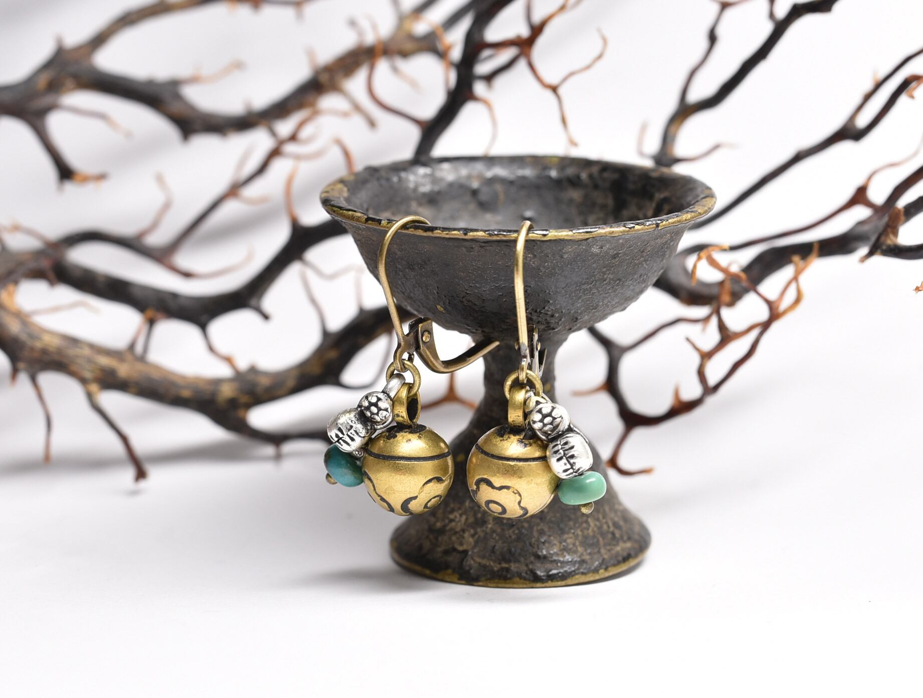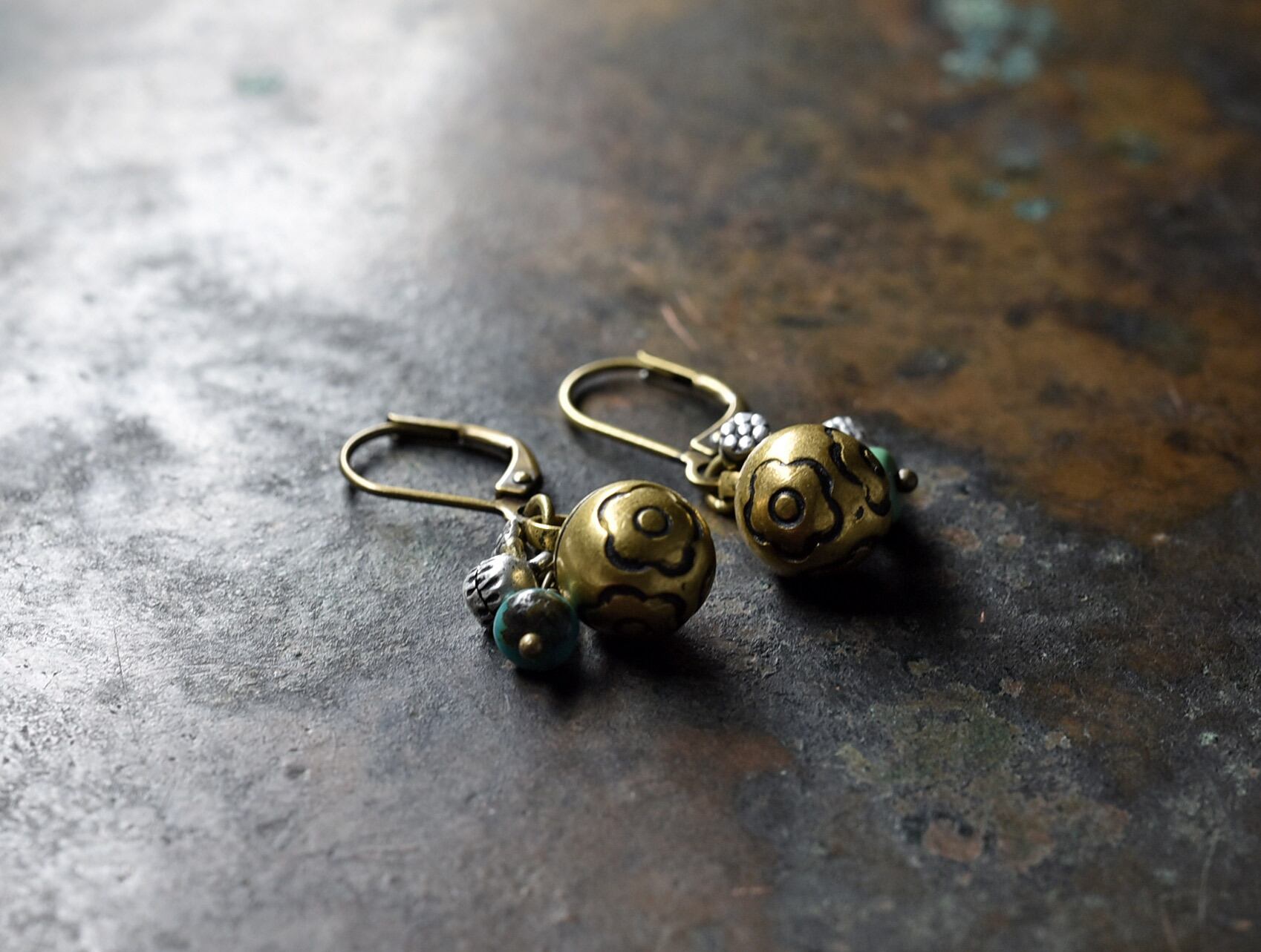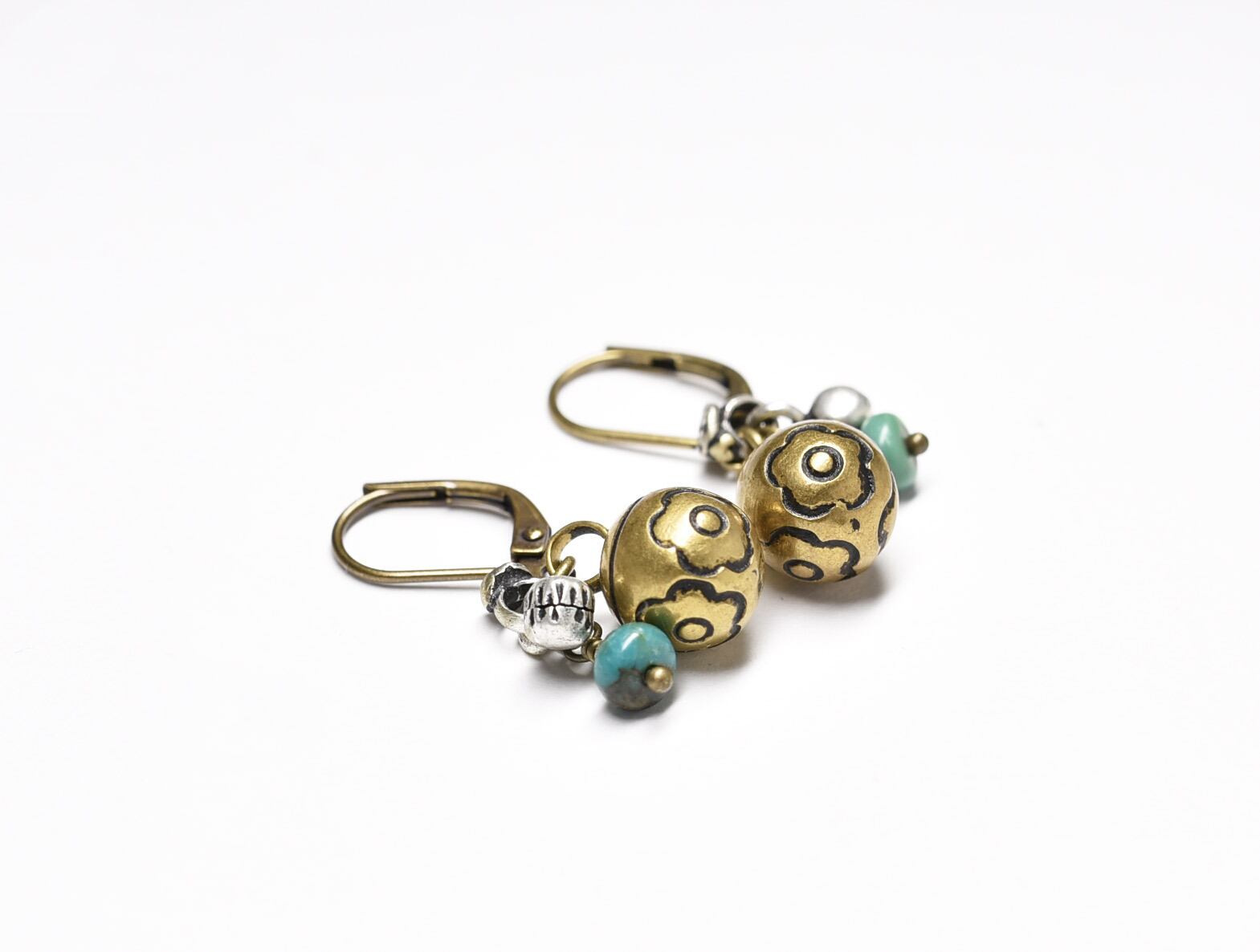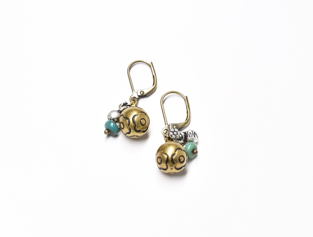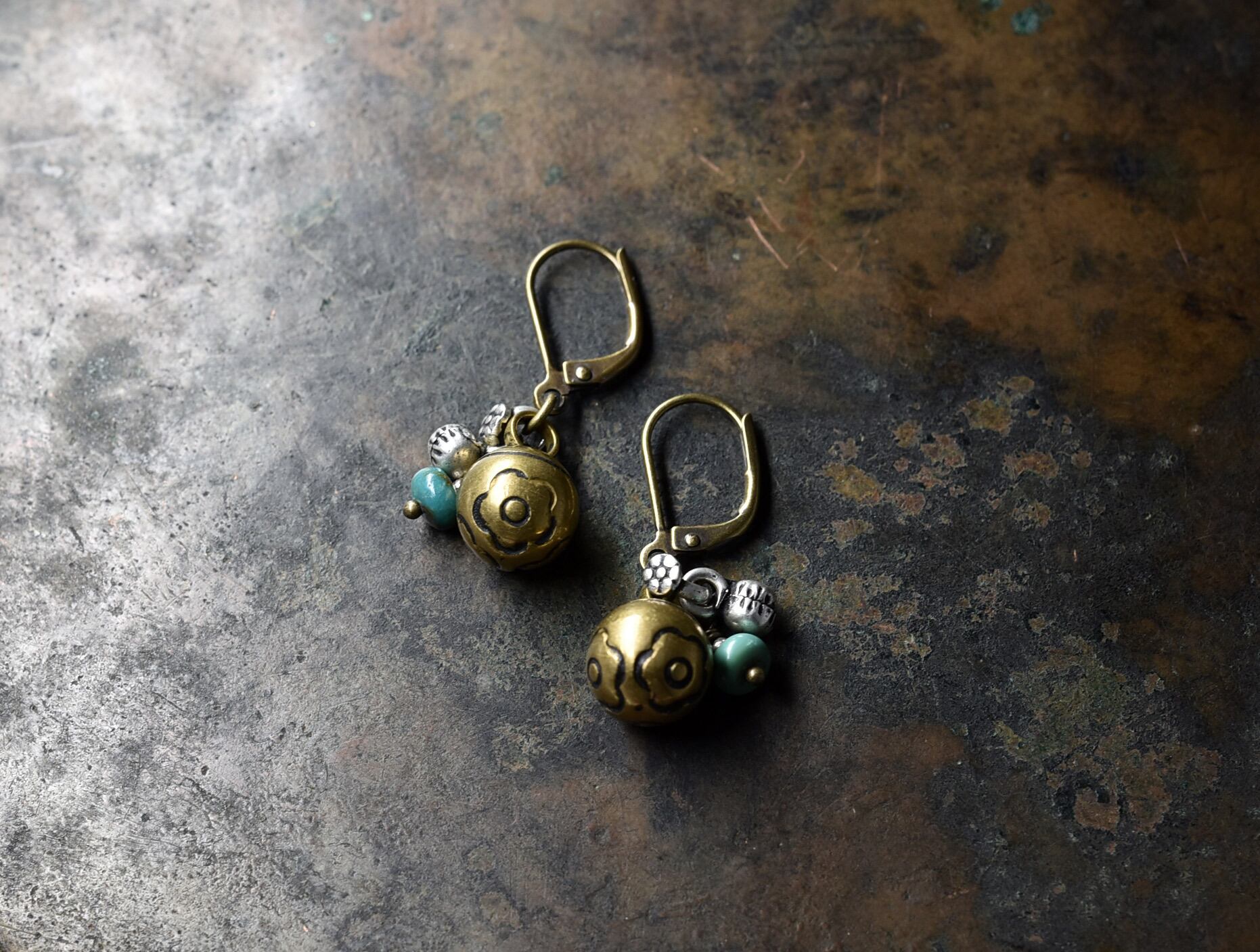 ミャオ族の真鍮ボタンとインドシルバー鈴、ターコイズを繋いだ小ぶりなピアスです。