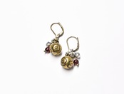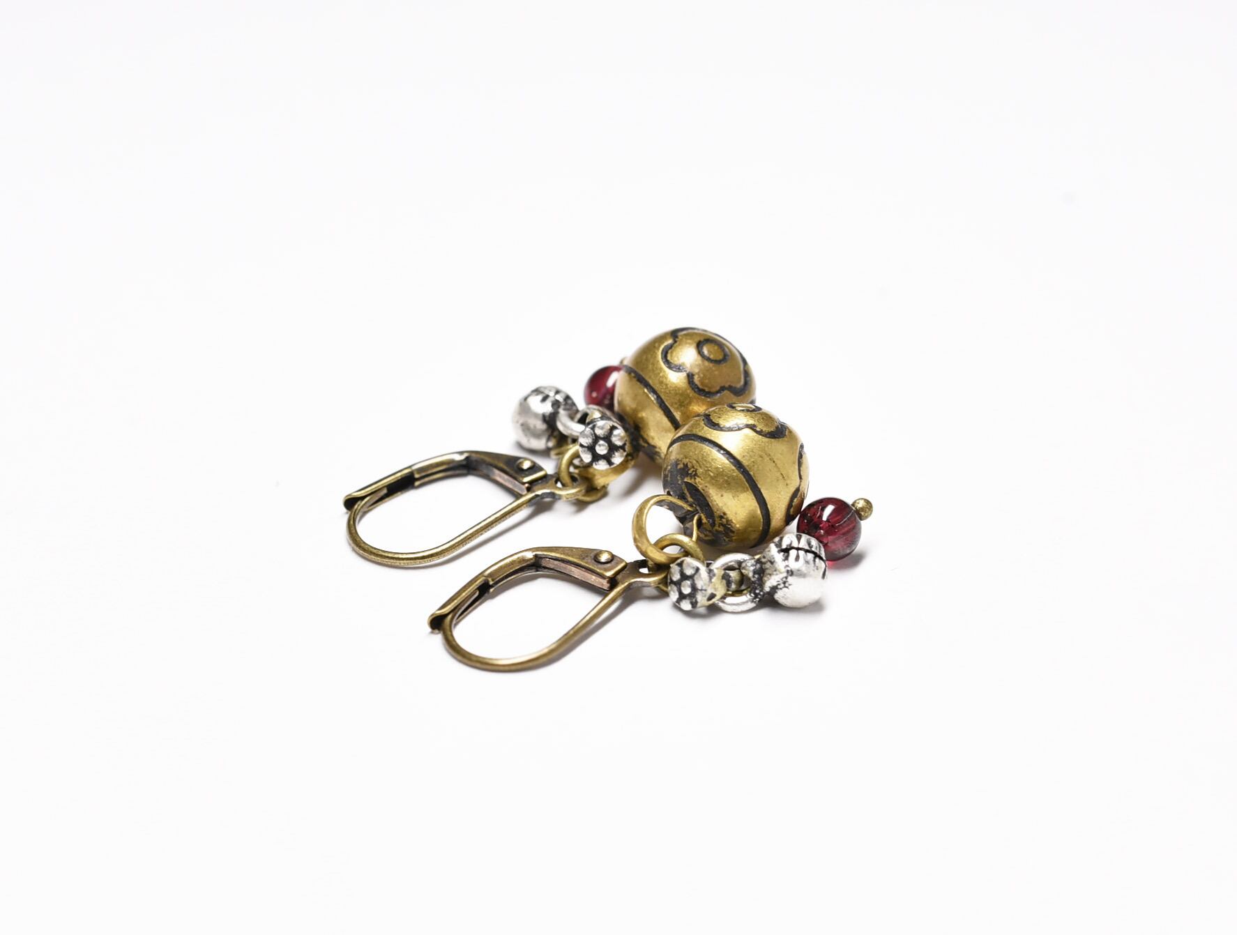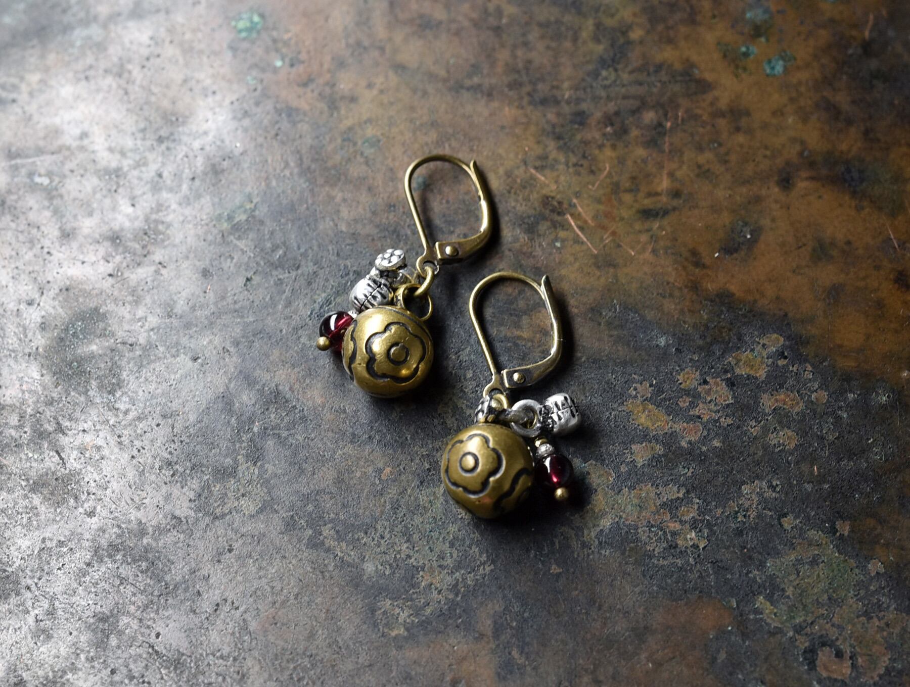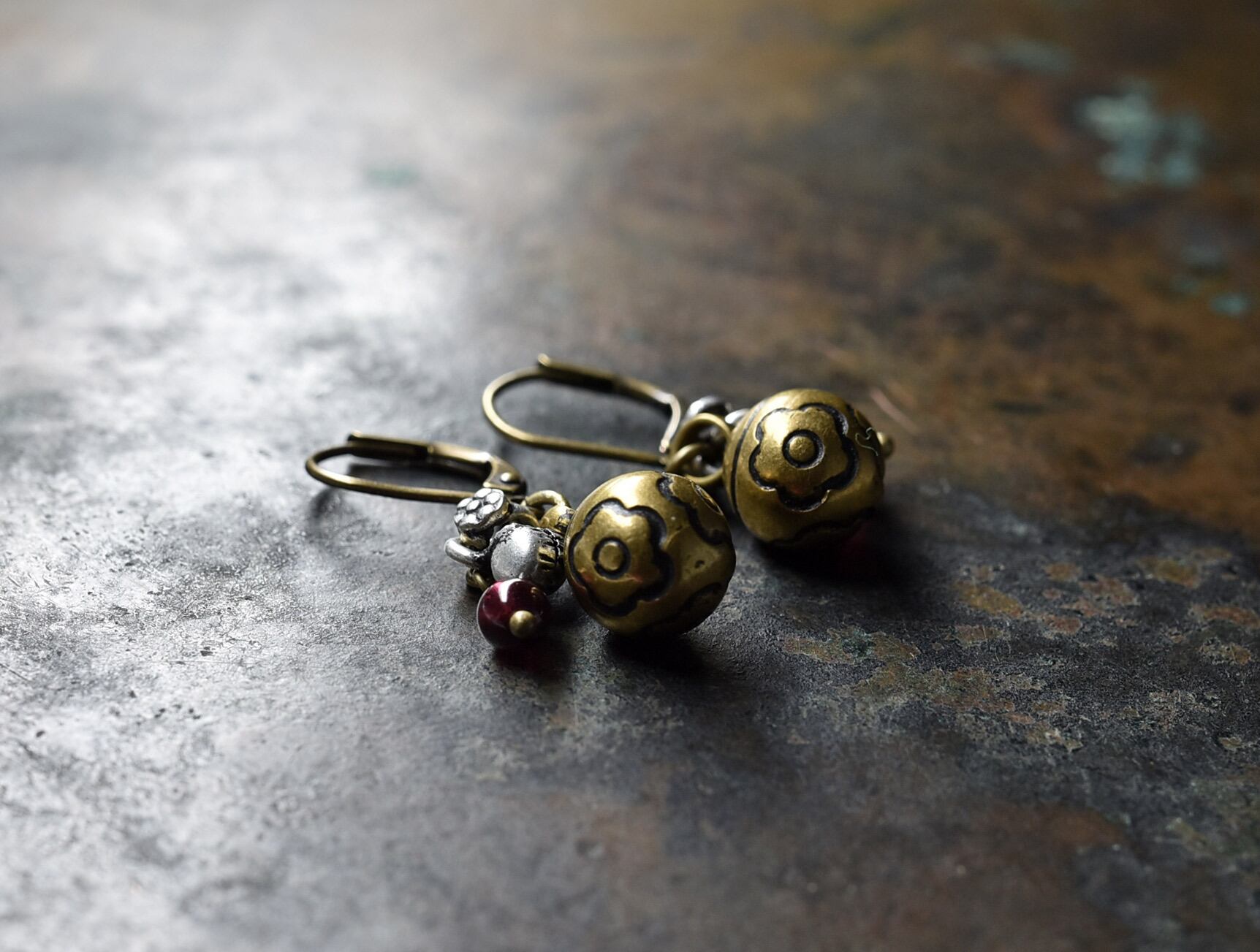 ミャオ族の真鍮ボタンとインドシルバー鈴、ガーネットを繋いだ小ぶりなピアスです。