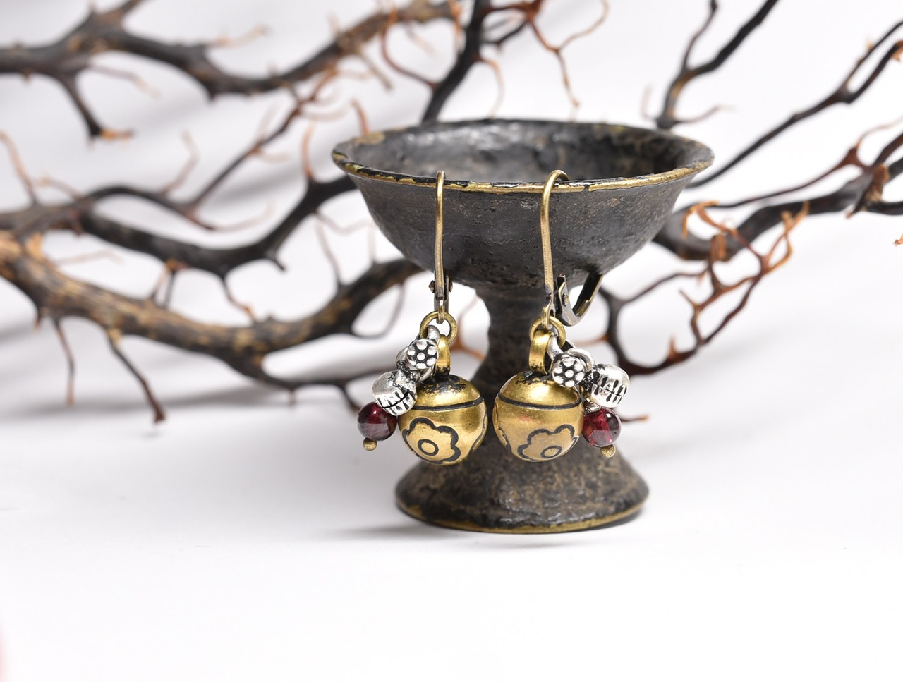 ミャオ族の真鍮ボタンと花付きインドシルバーの鈴、ガーネットのピアス