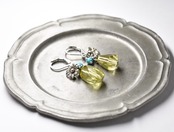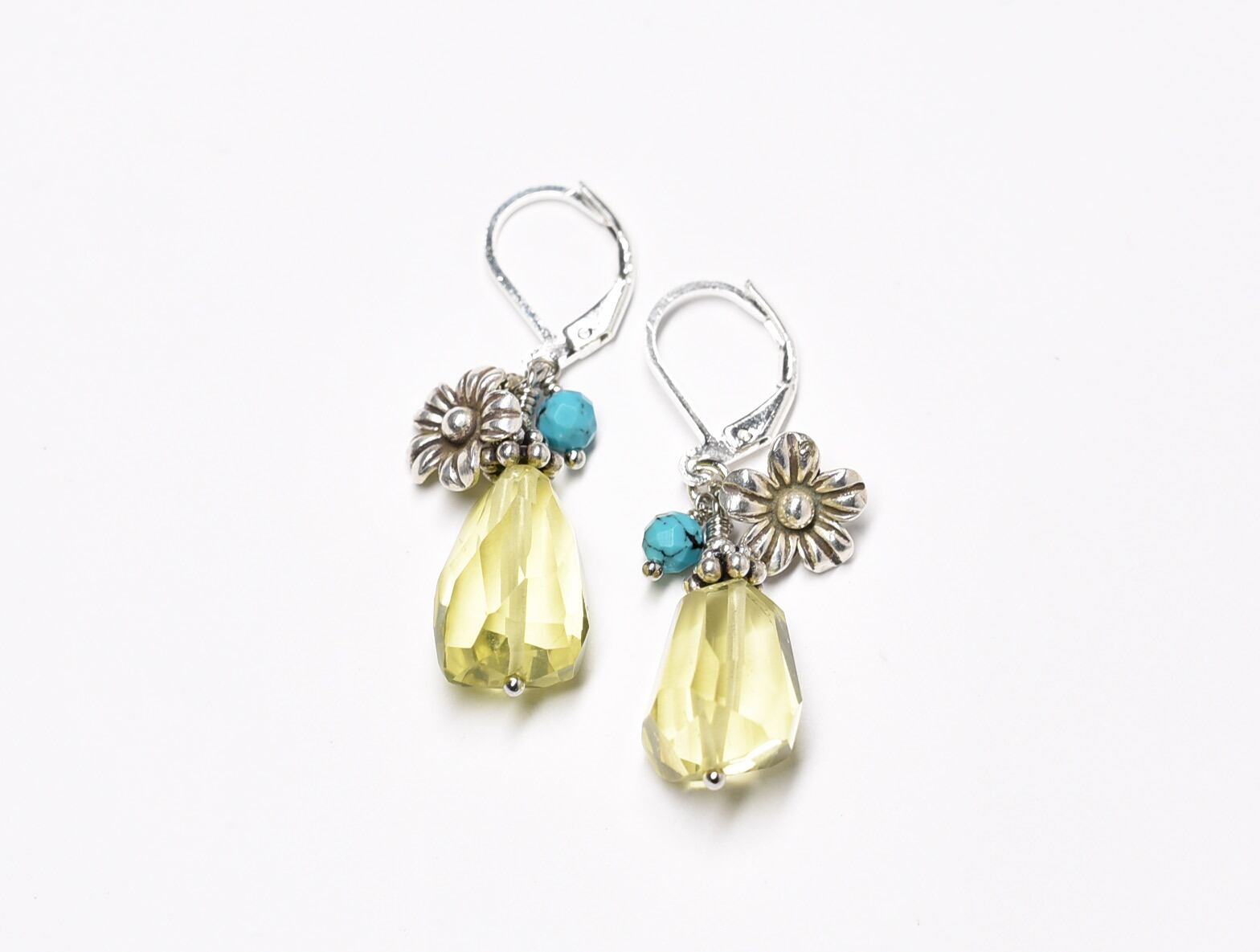 レモンクォーツとターコイズ、カレンシルバーのお花を繋いだ小さめなピアスです。