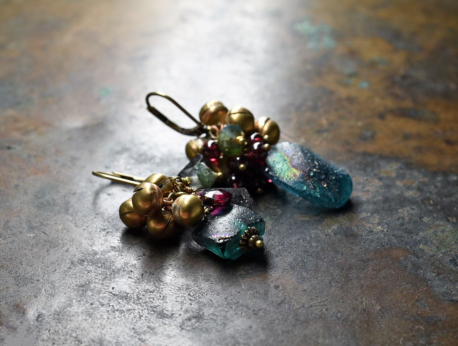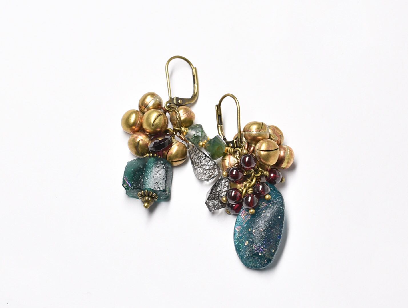 銀化したローマングラスと鈴、ガーネット、ブラックルチルクォーツ、モスアゲートを繋いだピアスです。