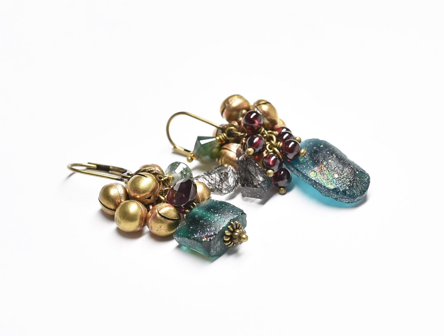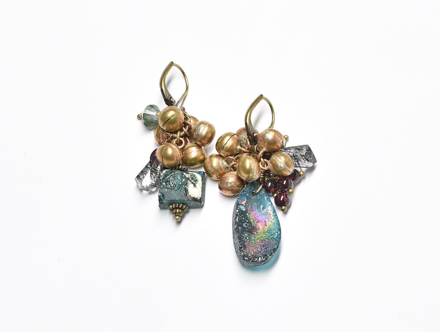 銀化ローマングラスとたわわな鈴とガーネットブラックルチルクォーツ、モスアゲートのピアス