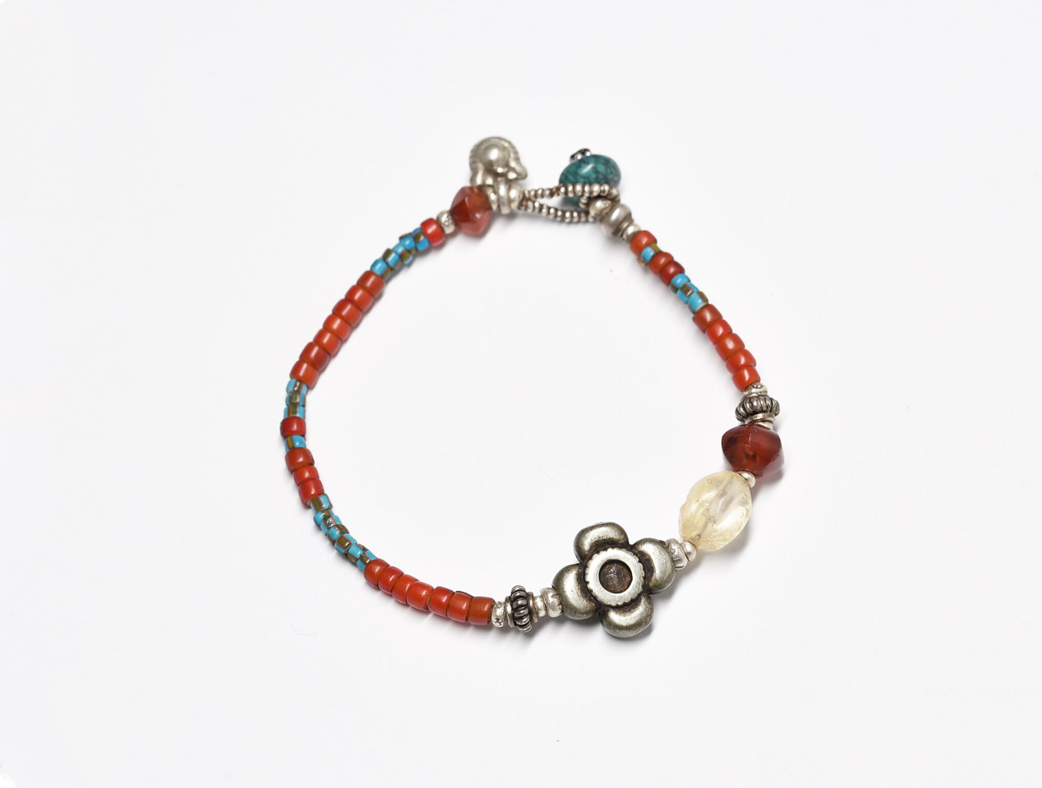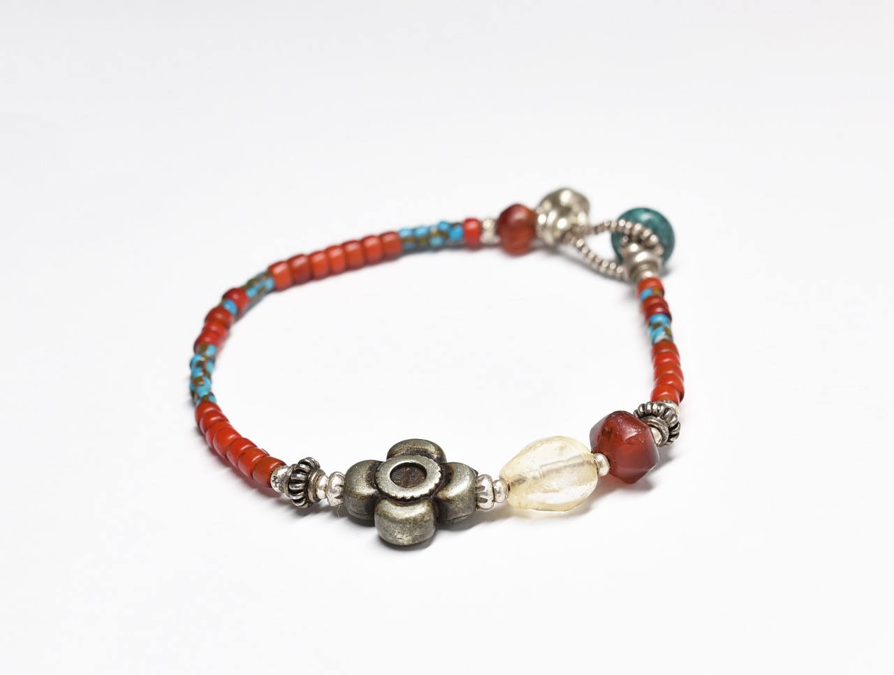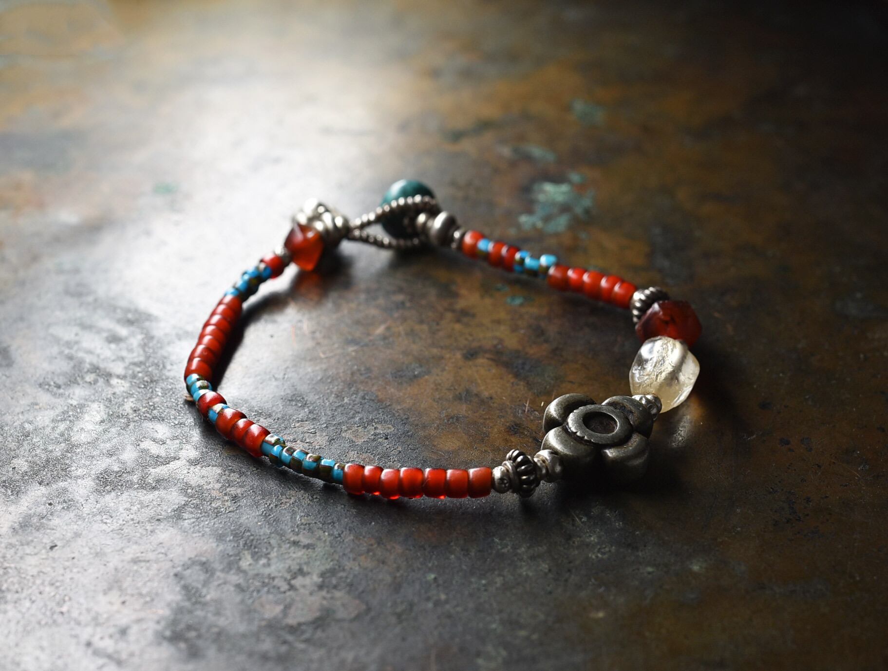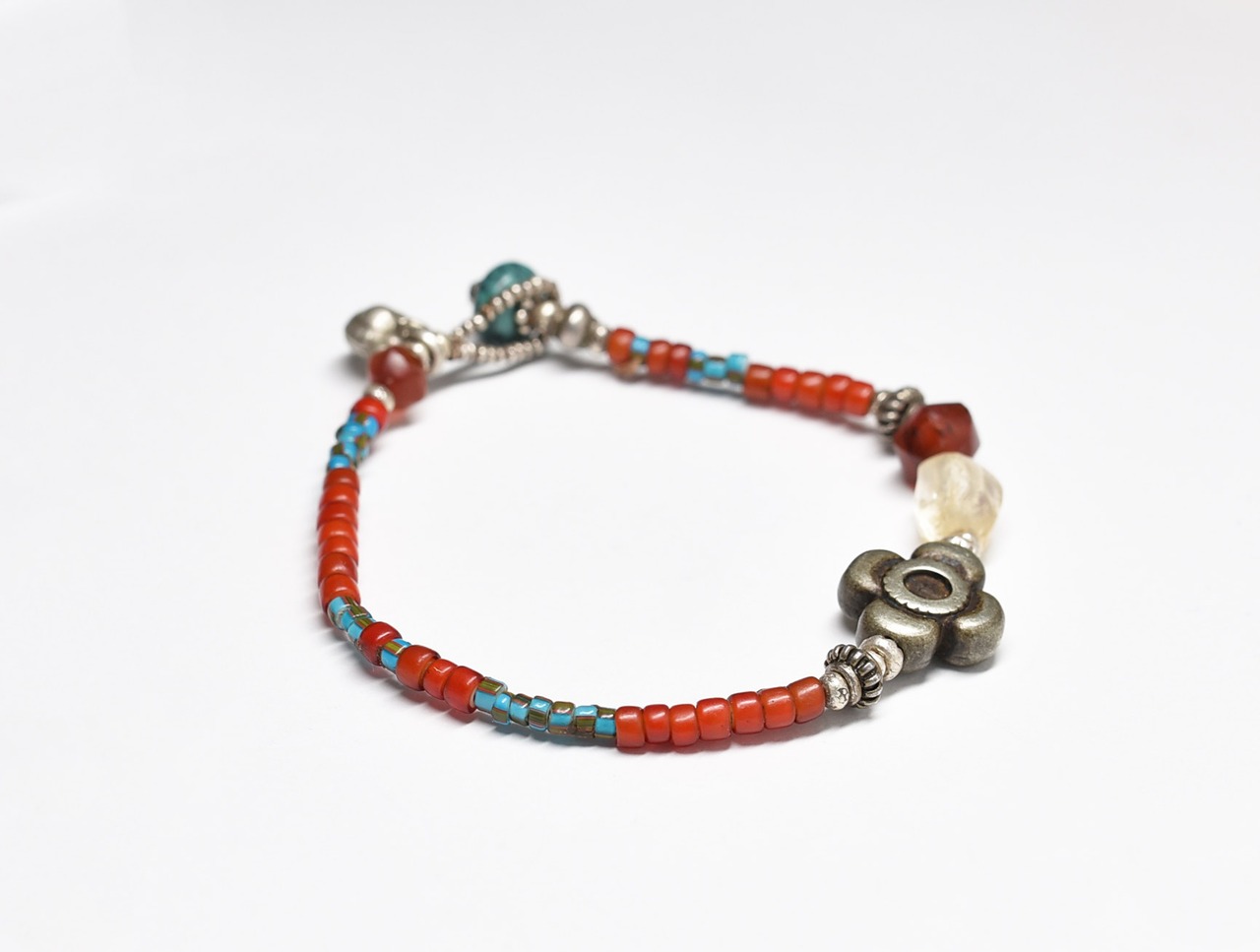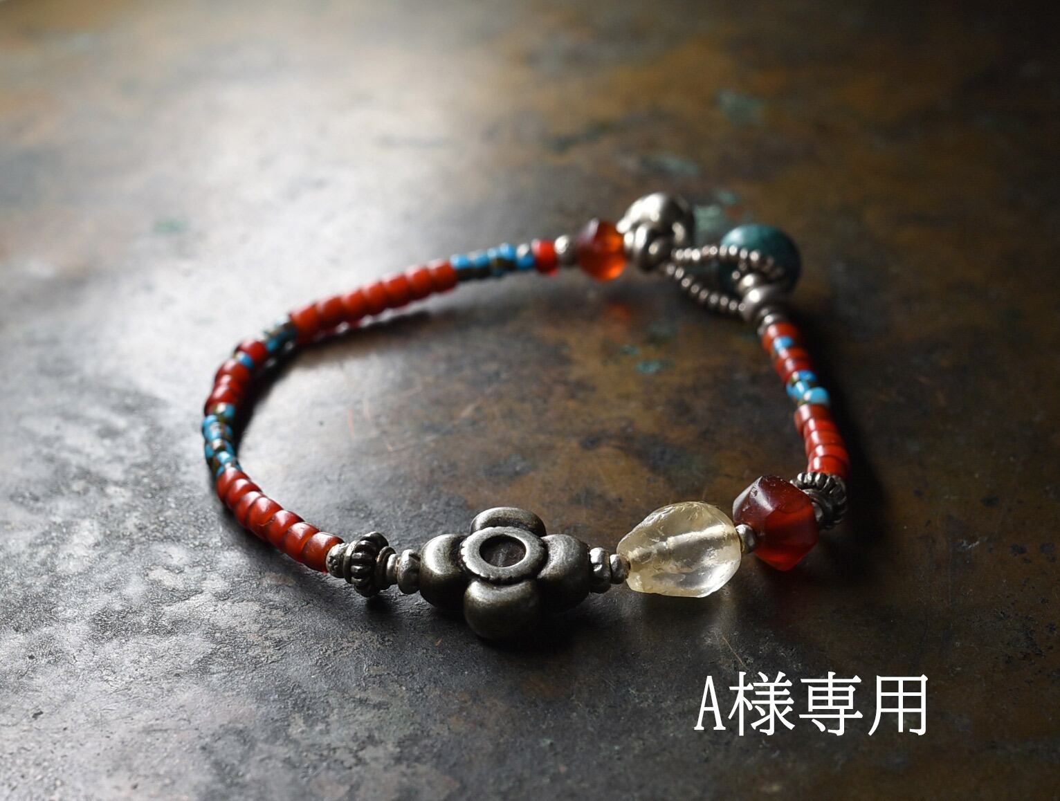 素材:インドシルバー、古代カーネリアン、古代水晶、ガラス、ターコイズ、カレンシルバー、ミックスメタル、ロウビキ紐