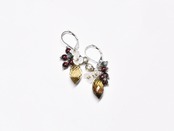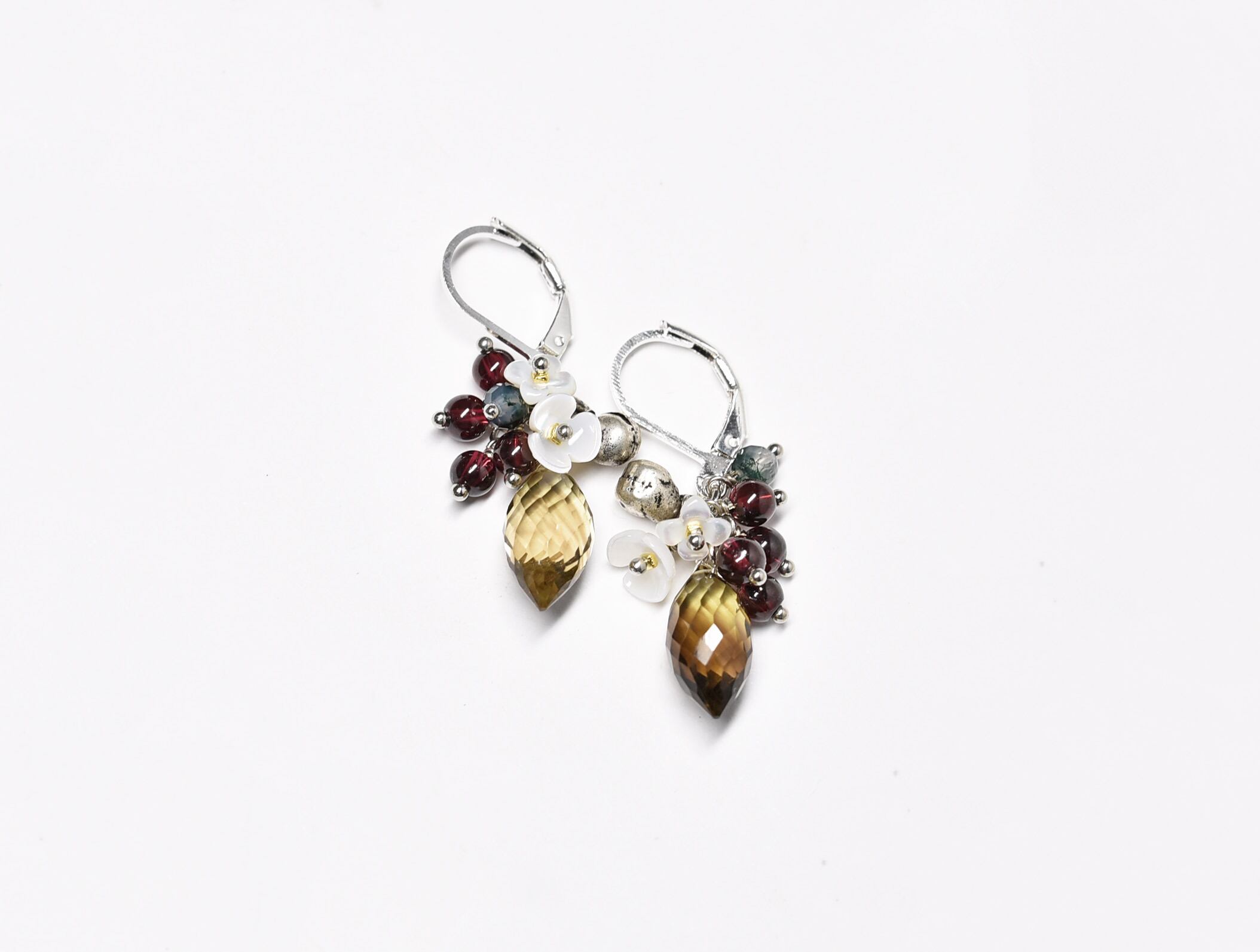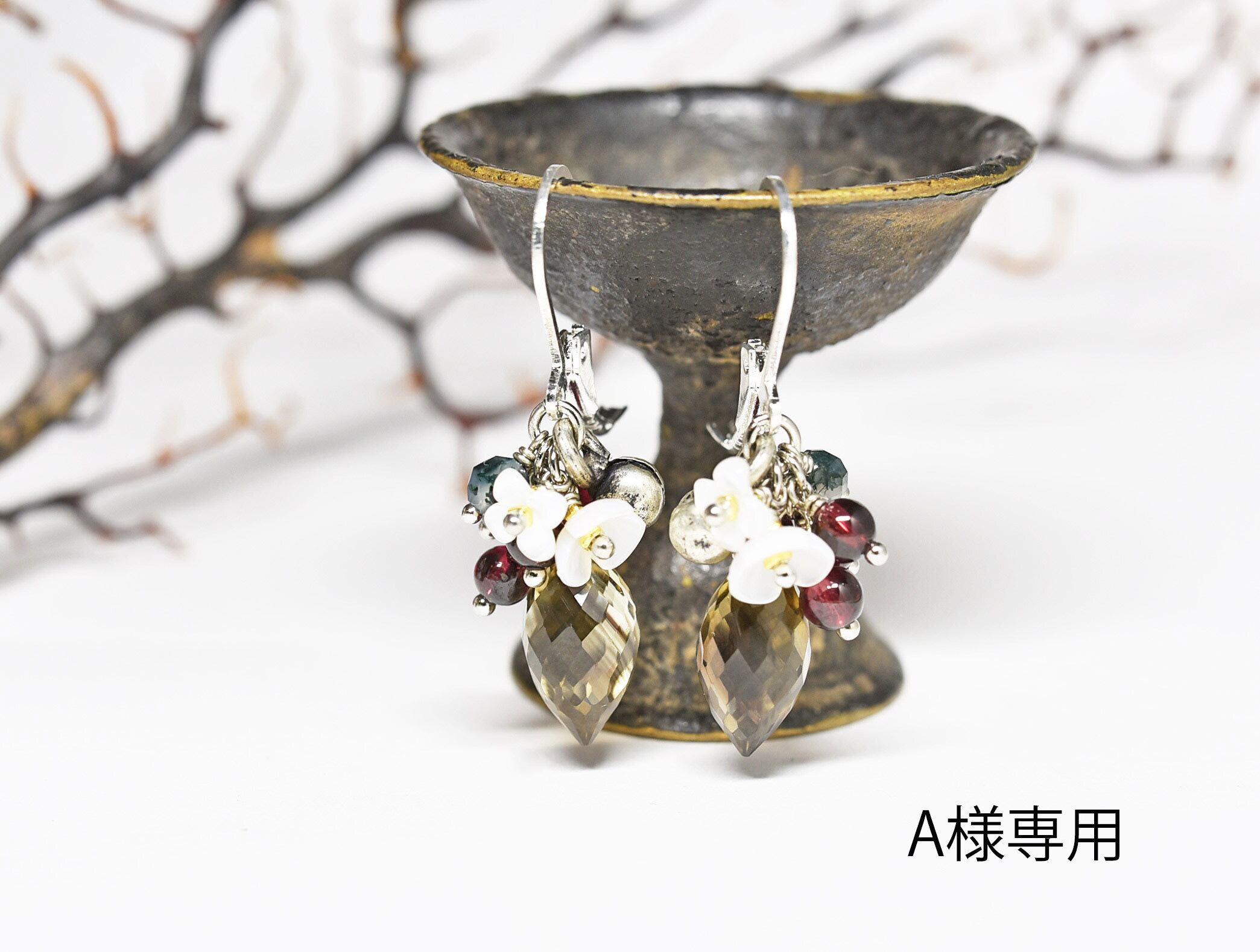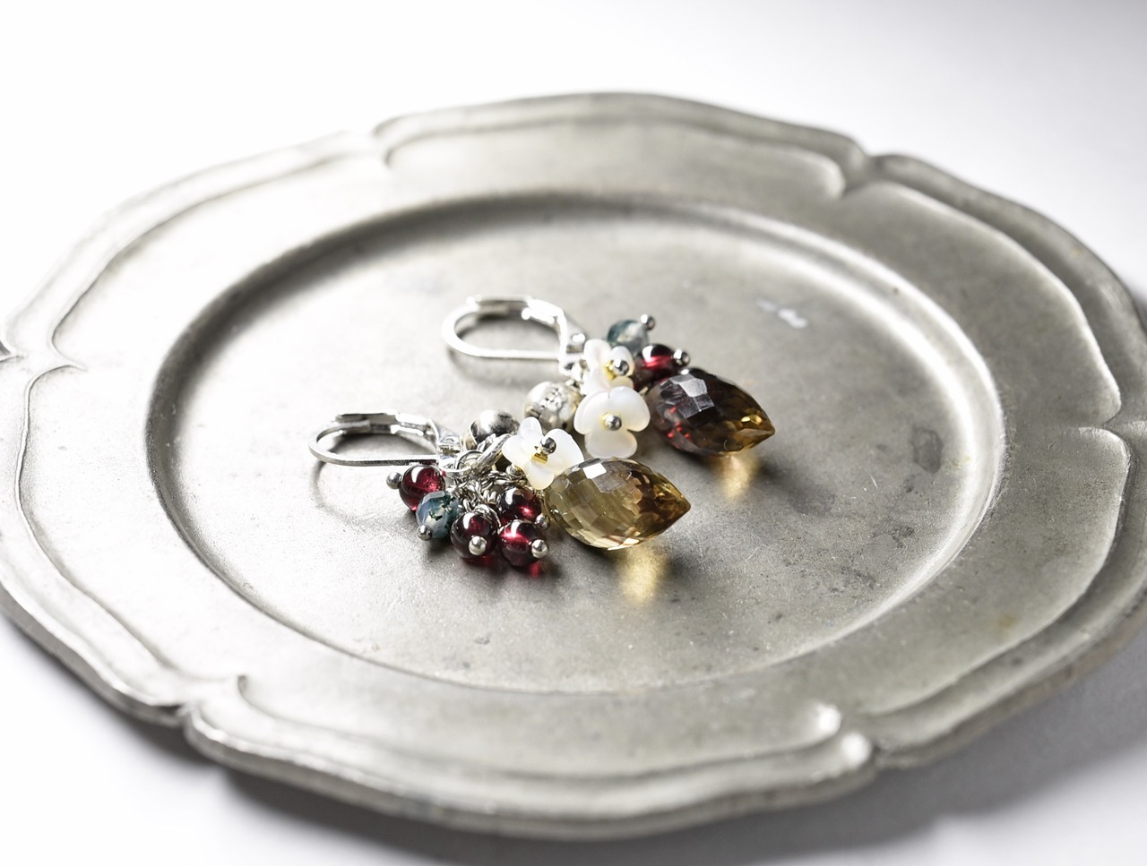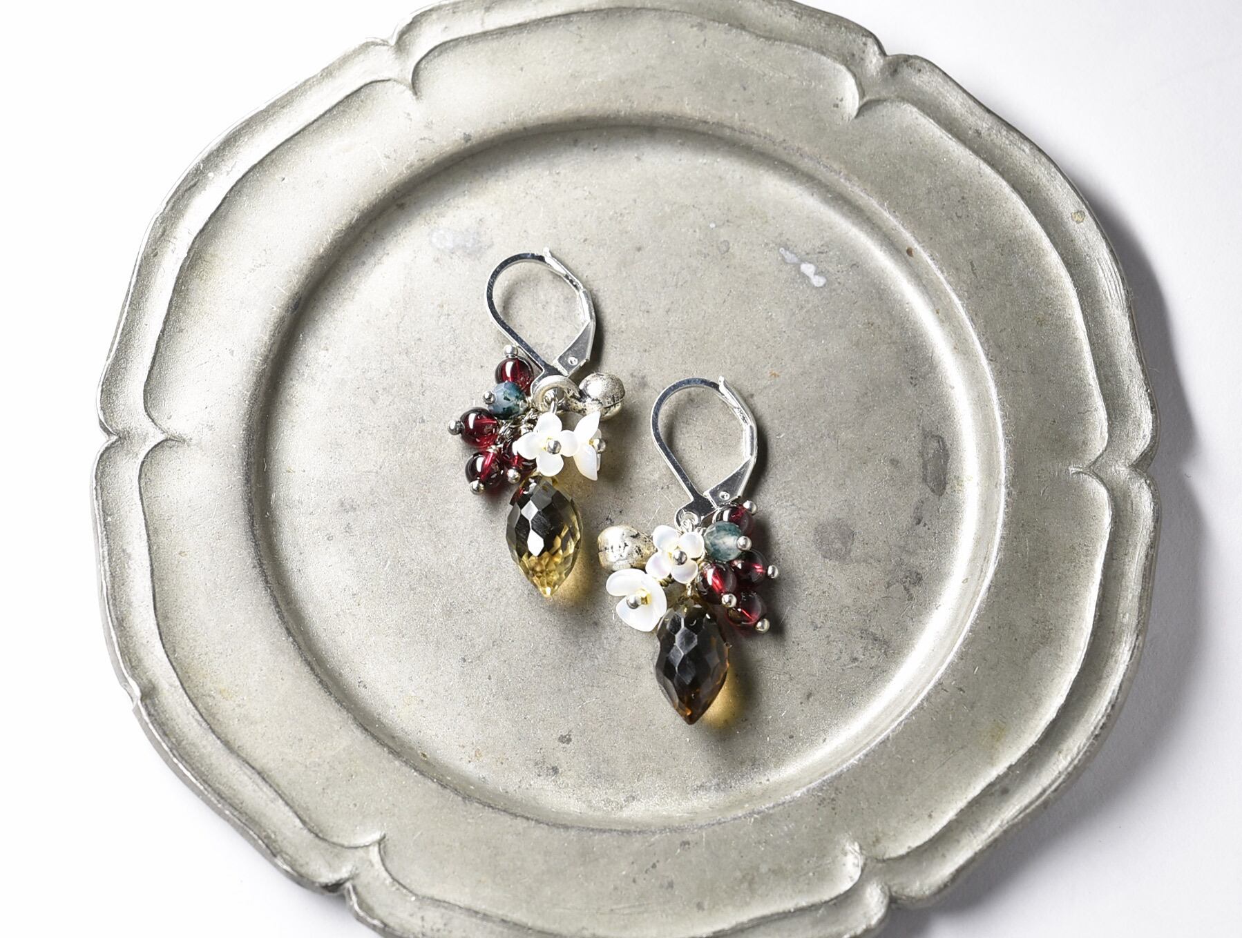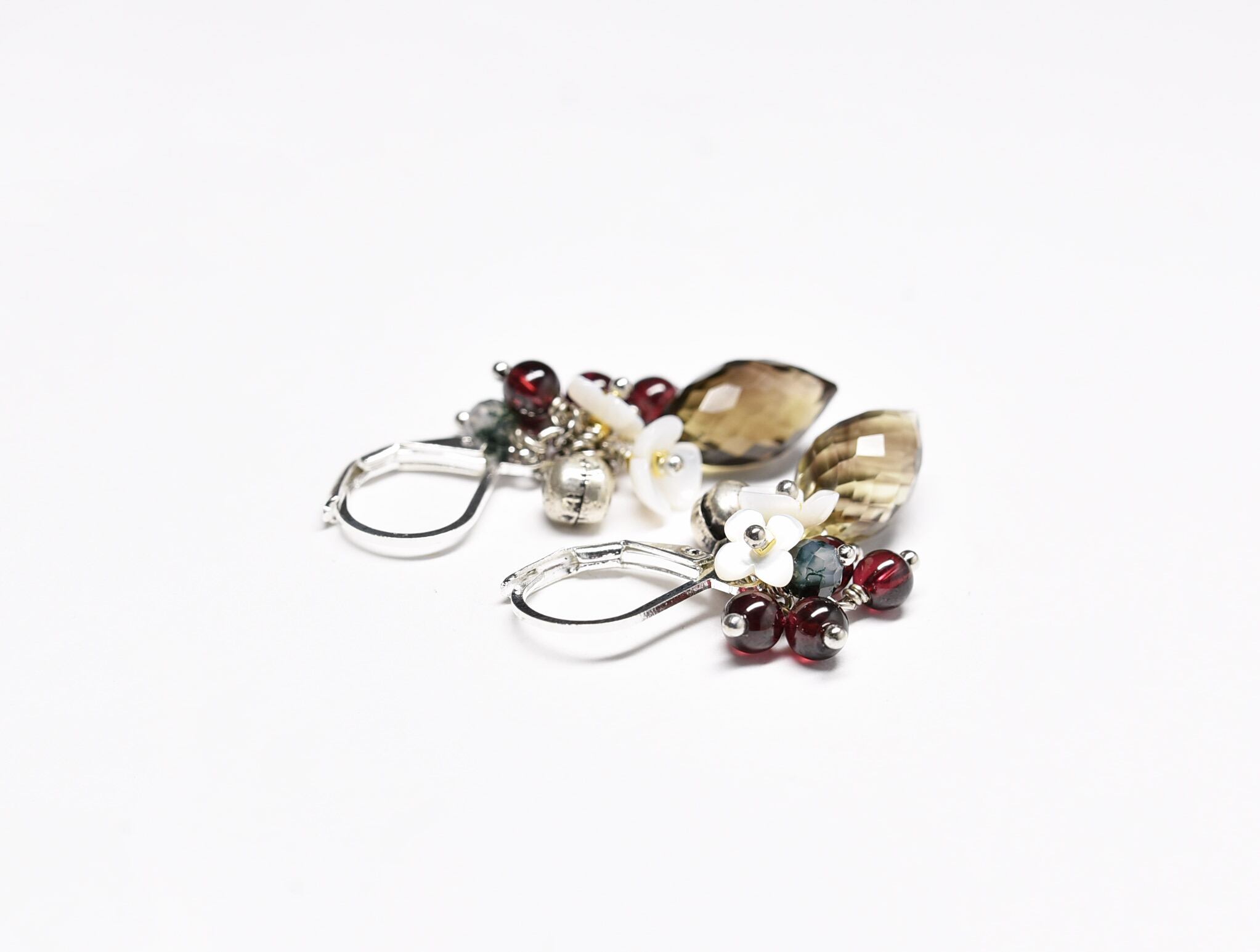 スモーキークォーツとたわわなガーネット、白蝶貝の小花、モスアゲート、小さな鈴を繋いだピアスです。