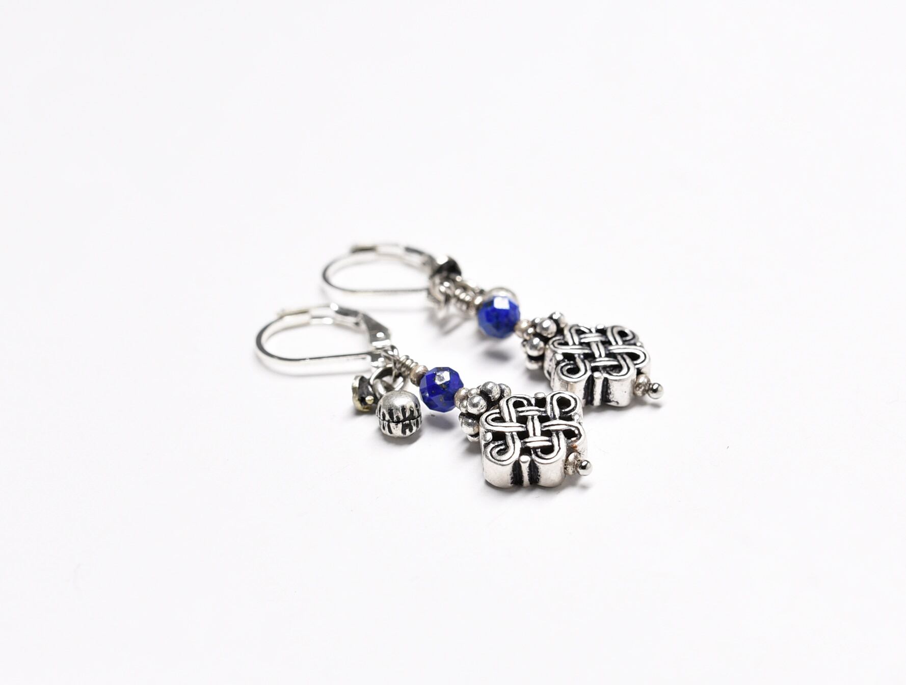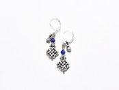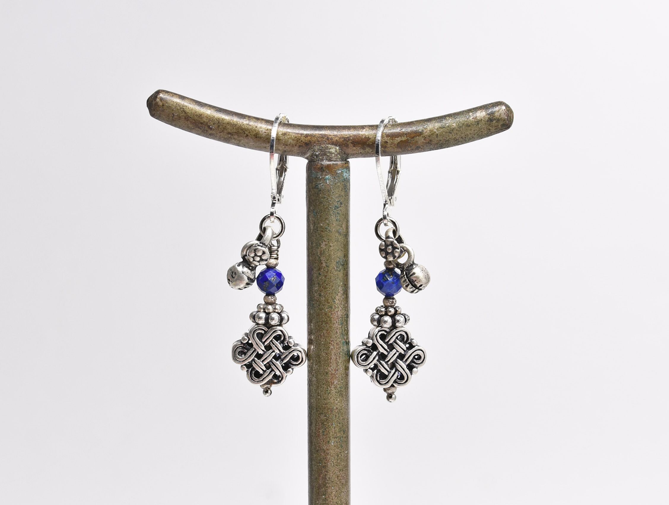 シルバー色のエンドレスノットとラピス、花装飾インドシルバーの小さな鈴を繋いだピアスです。