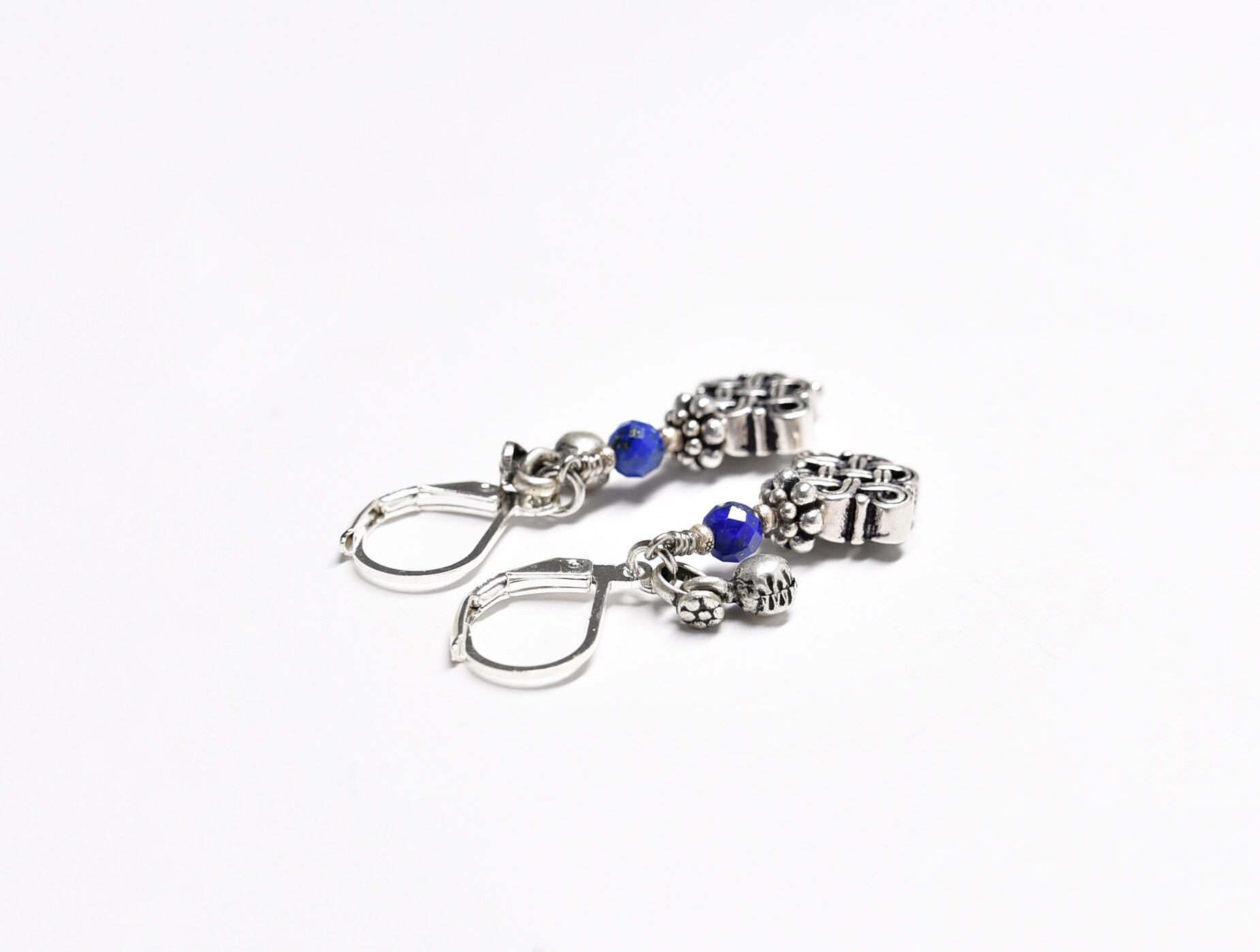 エンドレスノットとラピス、花装飾インドシルバーの小さな鈴のピアス