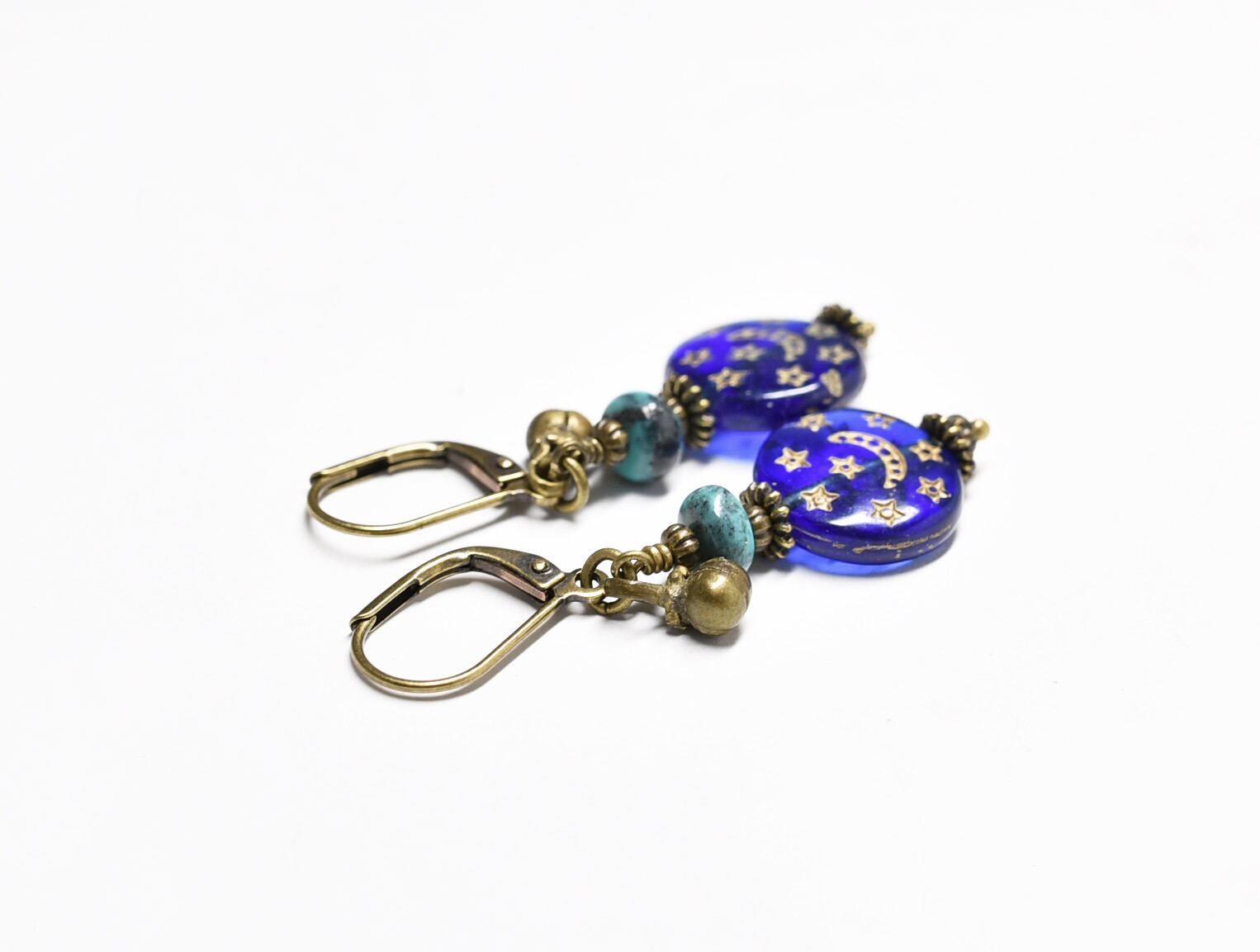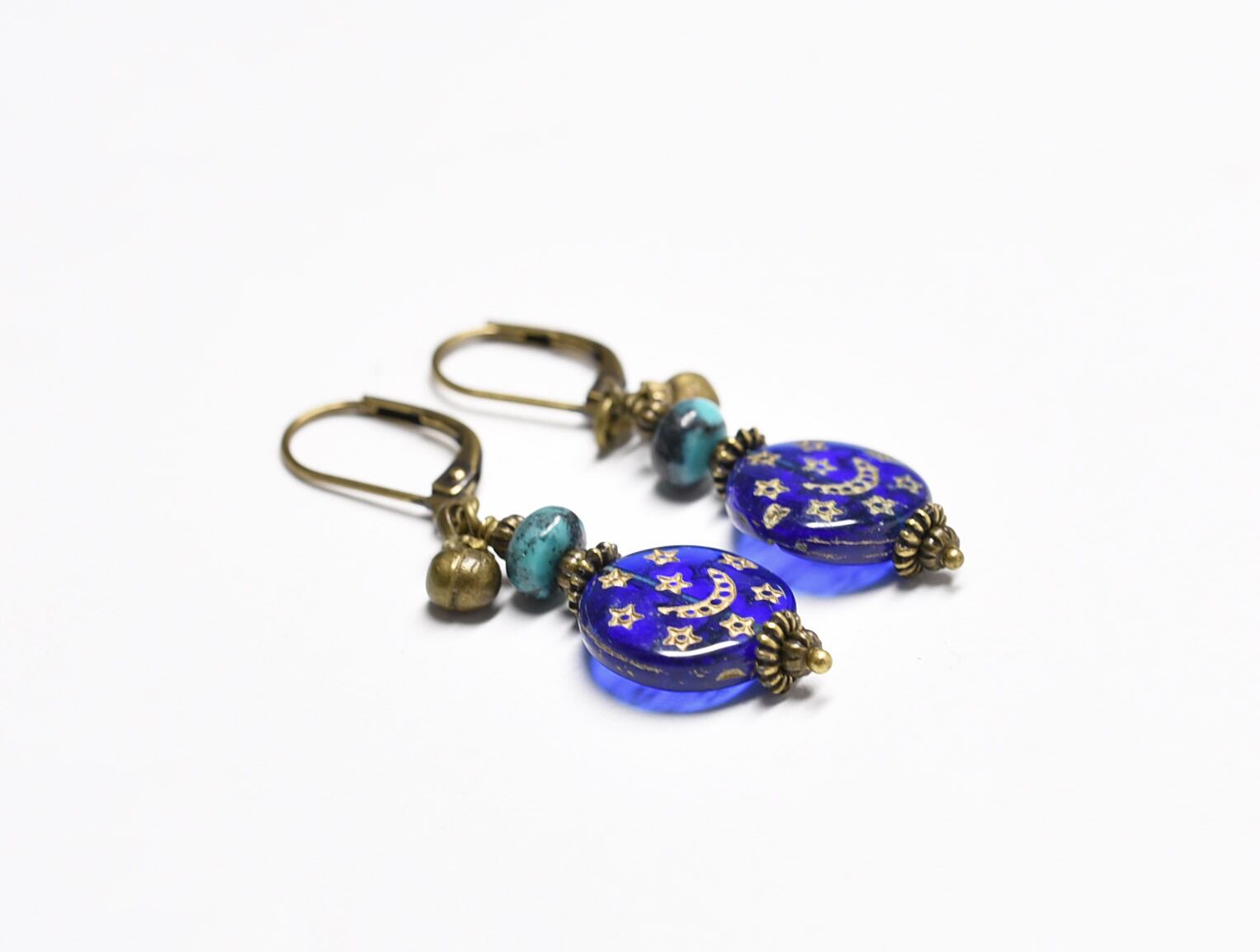 ブルー聖者のビーズとターコイズ、民族鈴のピアス