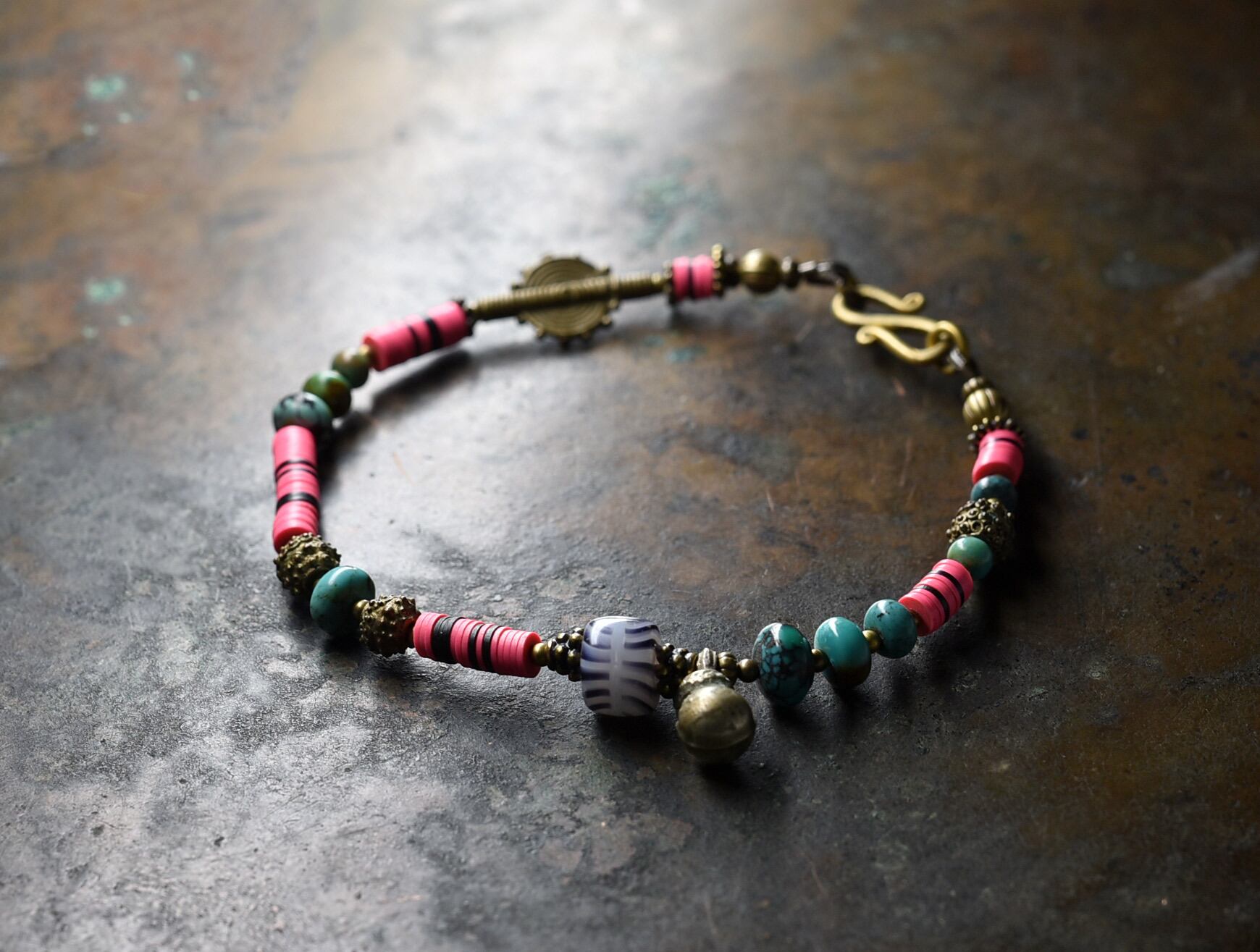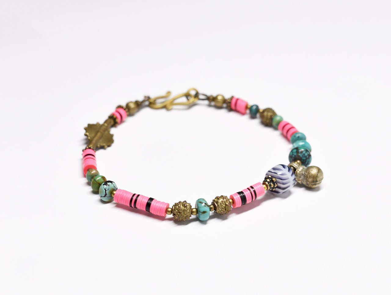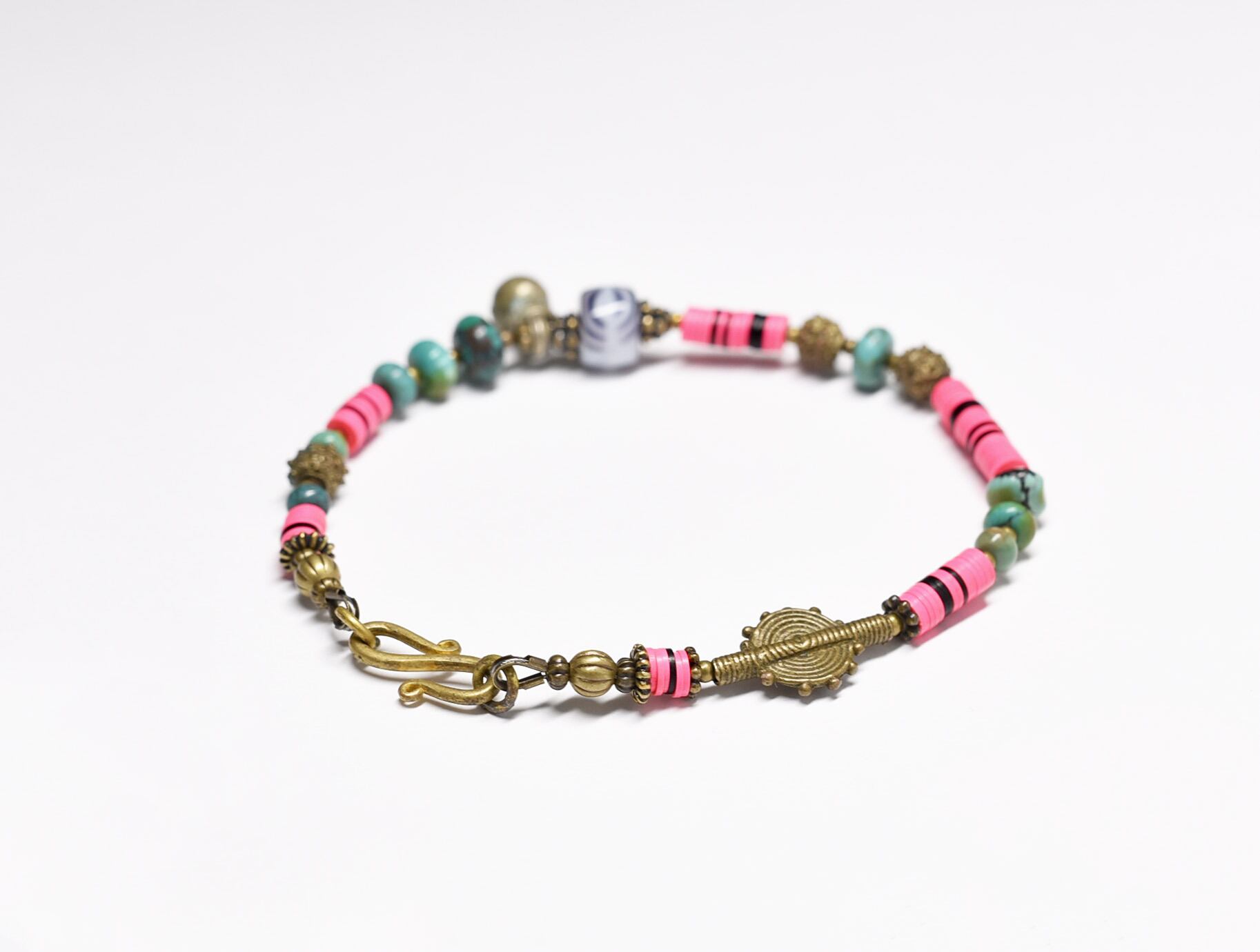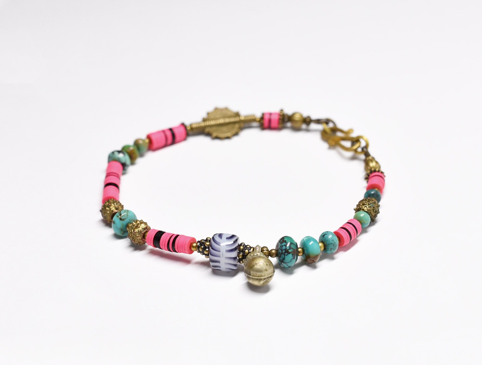ショッキングピンクレコード盤とゼブラ柄ヴィンテージビーズ、ターコイズ、民族ブラスと鈴のブレス