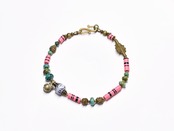 レコード盤と蓮華ブラス、ブラ柄ヴィンテージビーズ、ターコイズ、民族ブラスと鈴を繋いだブレスです。