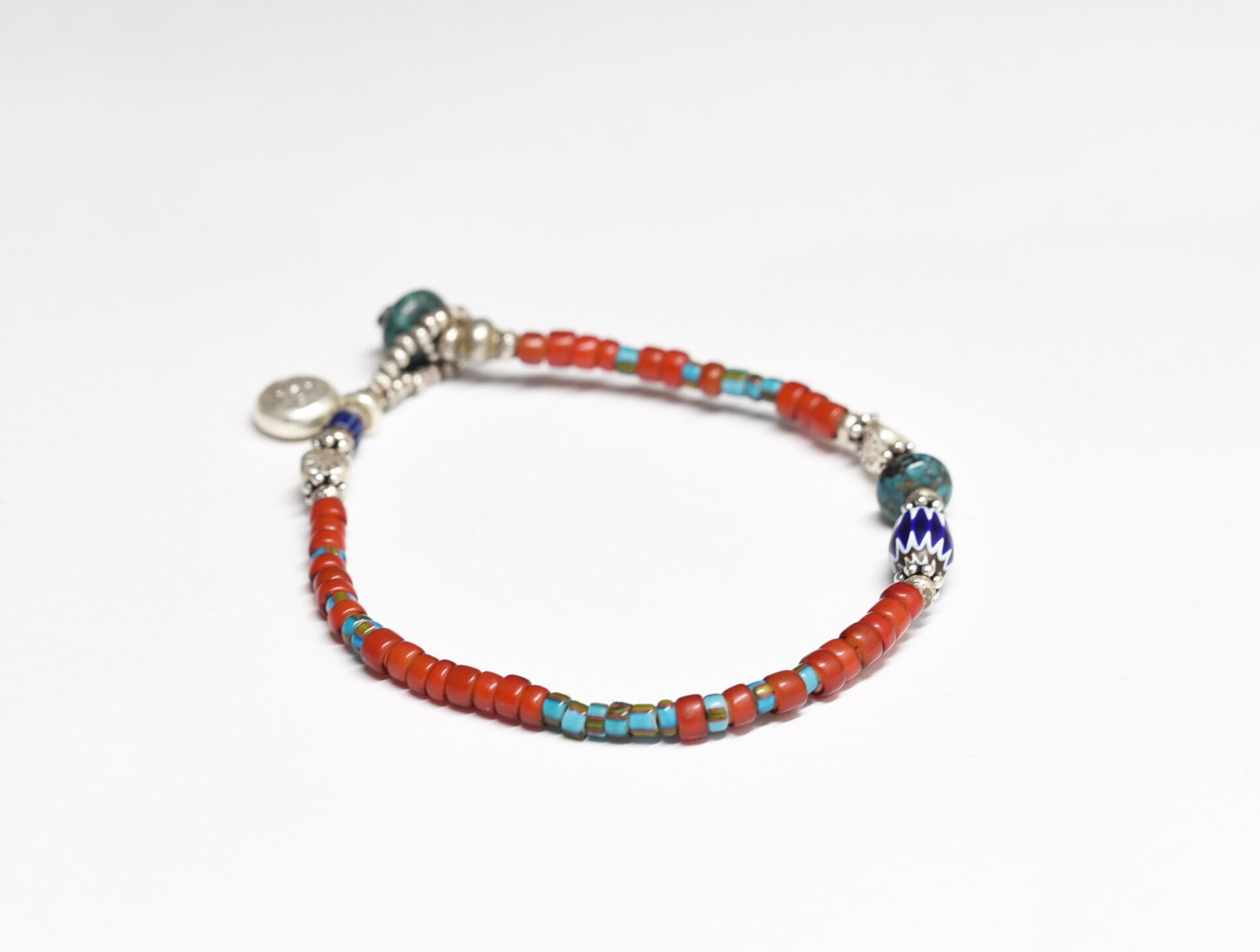 素材:ガラス、ターコイズ、カレンシルバー、インドシルバー、ロウビキ紐