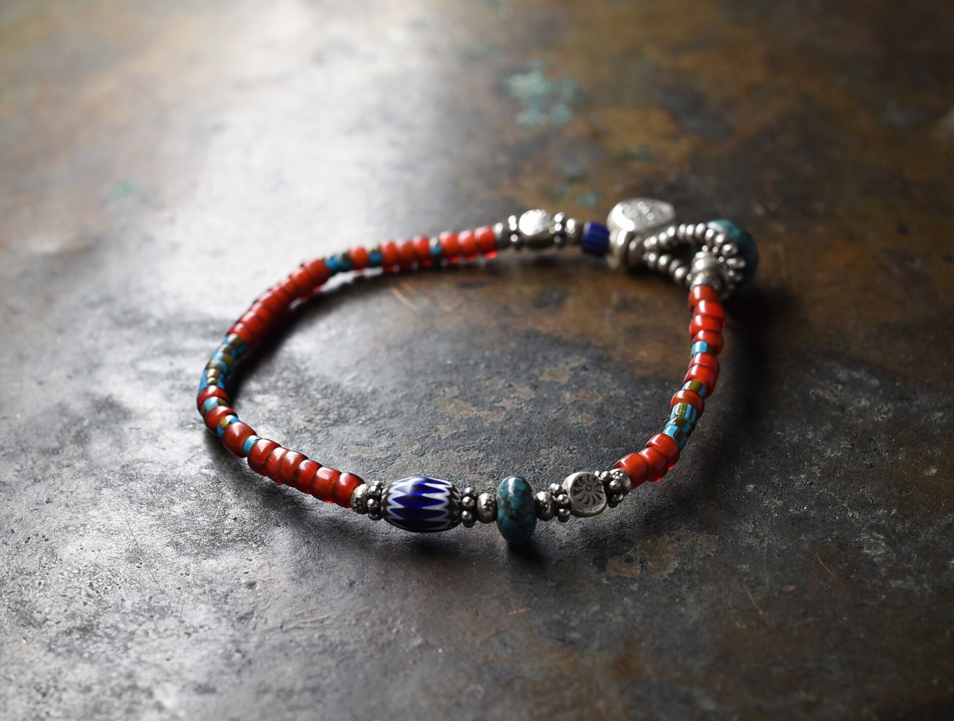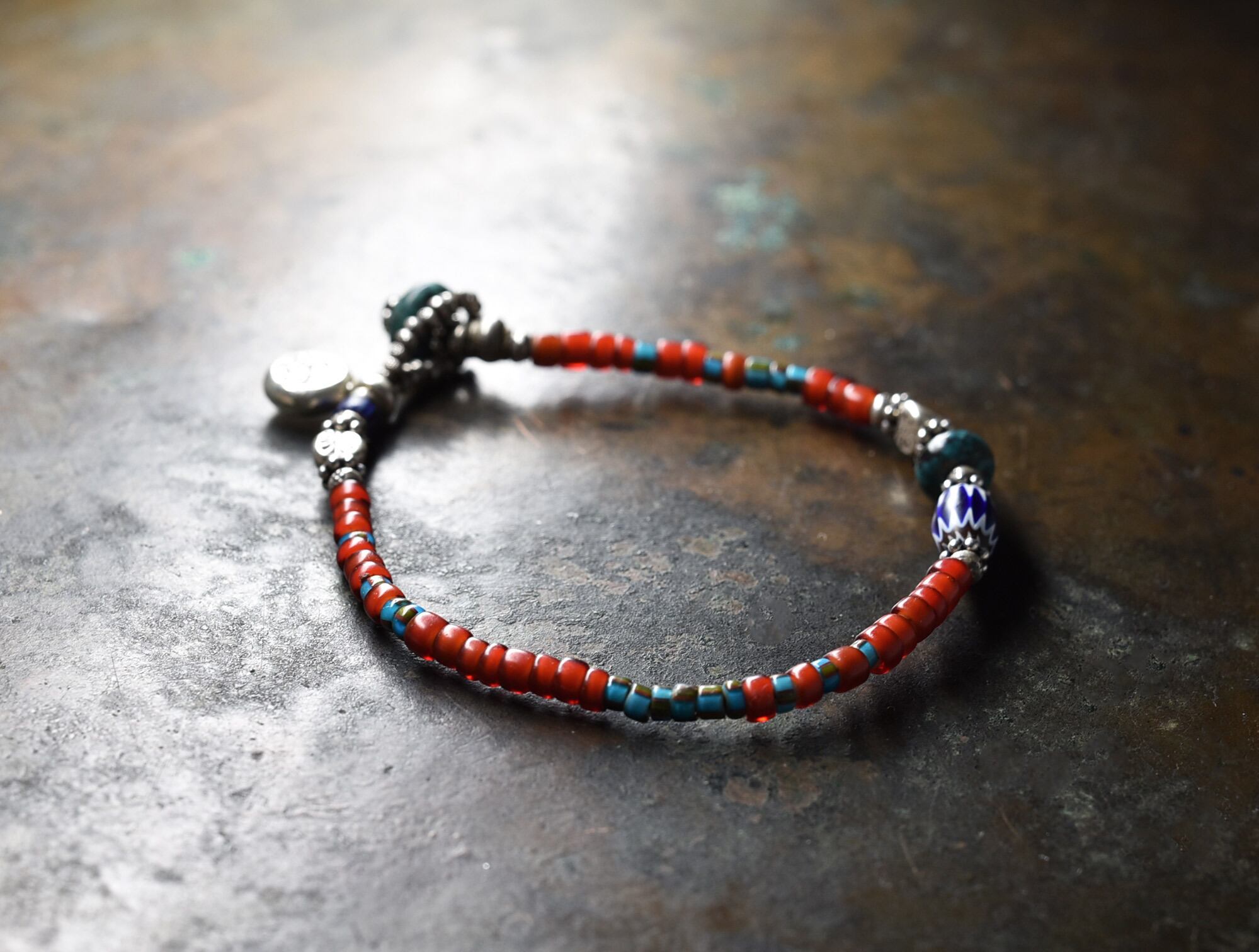 シェブロンビーズなどを挟んでいる花形のシルバービーズはインドシルバーです。