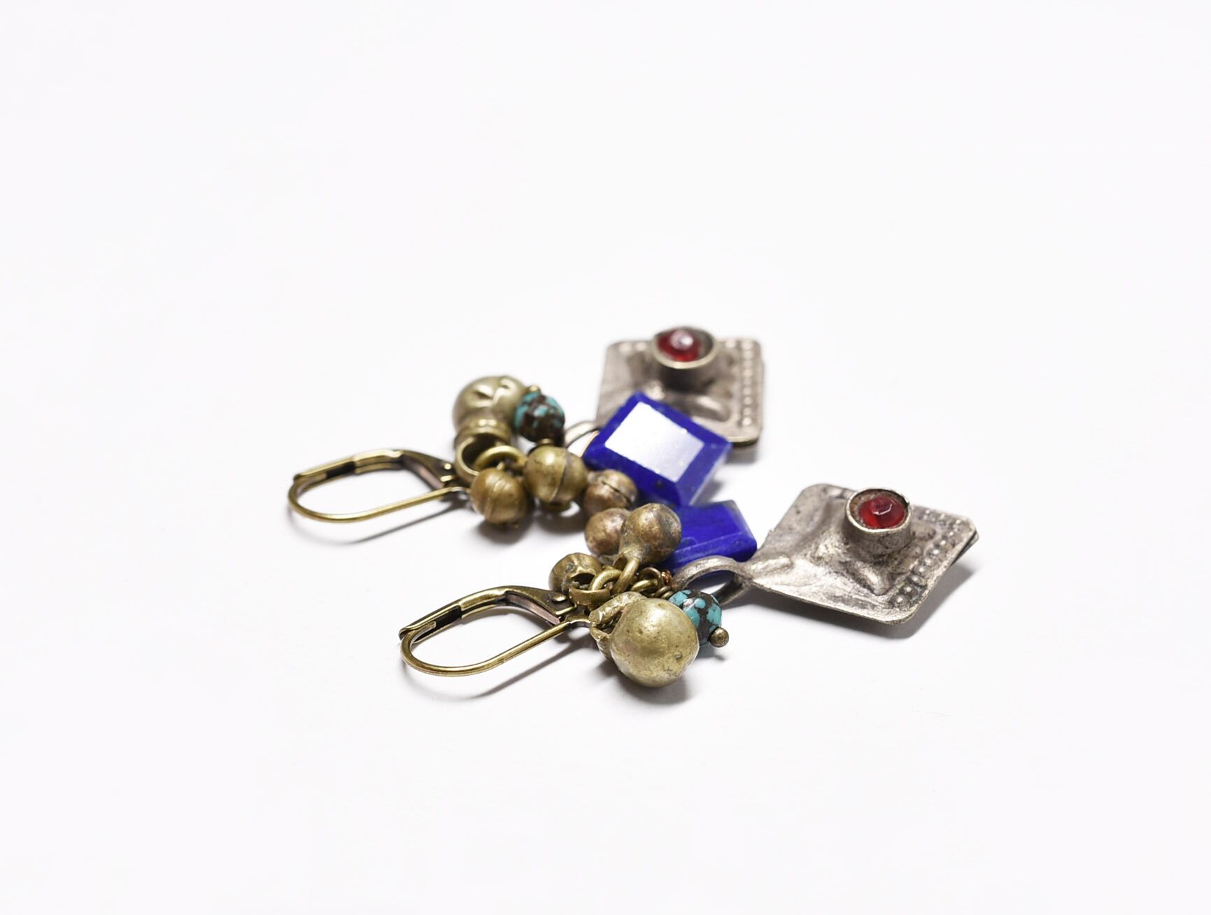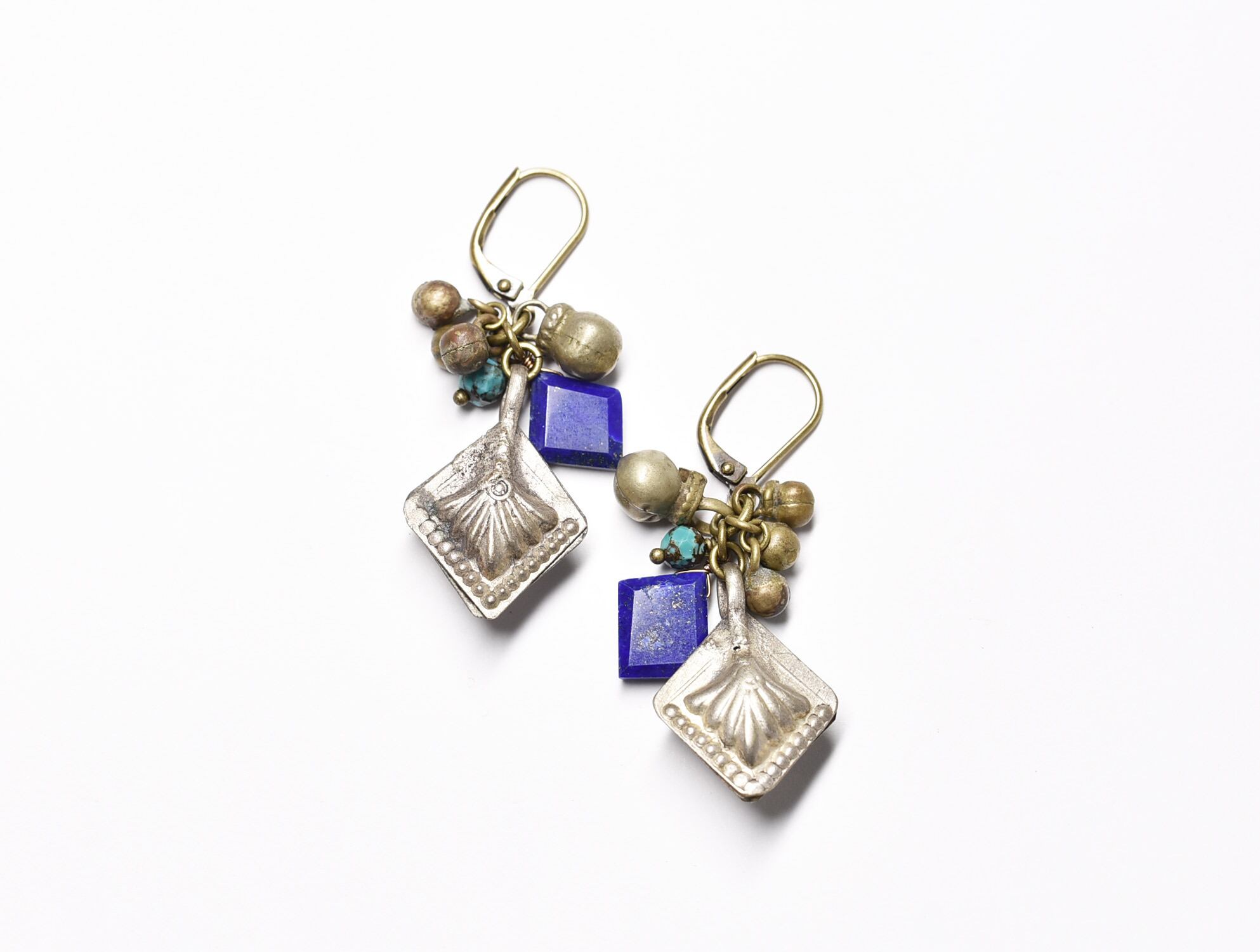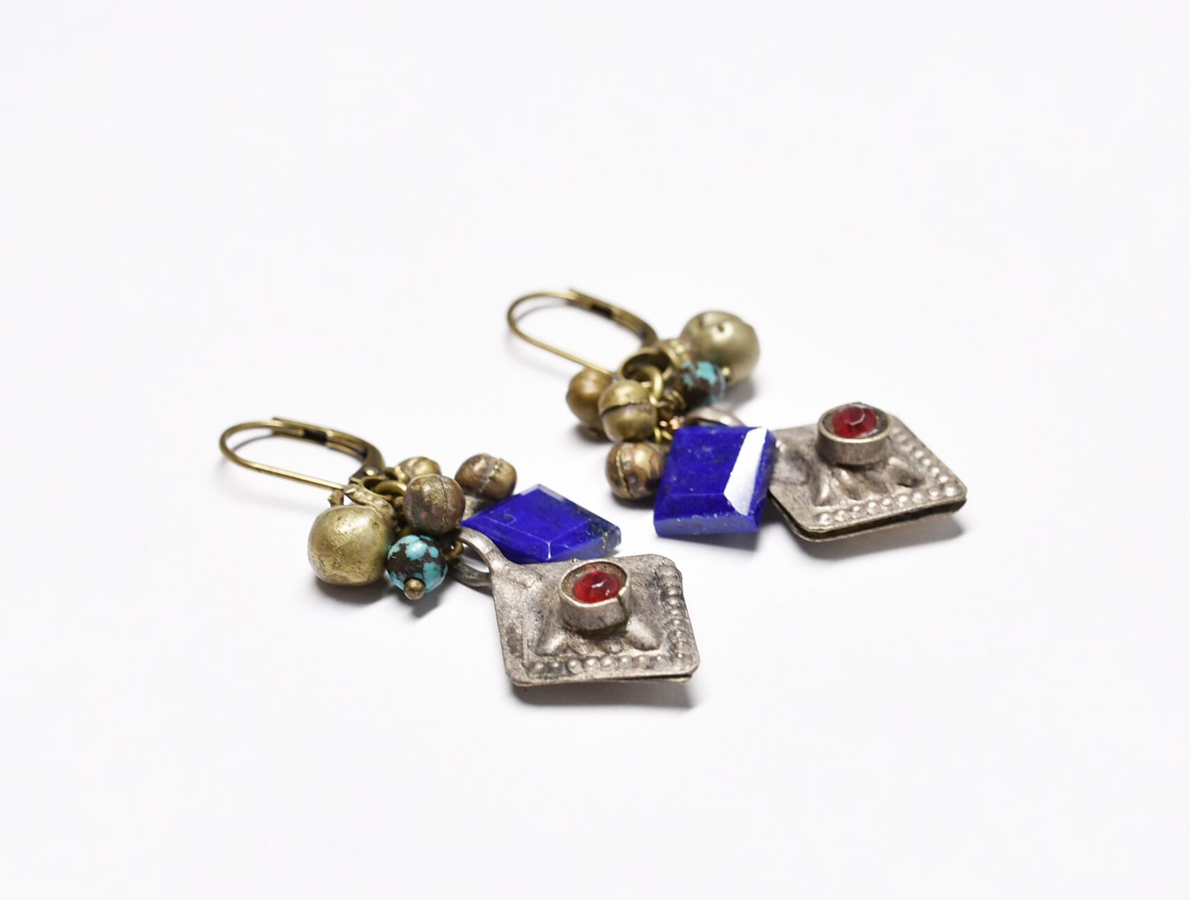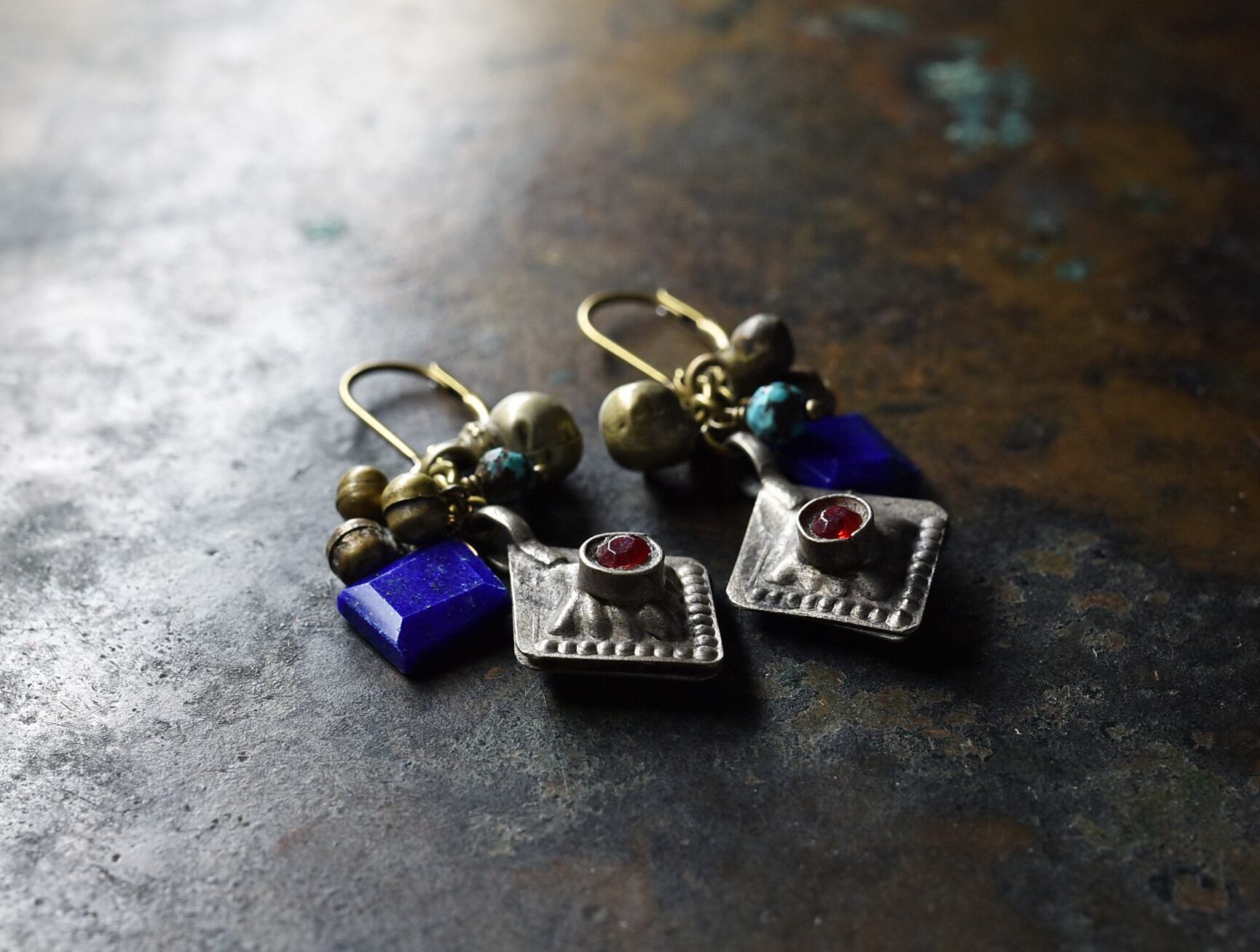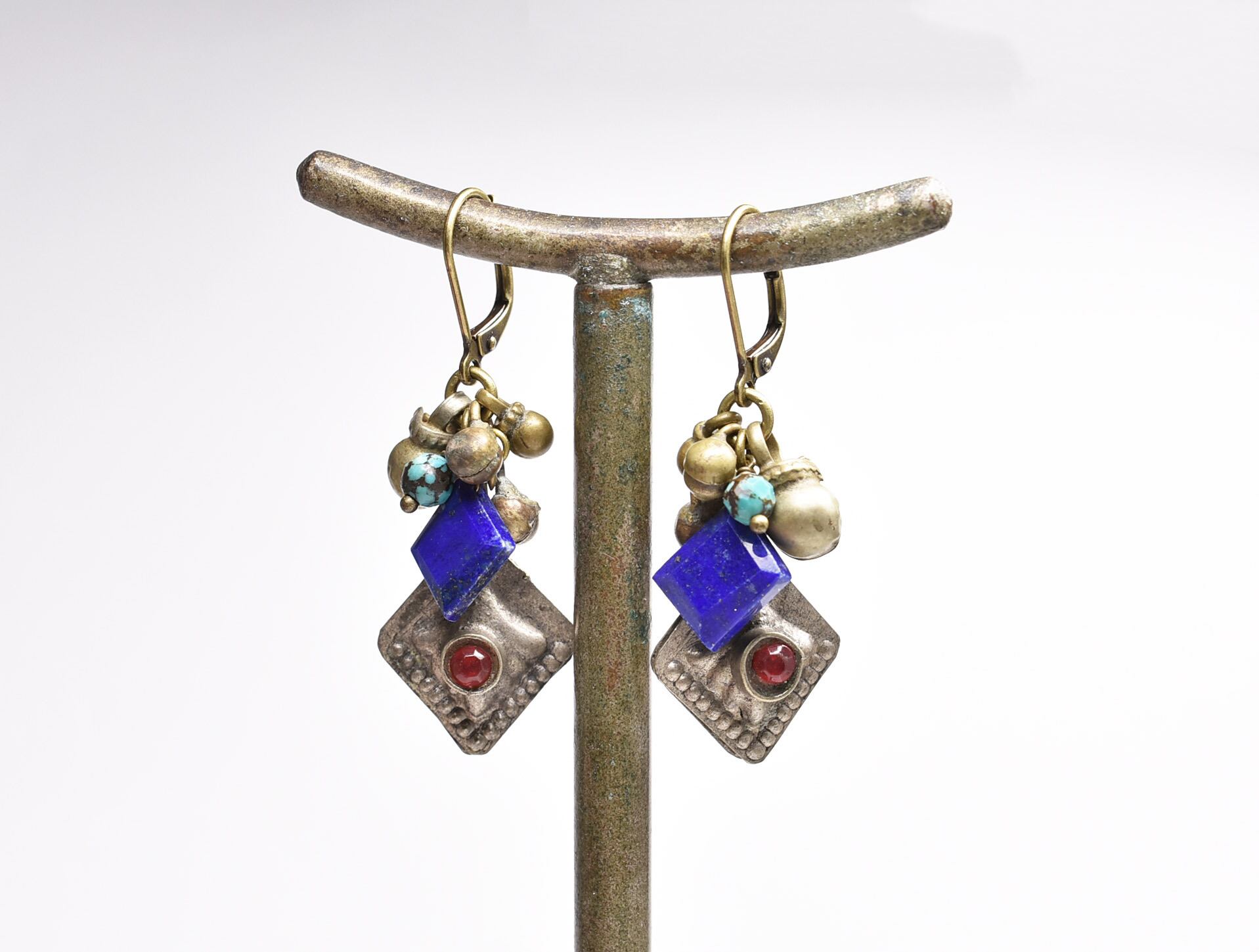 クチ族メタルパーツと民族鈴、ラピス、ターコイズのピアス(再販)