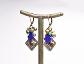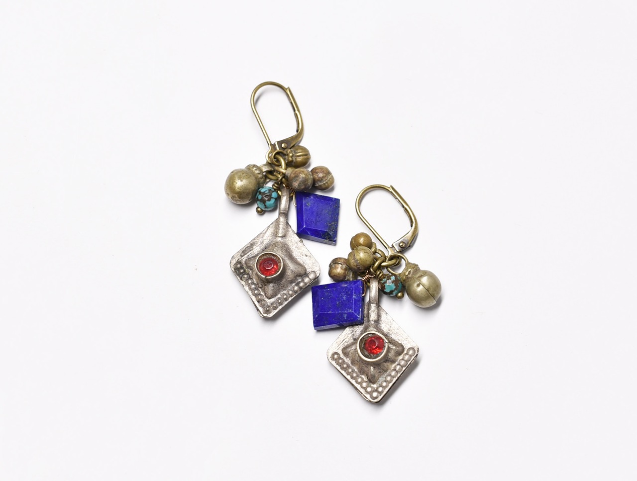 クチ族メタルパーツと民族鈴、ラピス、ターコイズを繋いだピアスです。