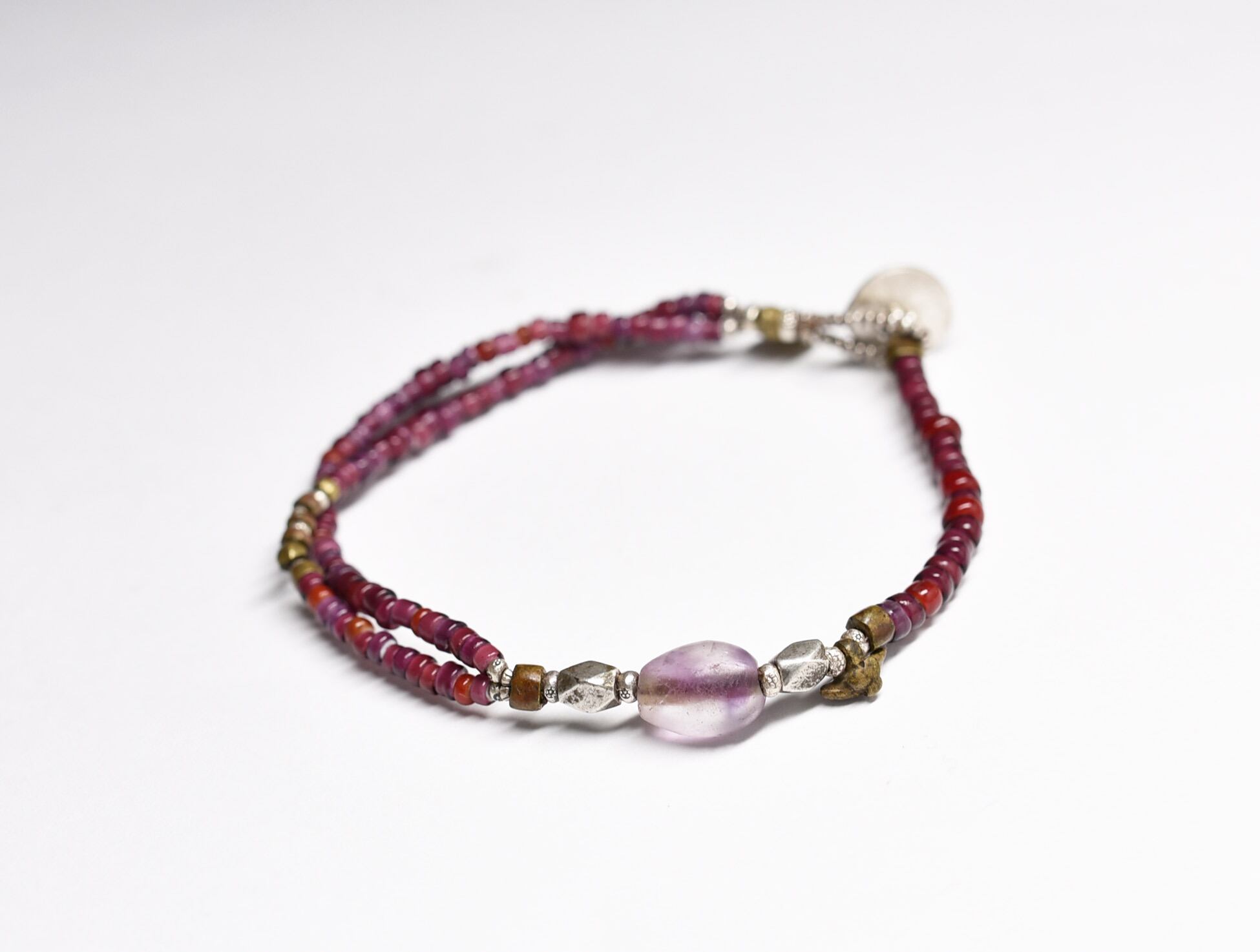 古代アメジストと小さなホワイトハーツ、oldチンシルバー、oldオリッサブラスを繋いだ2連のブレスです。