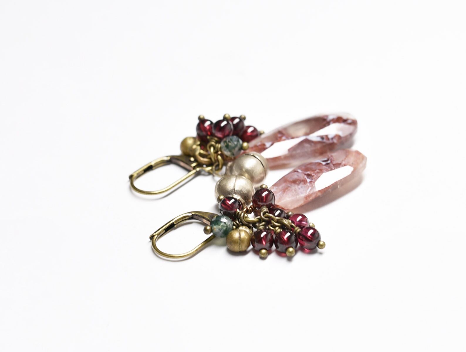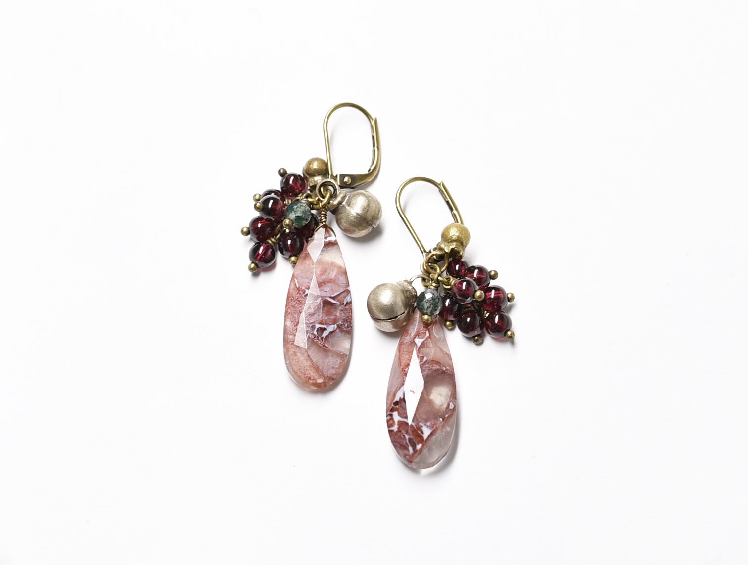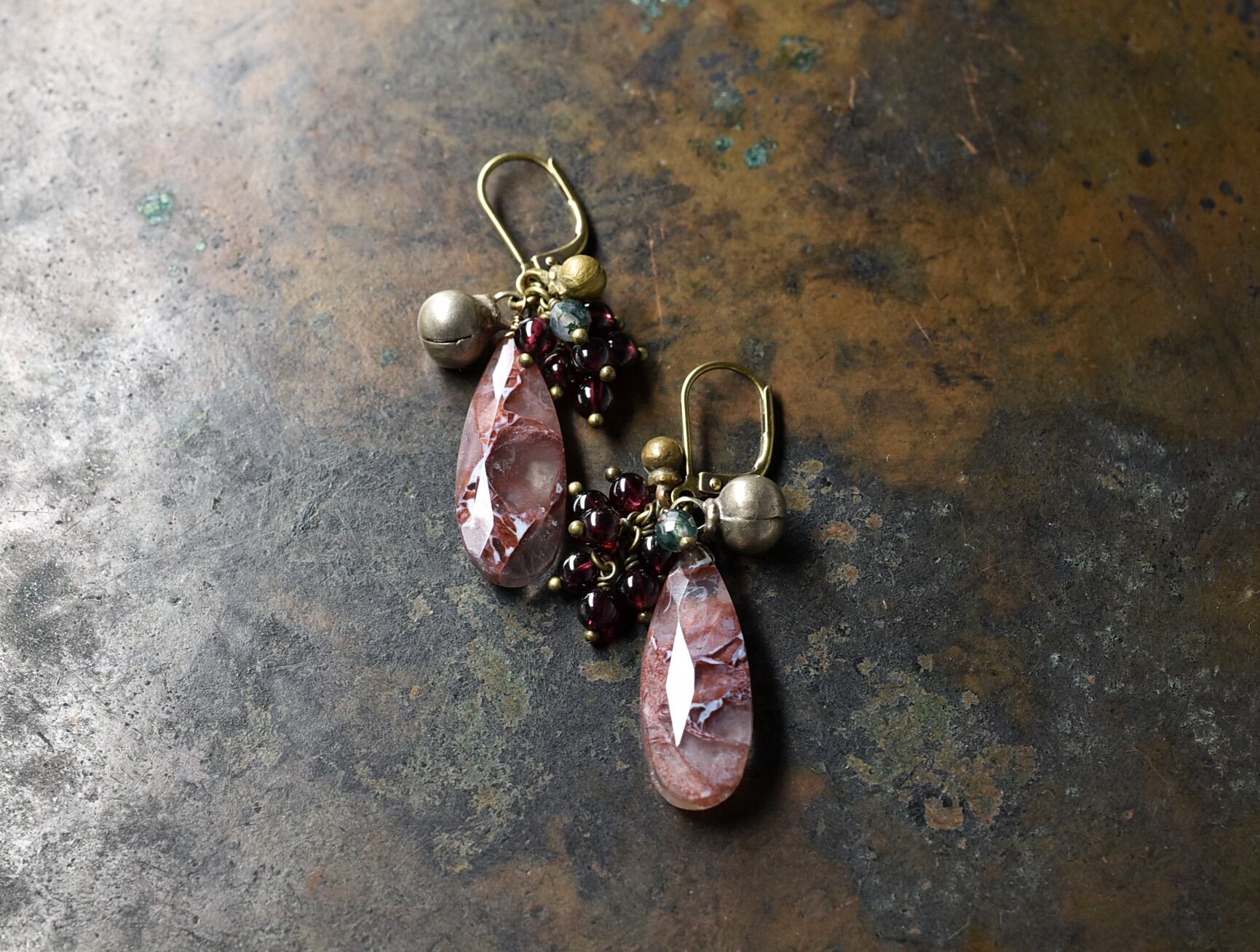 アゲートインクォーツとたわわなガーネット、モスアゲートと民族鈴のピアス(濃)