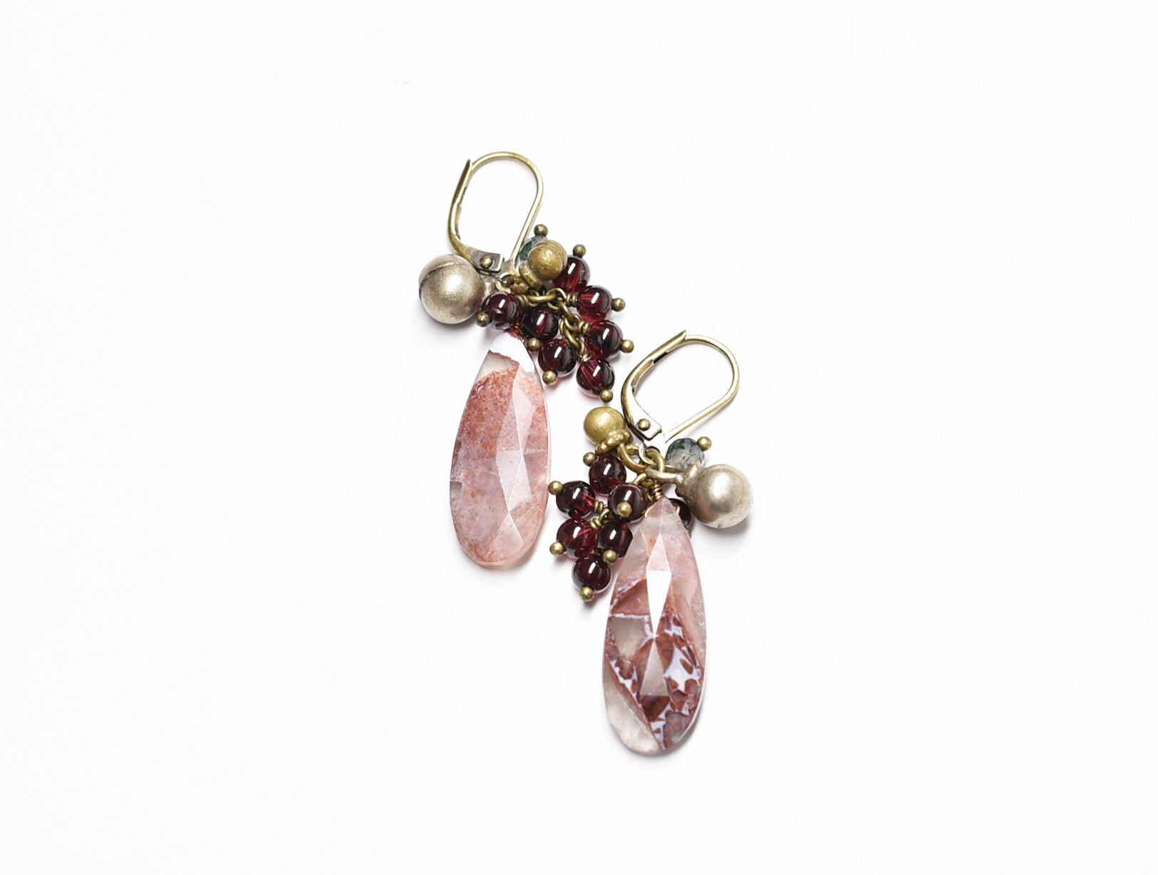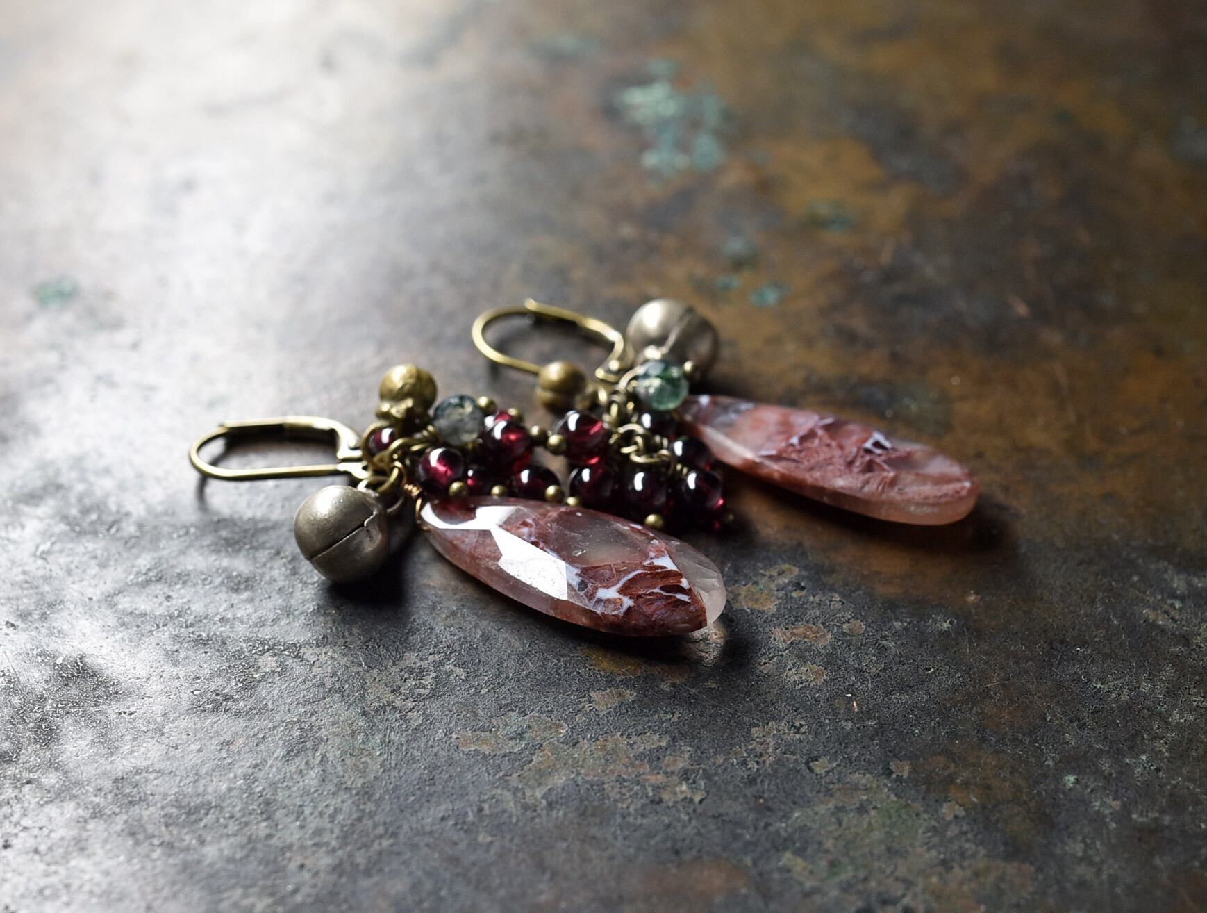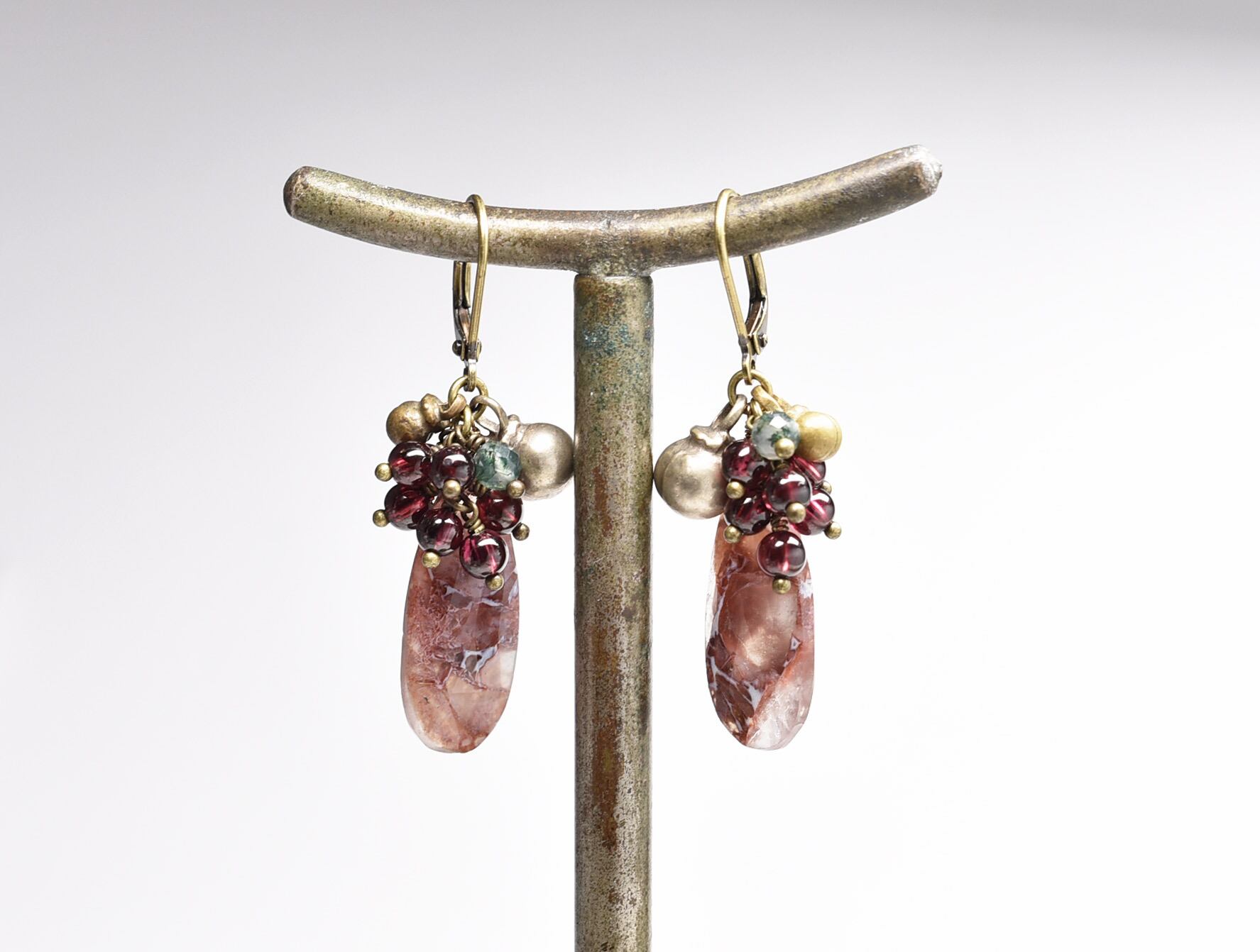 アゲートインクォーツとたわわなガーネット、モスアゲートと民族鈴のピアス(濃)