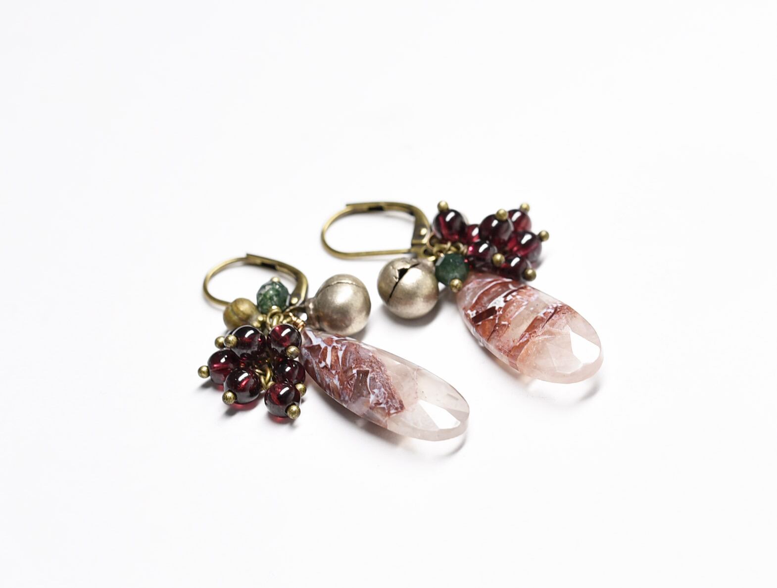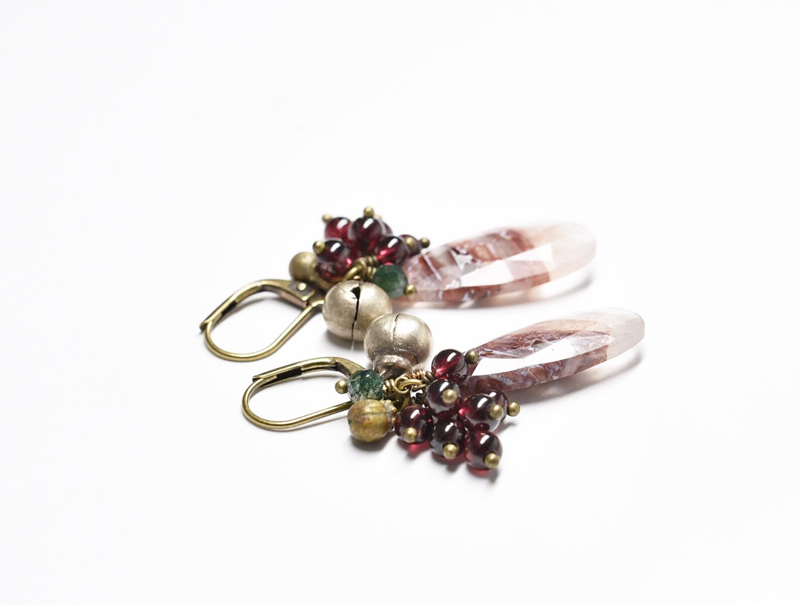 アゲートインクォーツとたわわなガーネット、モスアゲートと民族鈴を繋いだピアスです。