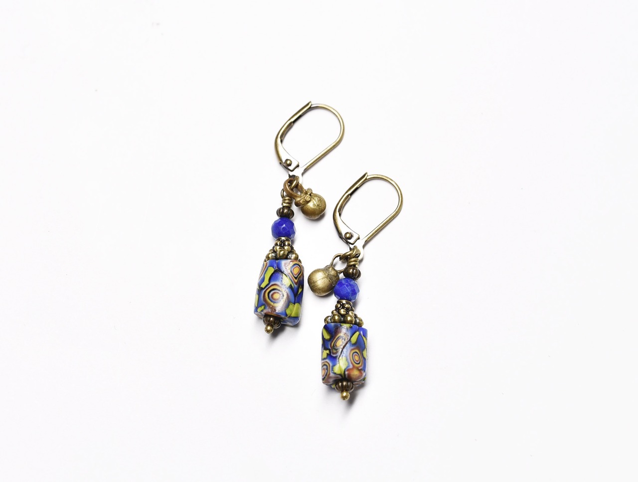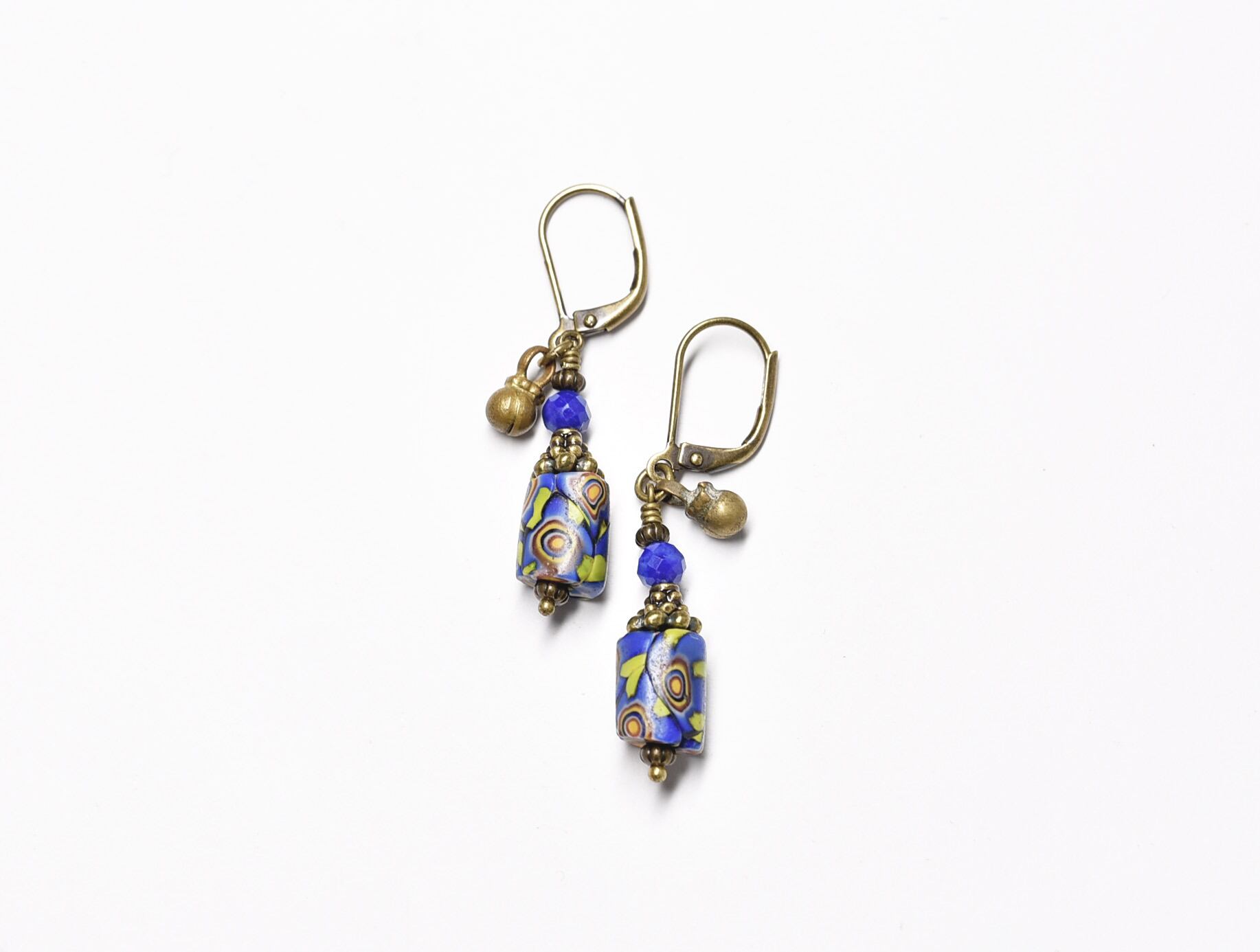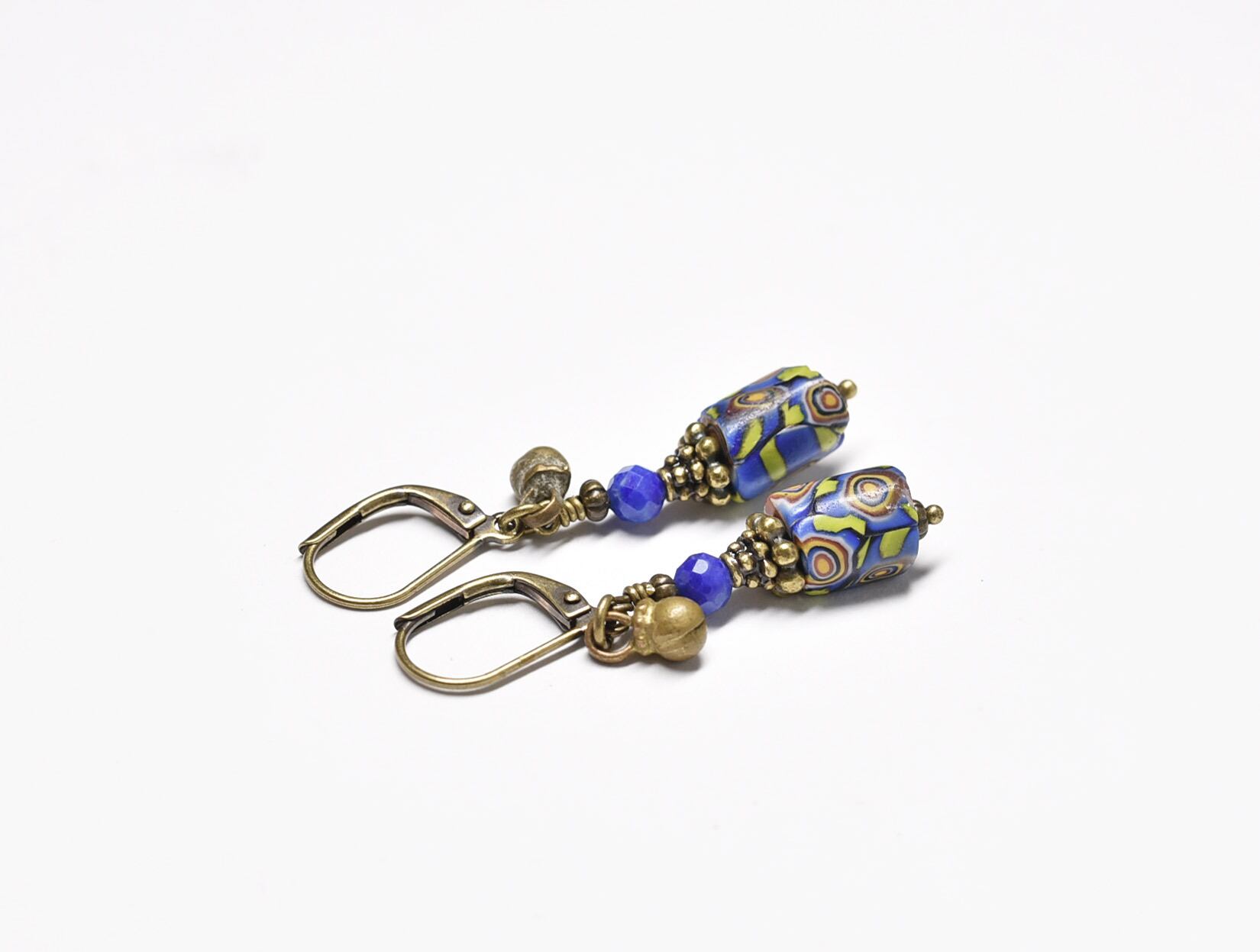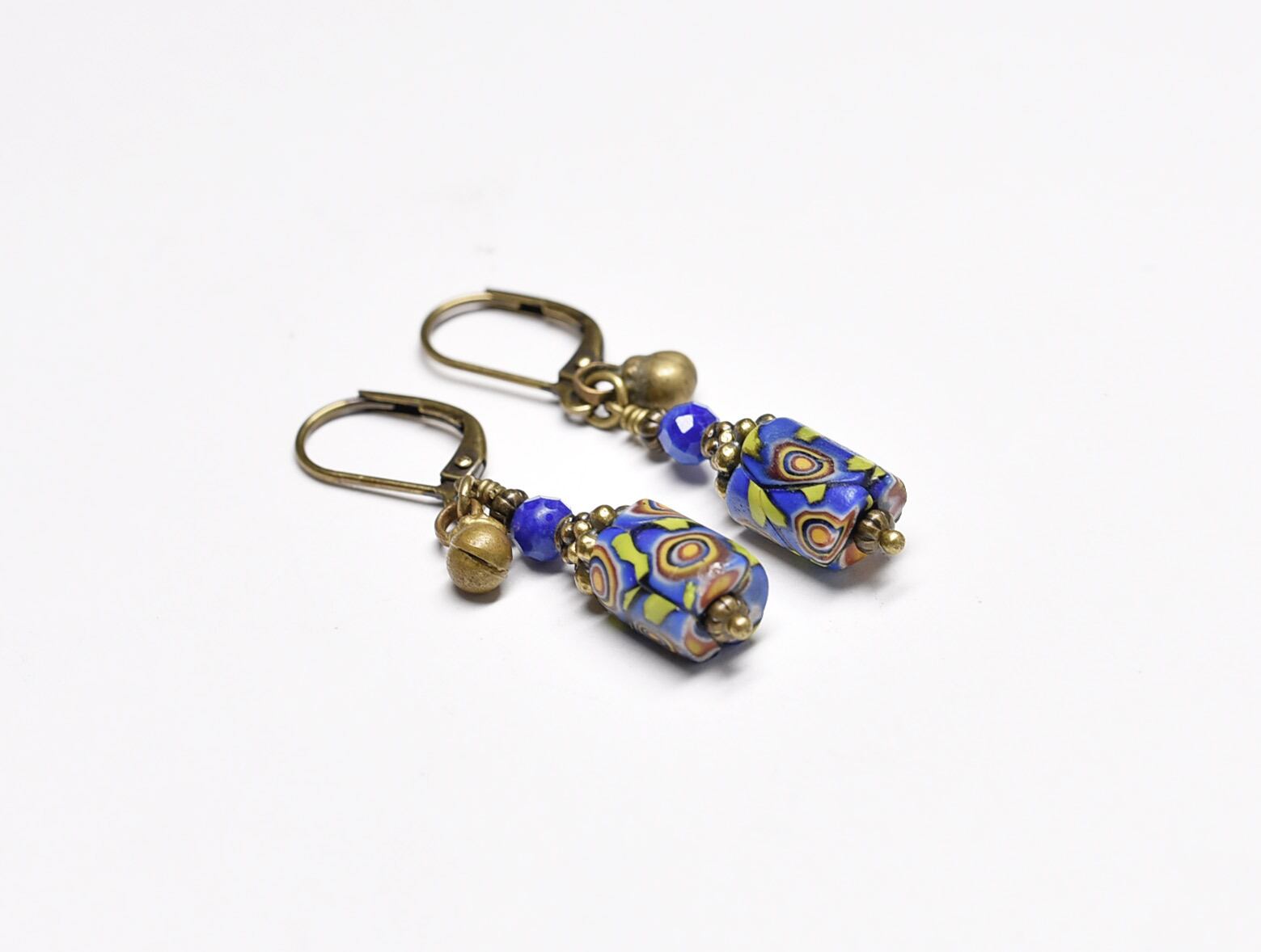 小さなミルフィオリビーズとラピスラズリ、民族鈴のピアス