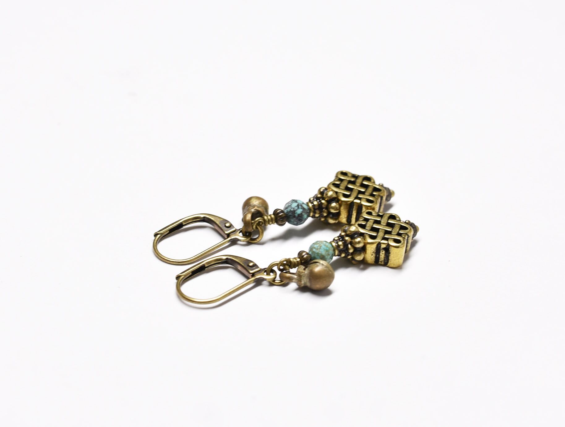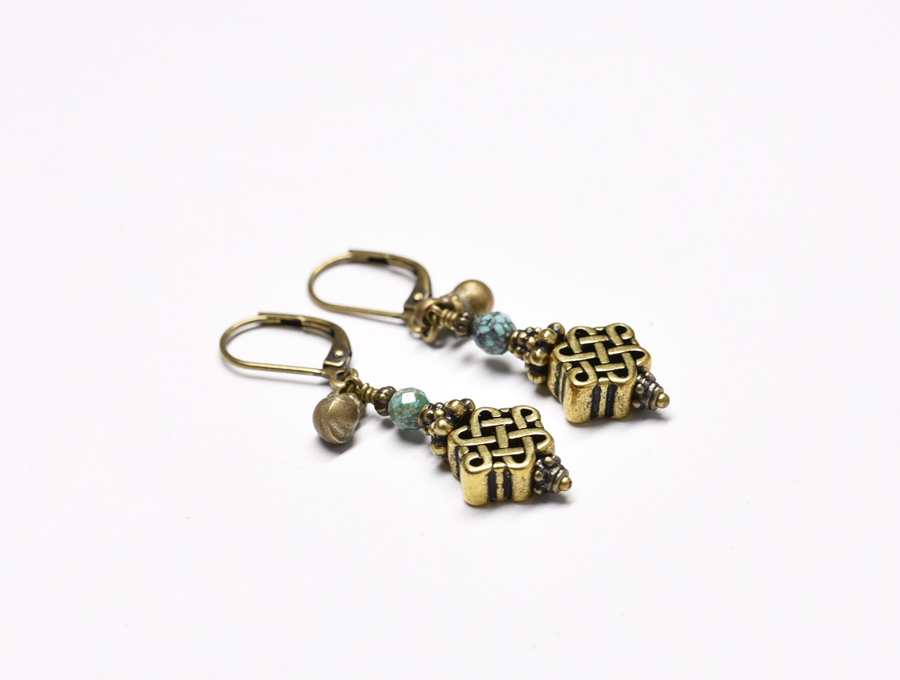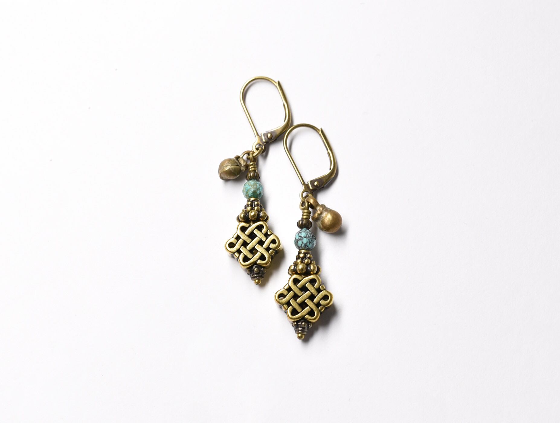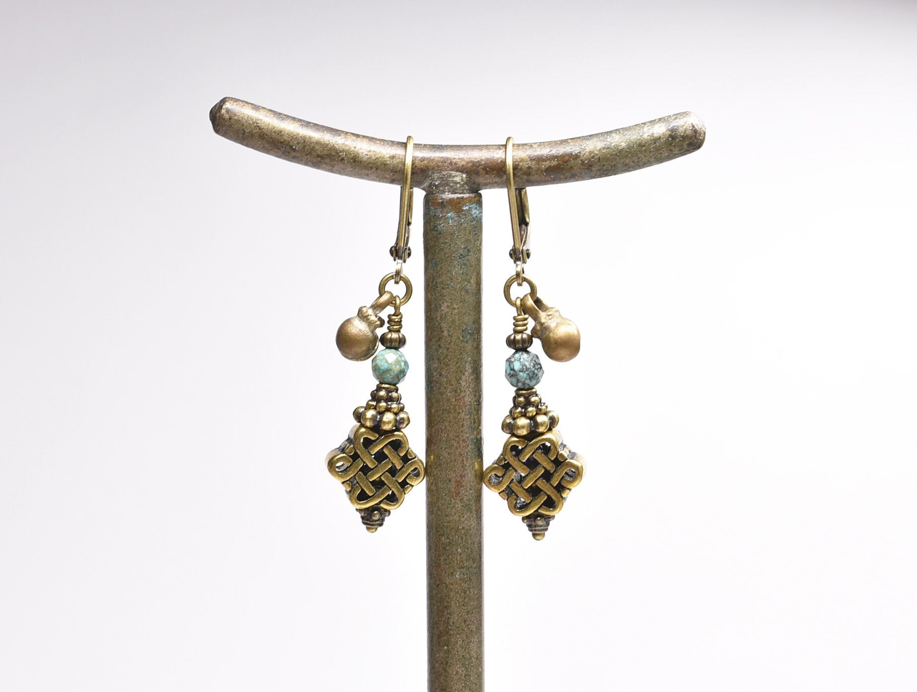 真鍮製のエンドレスノットと、ターコイズ、民族鈴を繋いだピアスです。