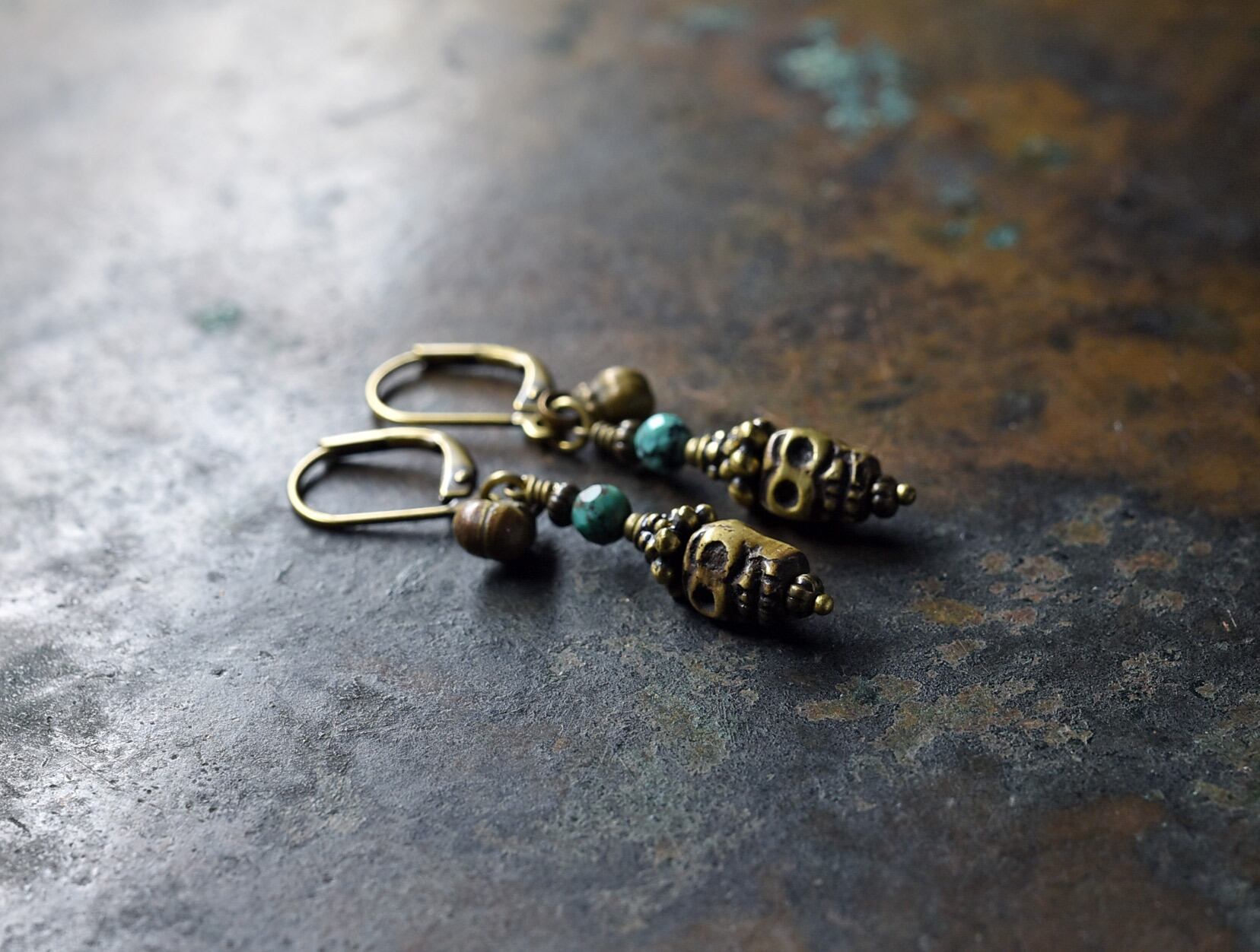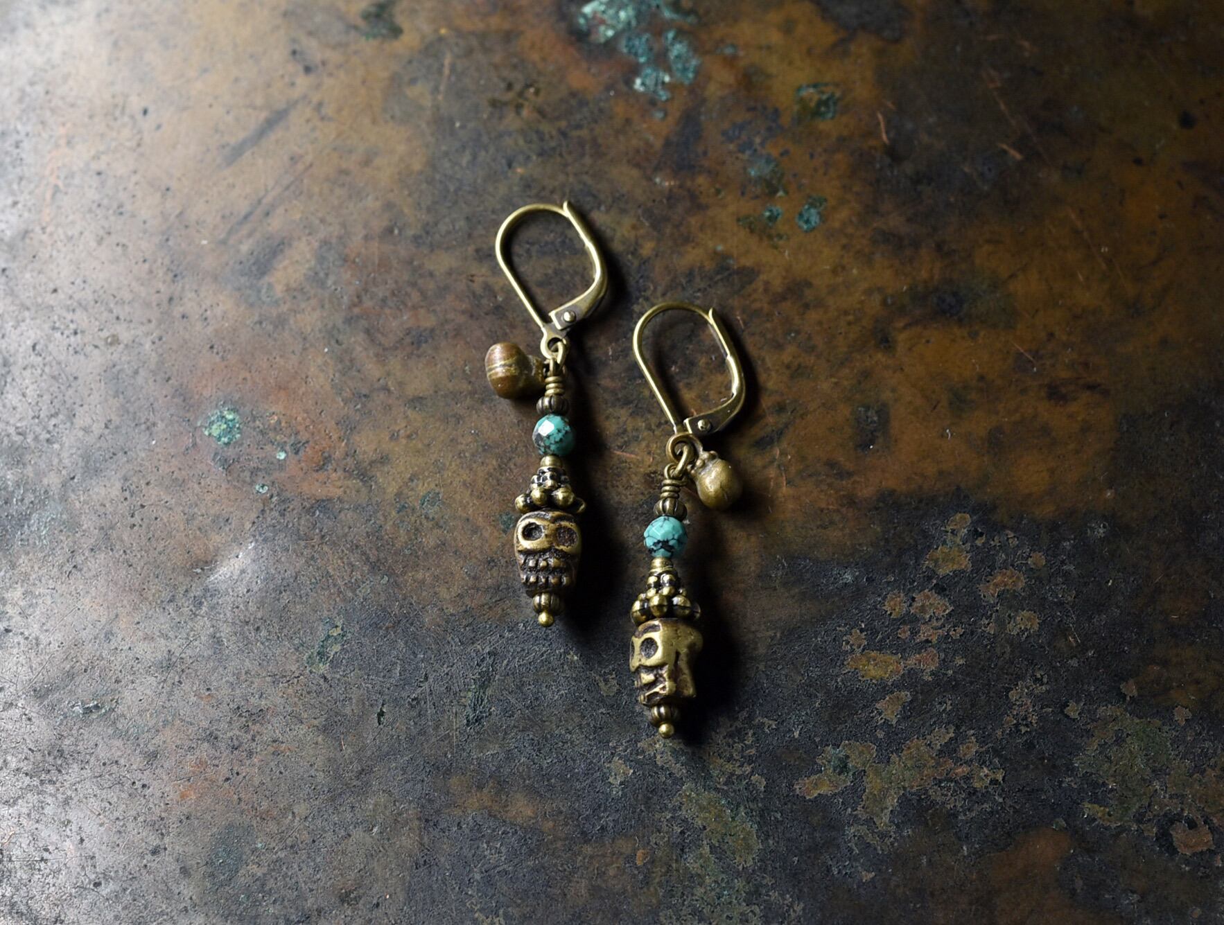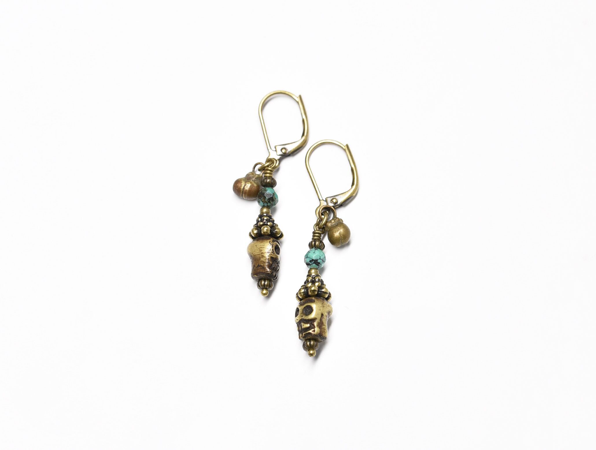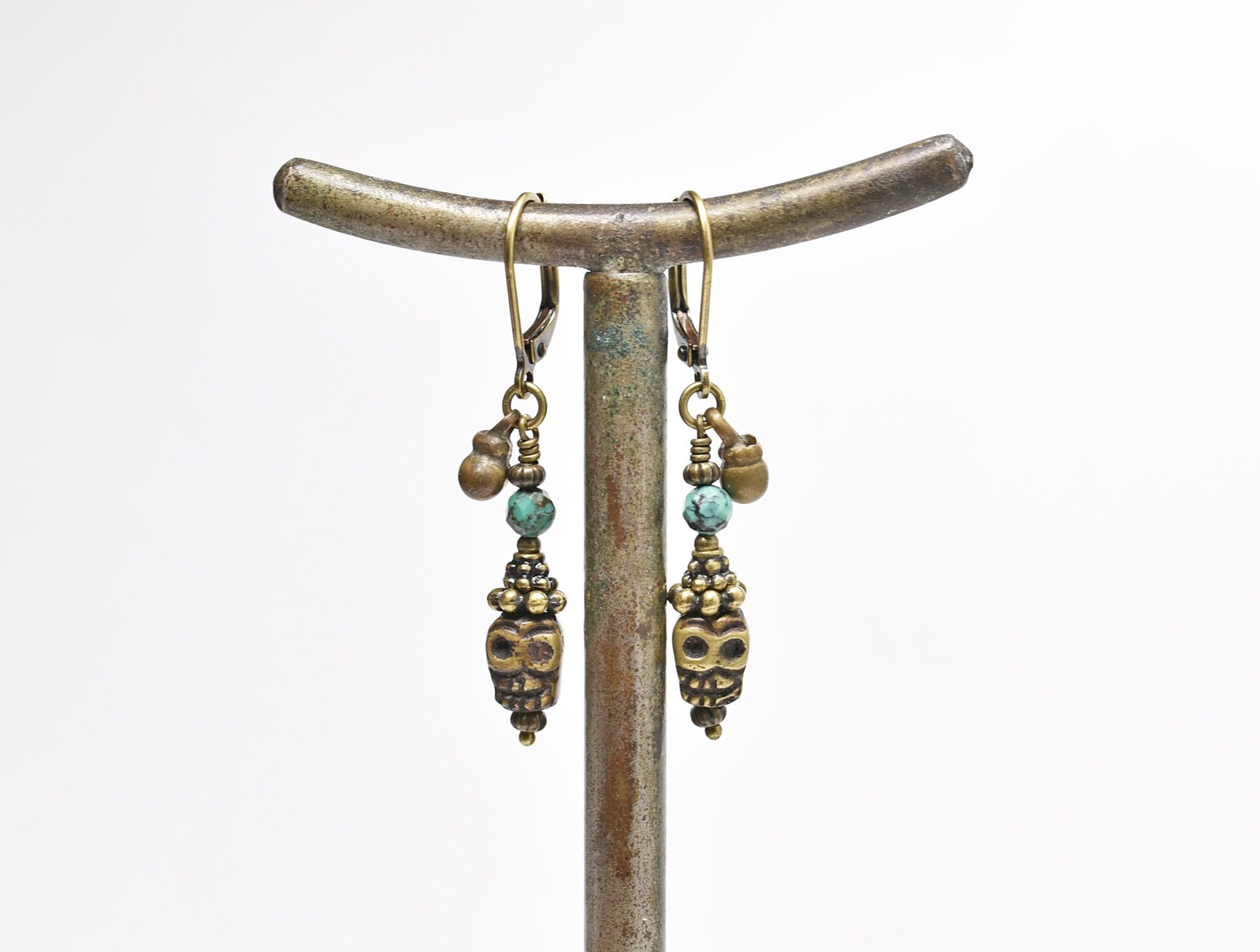 ファニーなスカルとターコイズ、民族鈴を繋いだ小さめなピアスです。