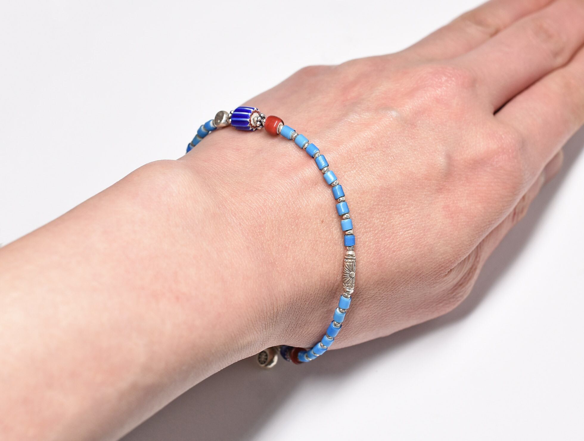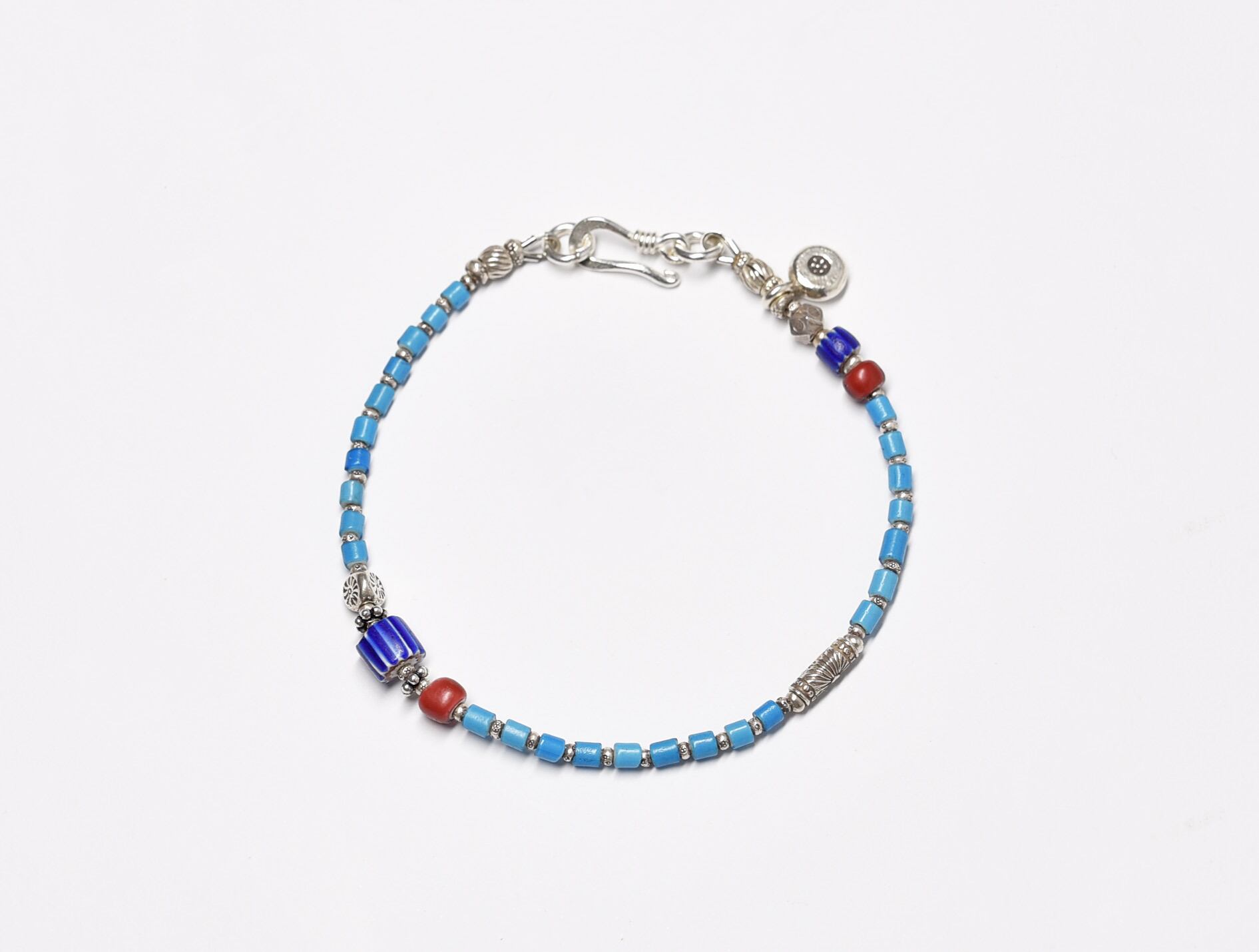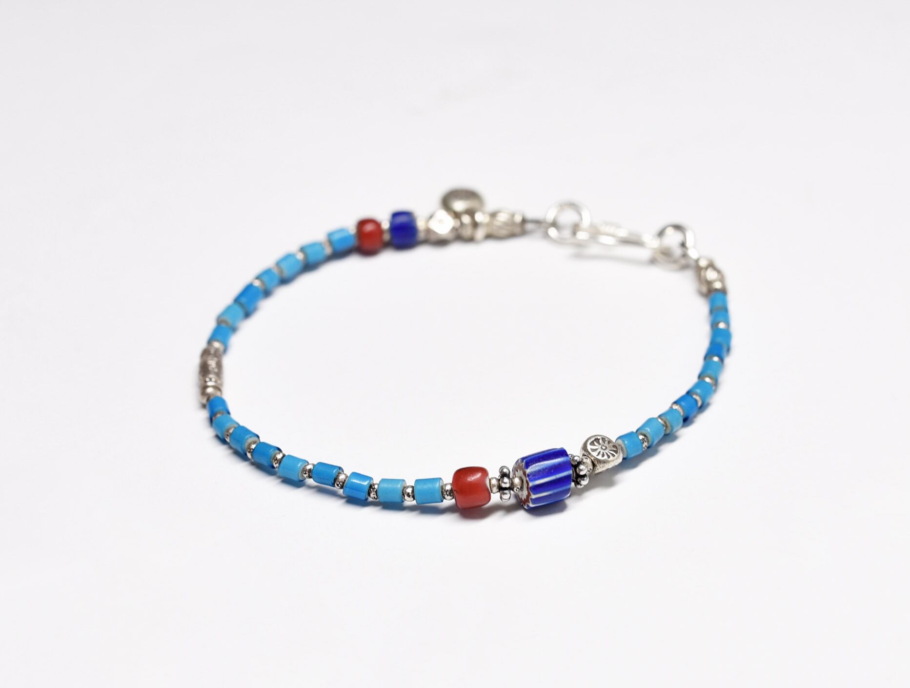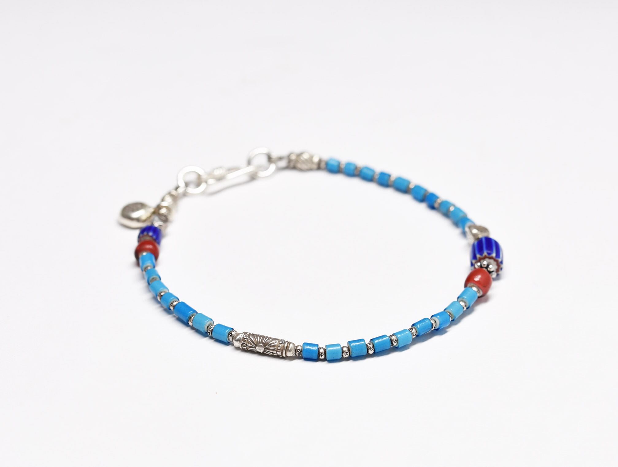 スカイブルー&金赤ホワイトハーツ、シェブロンビーズ、カレンシルバーのブレス