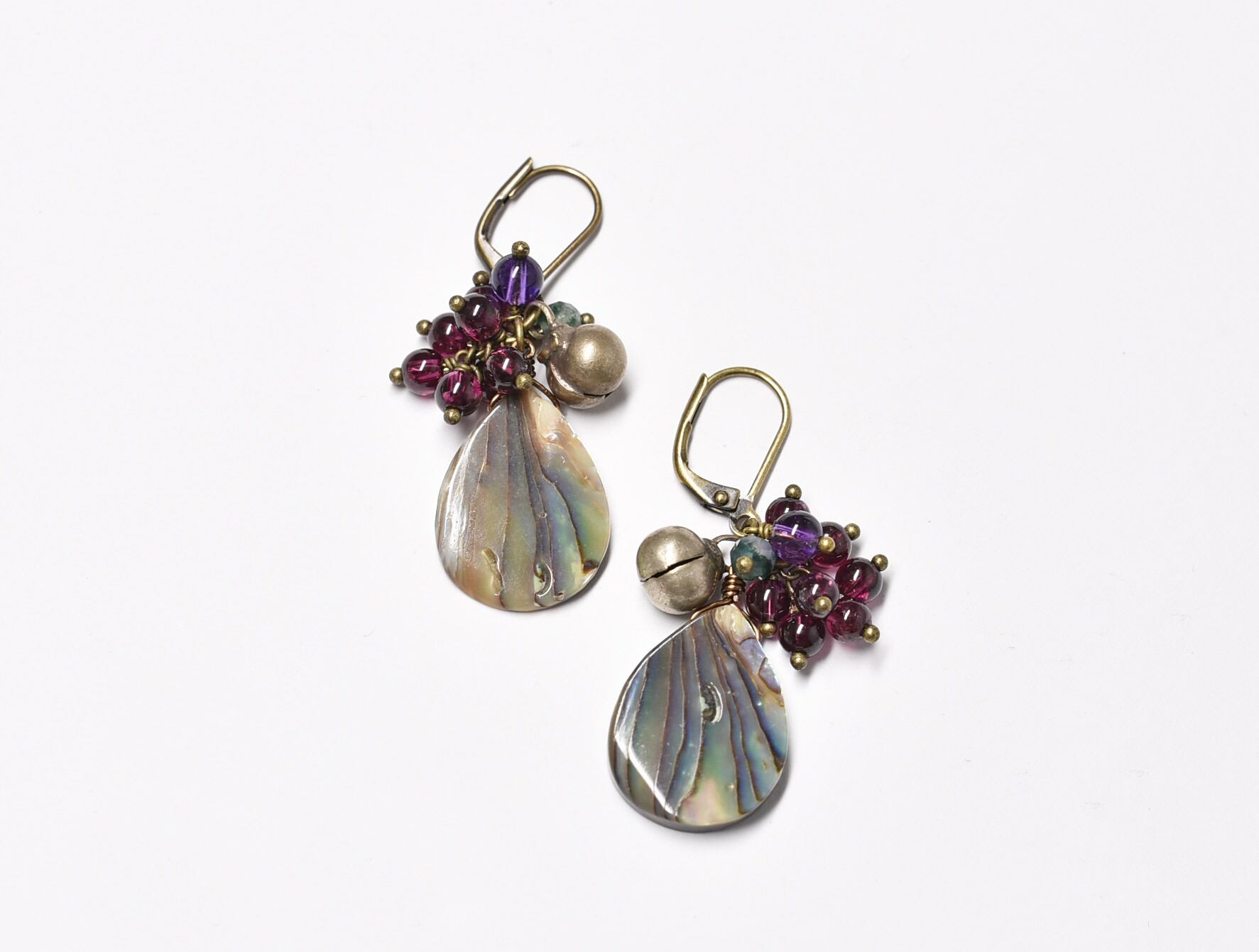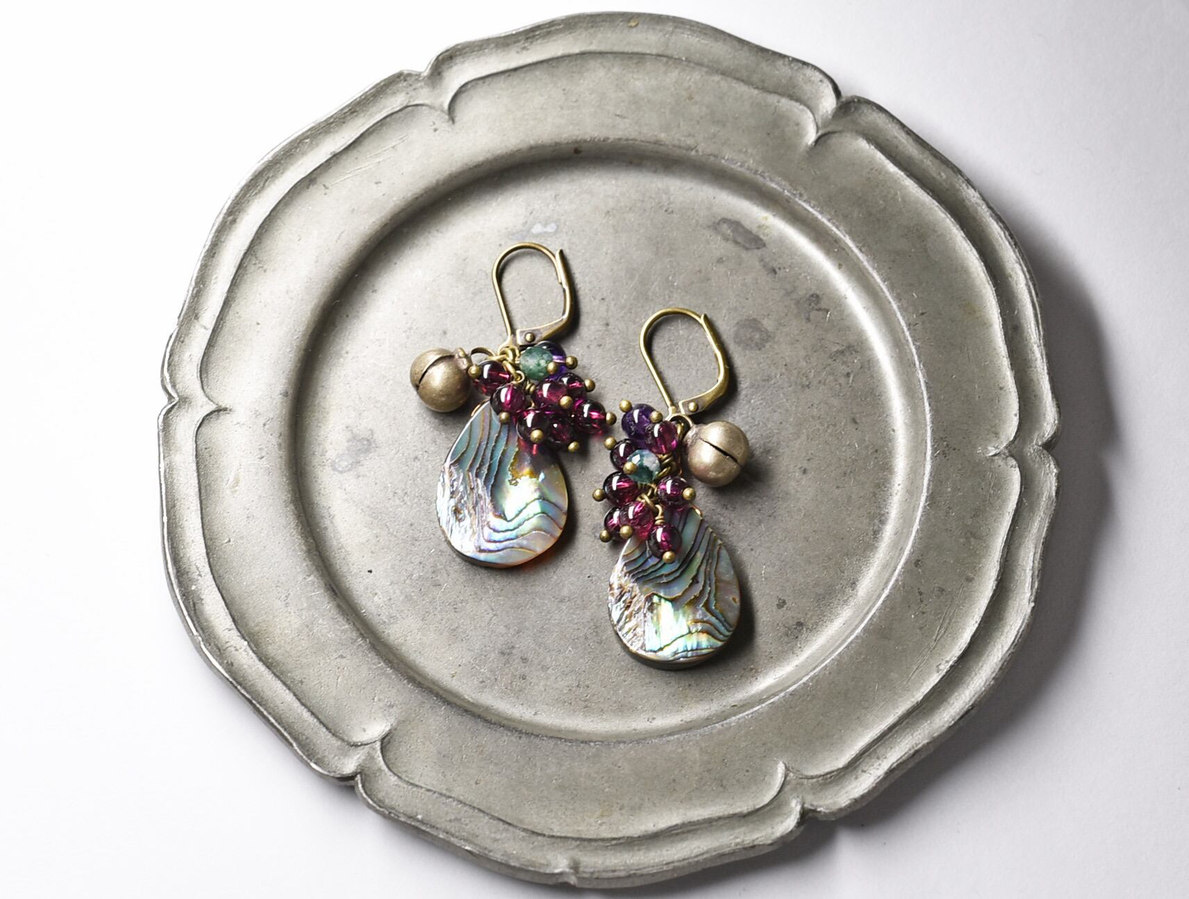 アバロンシェルとたわわなガーネット、モスアゲート、アメジスト、民族鈴のピアス
