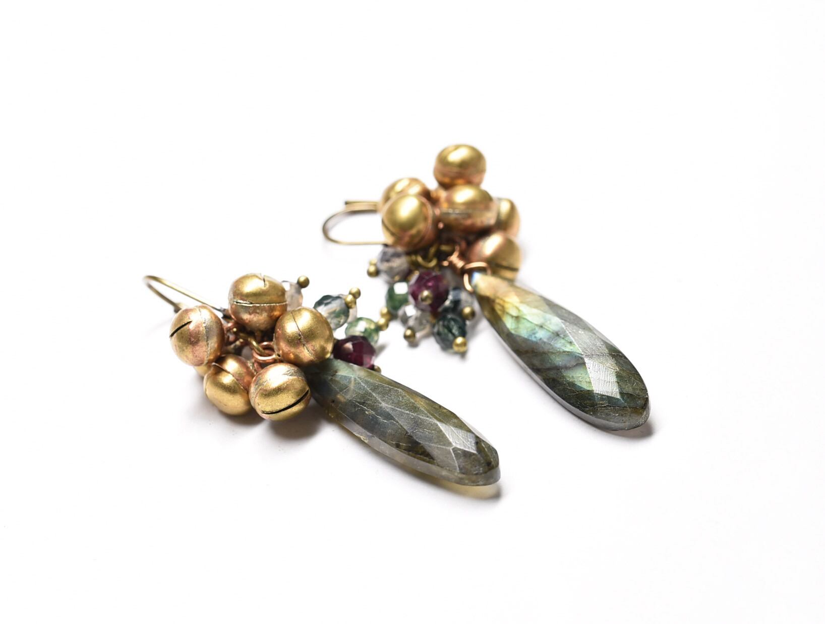 スリムな雫ラブラドライト、たわわな鈴と小さな3種の天然石のピアス