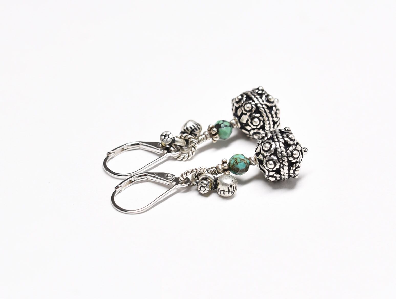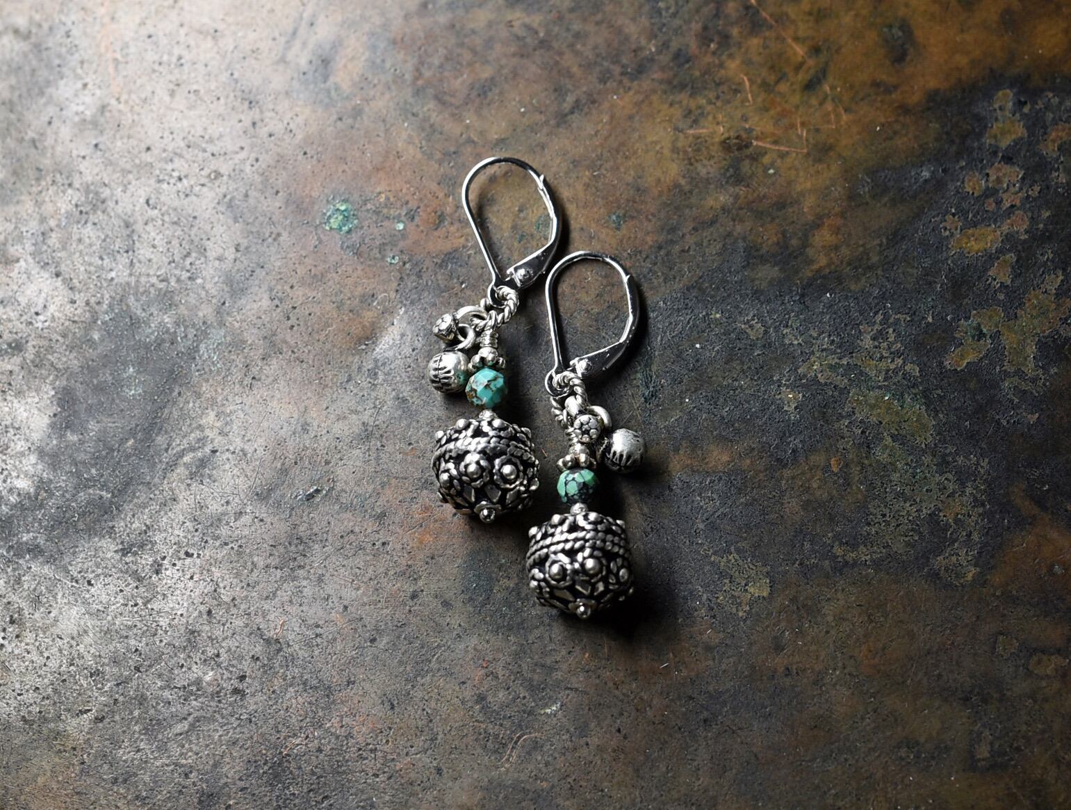アフガンシルバーとターコイズ、小さなインドシルバーの鈴を繋いだピアスです。