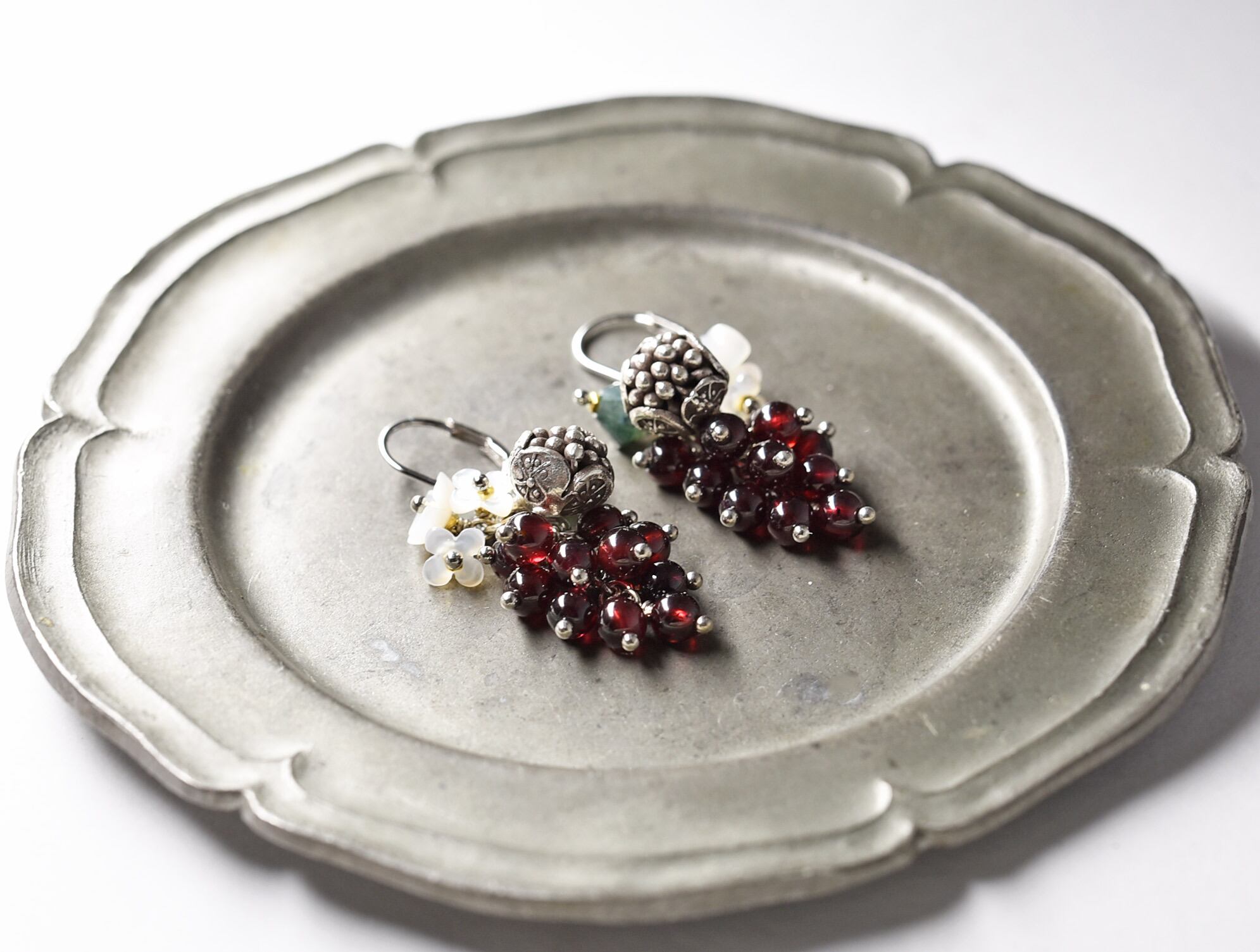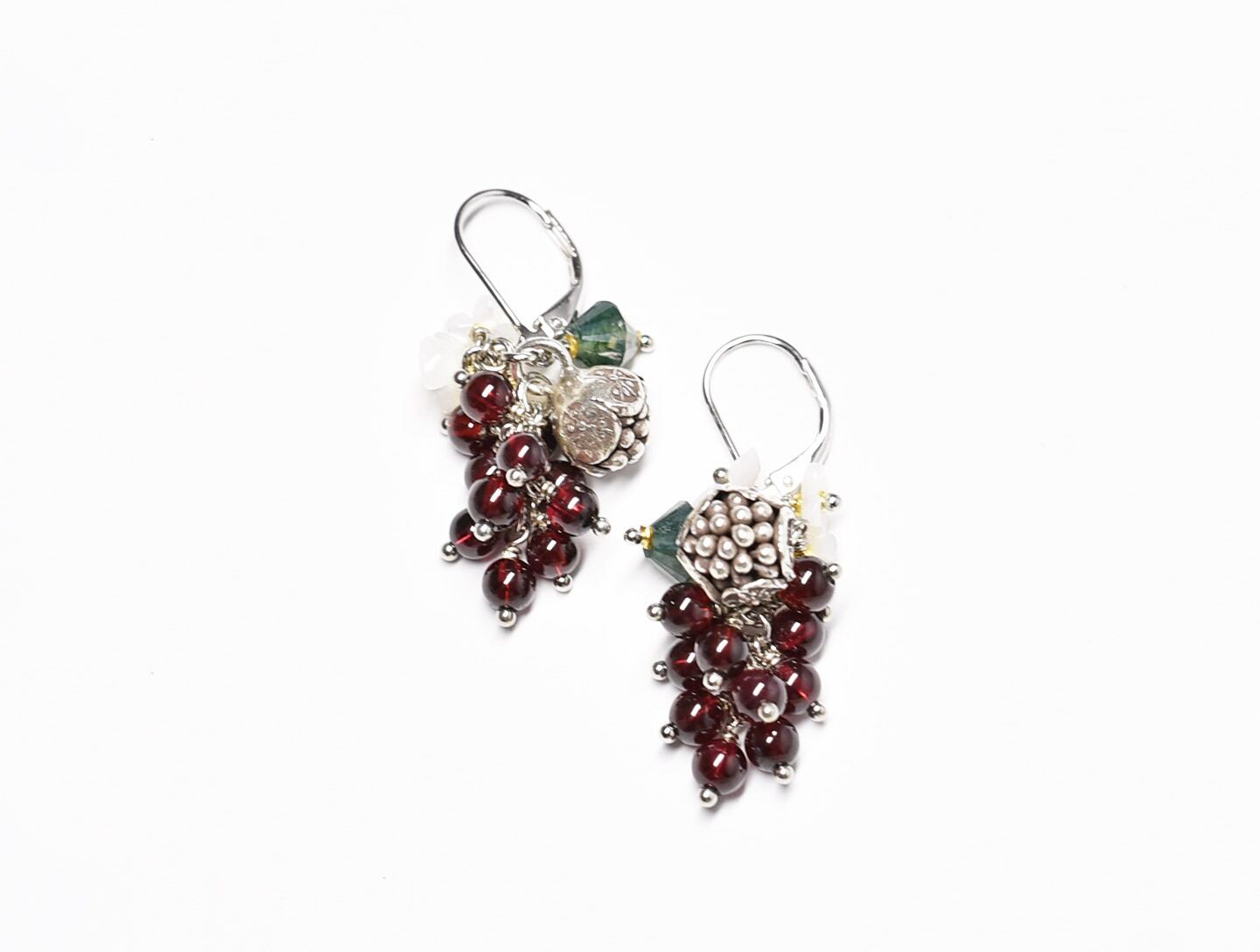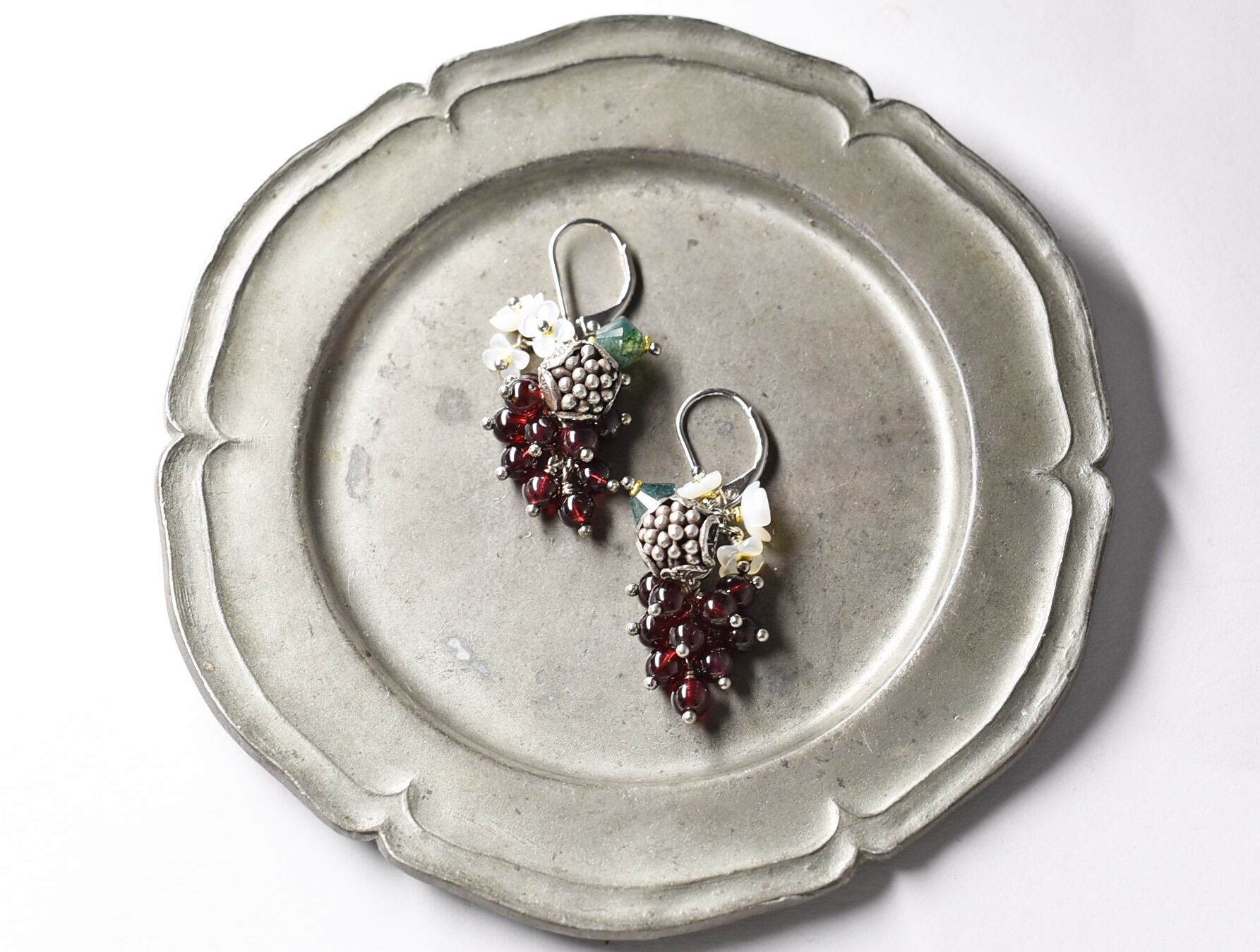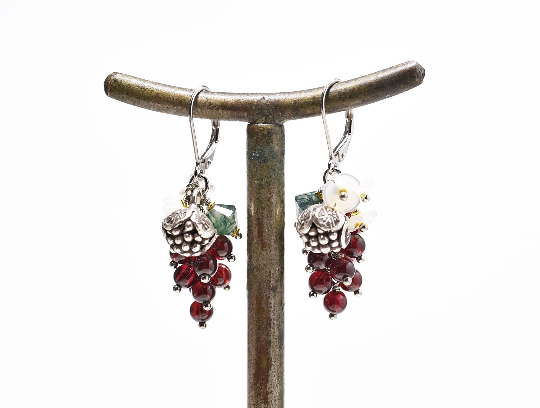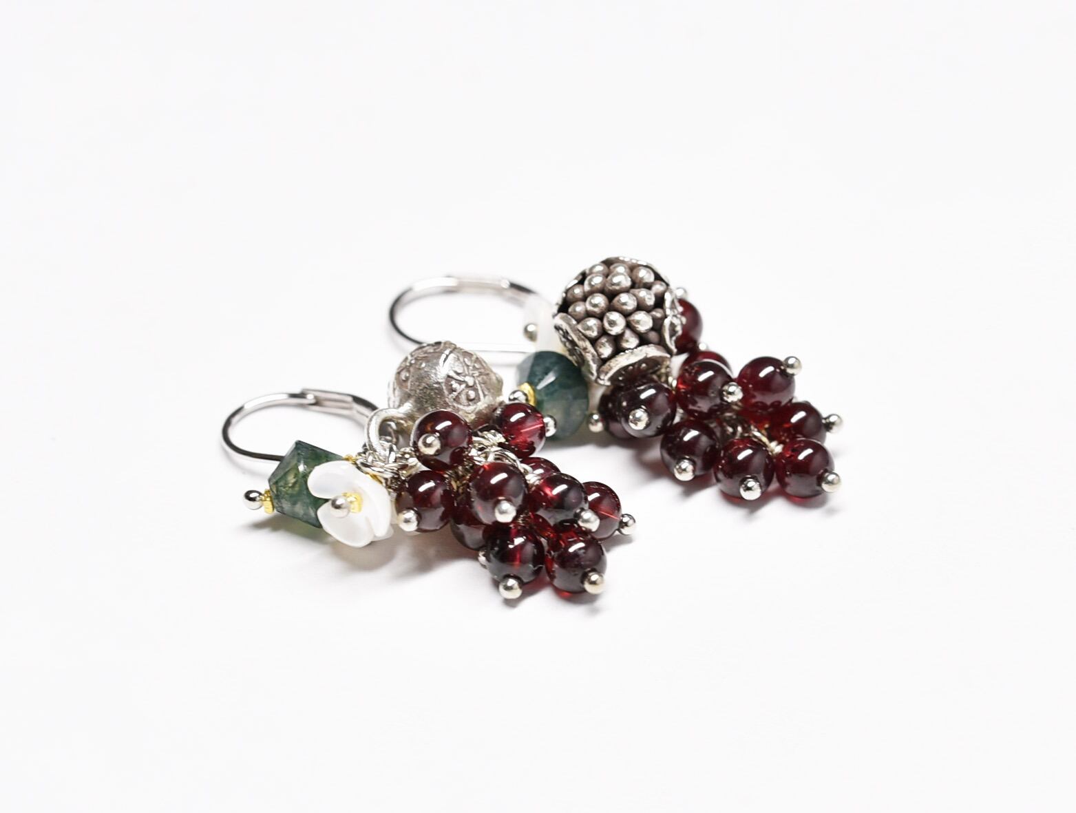たわわなガーネットとモスアゲート、白蝶貝の小花、丸いお花のカレンシルバーを繋いだピアスです。