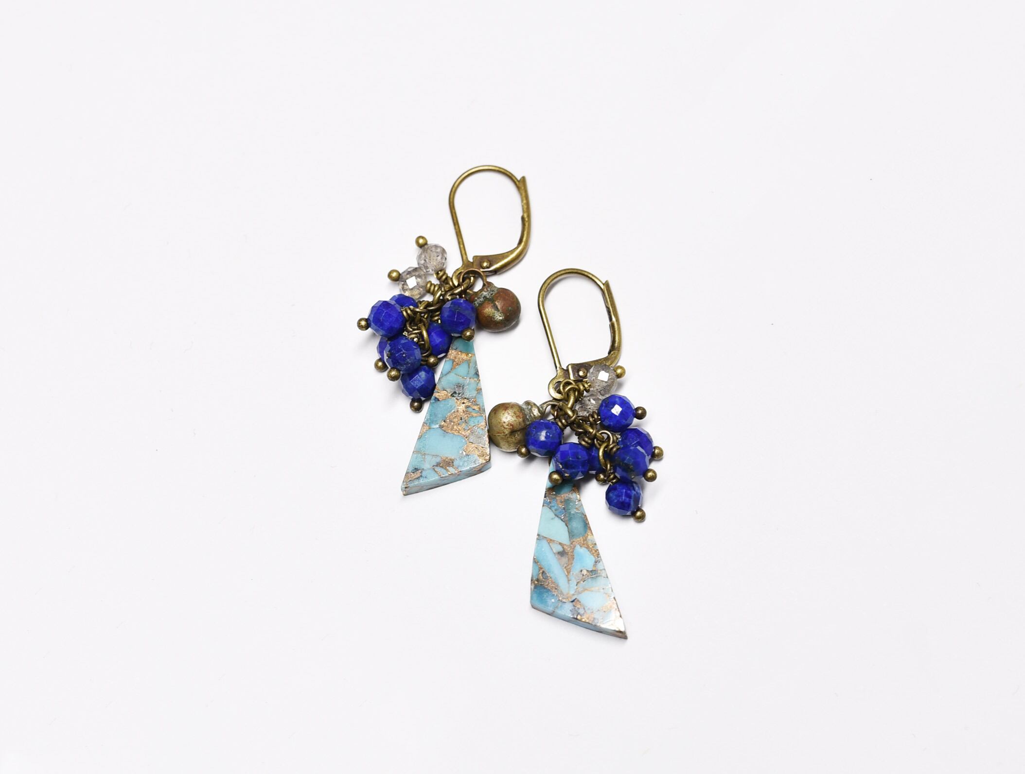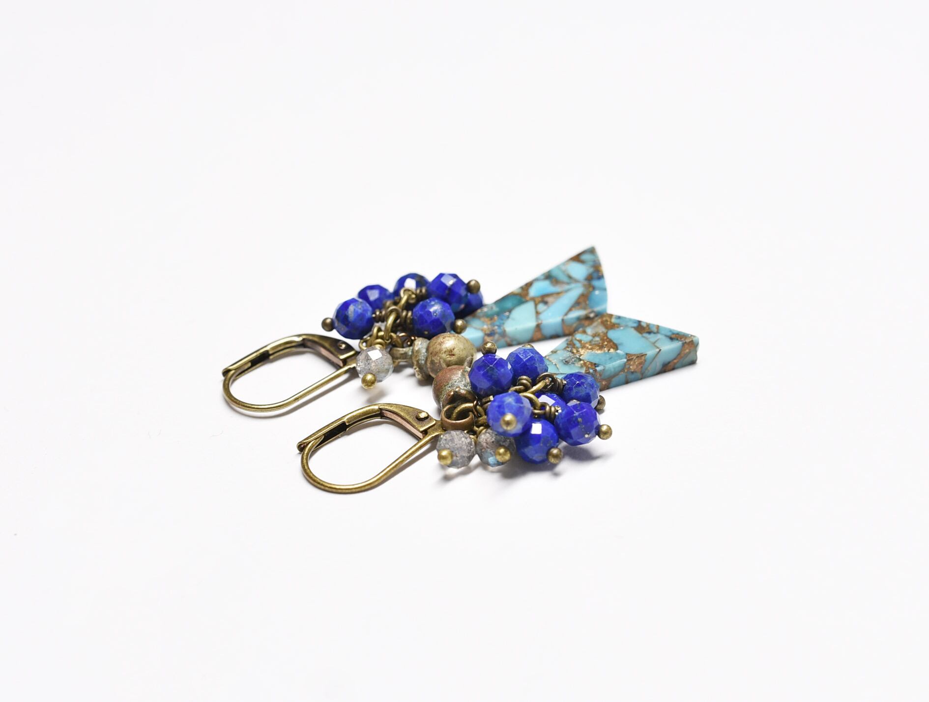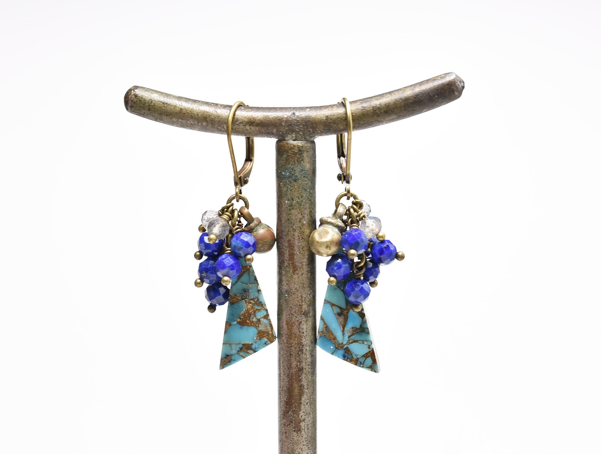 ブルーコッパーターコイズとたわわなラピスラズリ、ラブラドライト、民族鈴を繋いだピアスです。