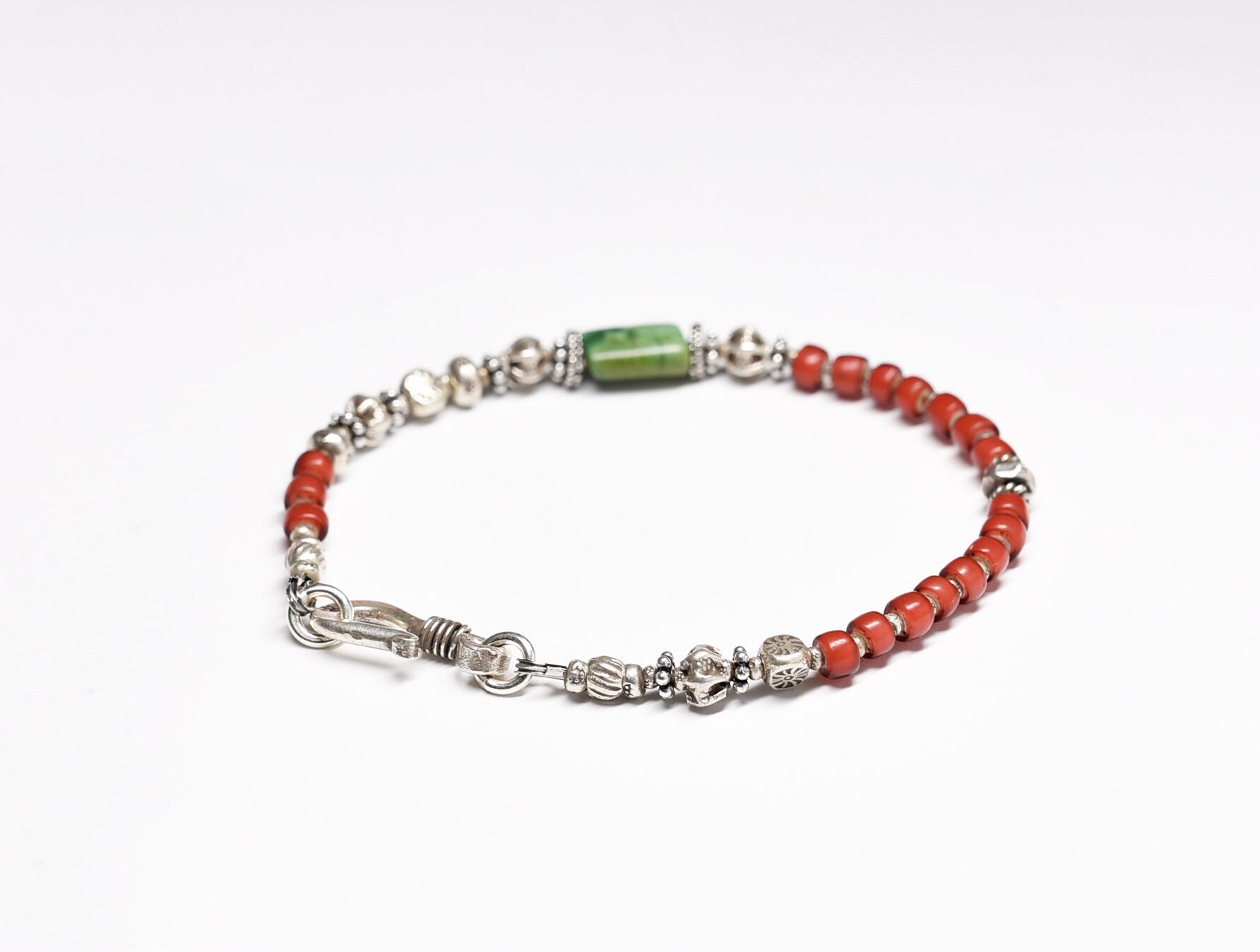 oldチベタンターコイズと金赤ホワイトハーツ、様々なカレンシルバーを繋いだブレスです。