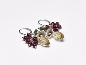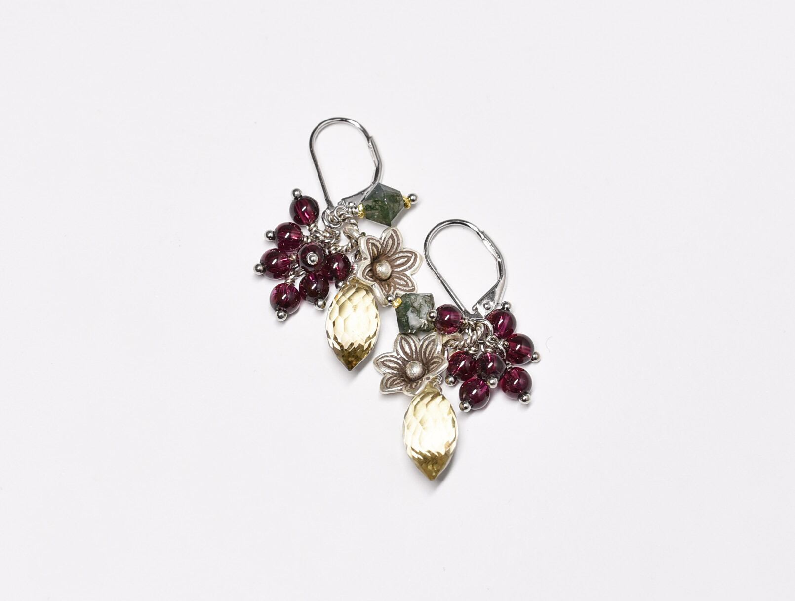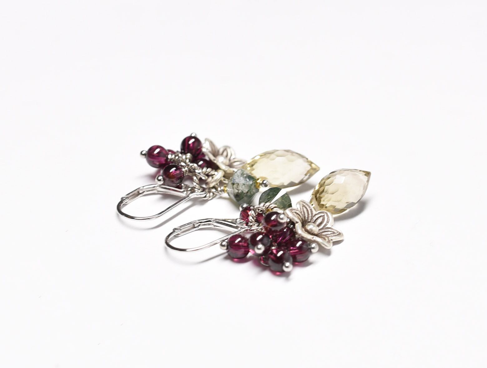 スモーキークォーツとたわわなガーネット、カレンシルバーのお花、モスアゲートのピアス