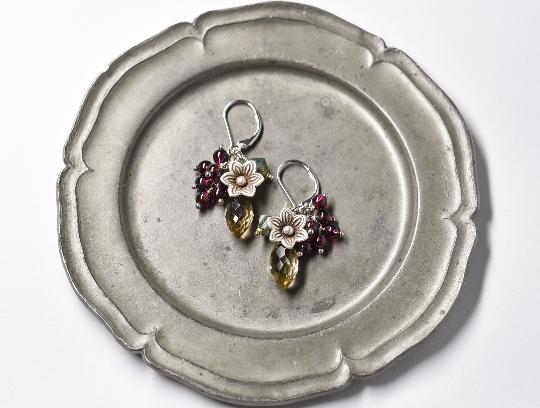 スモーキークォーツとたわわなガーネット、カレンシルバーのお花、モスアゲートを繋いだピアスです。