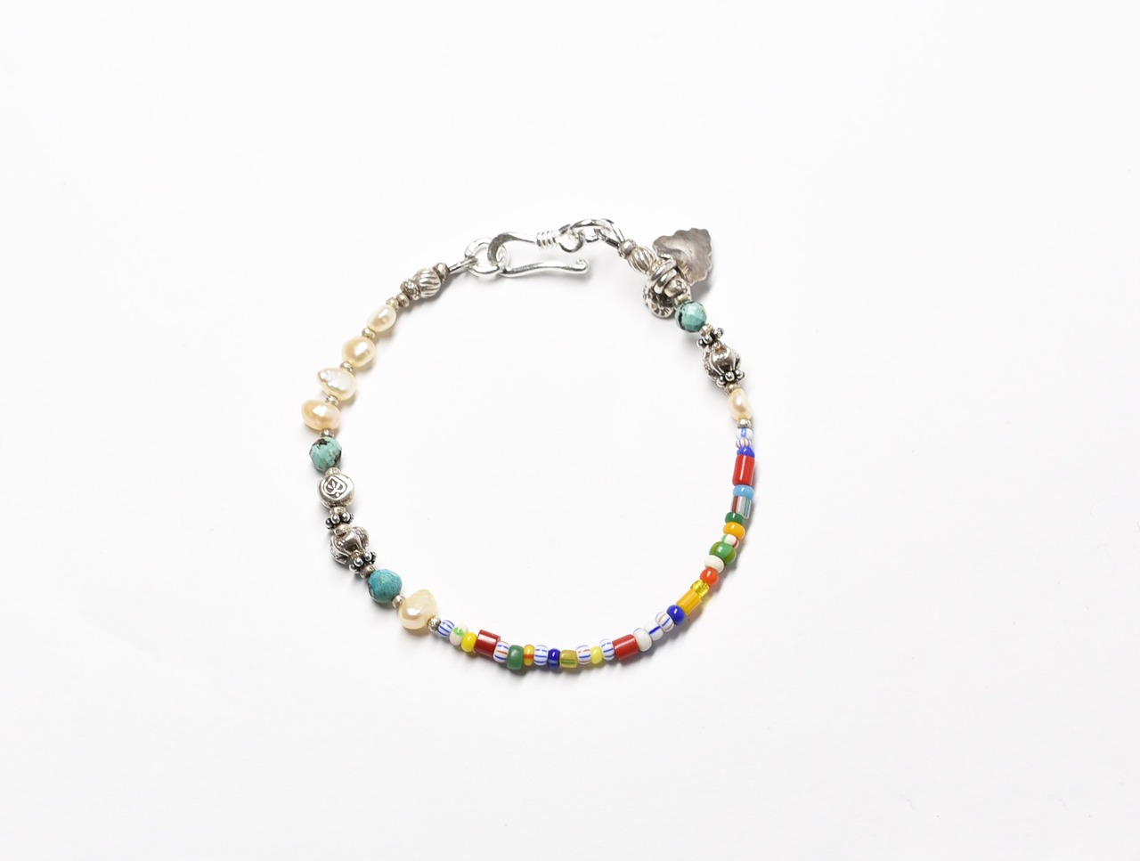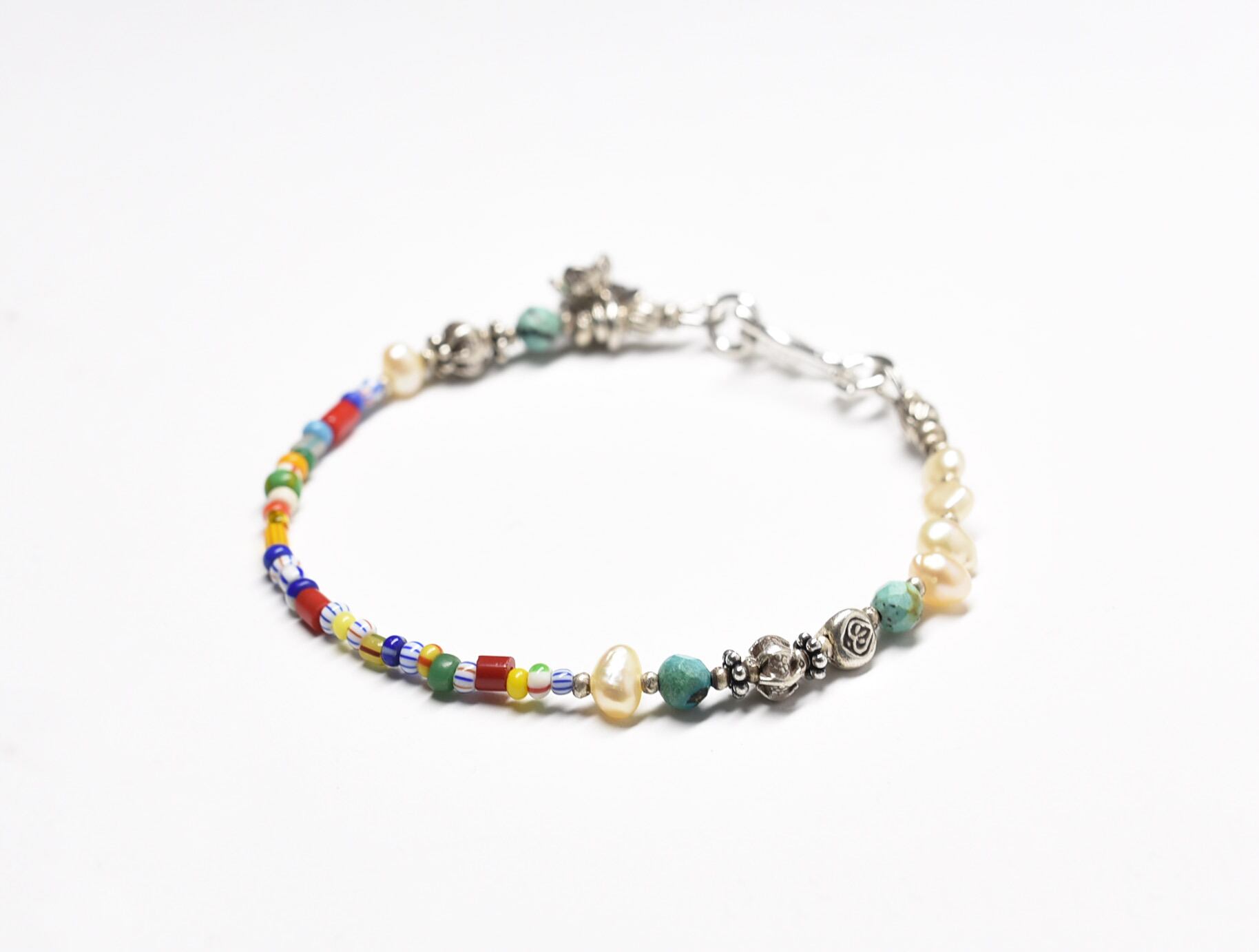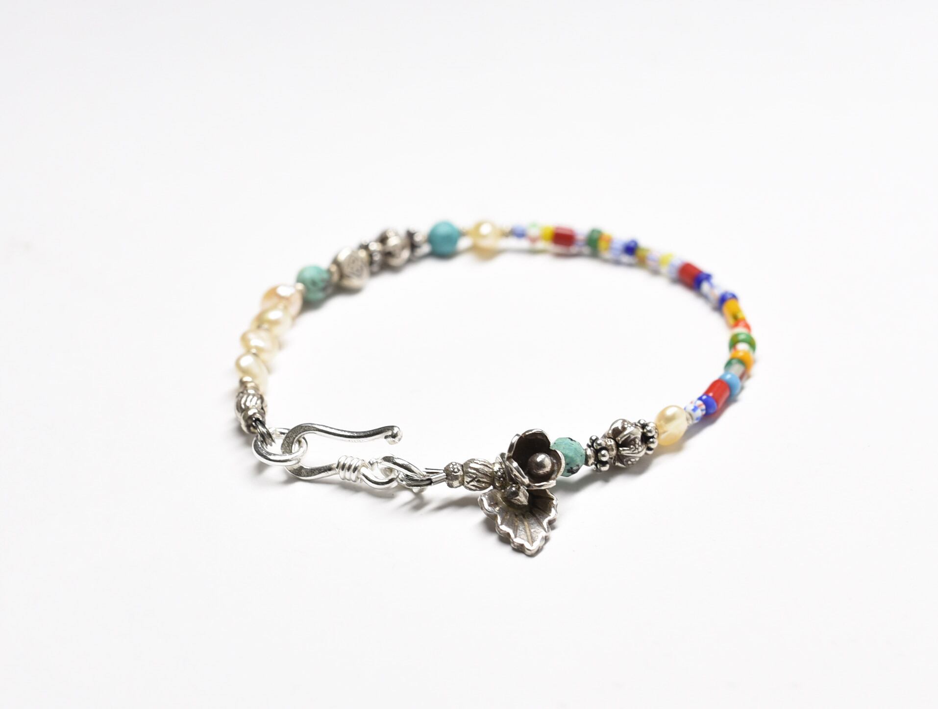 クリスマスビーズと淡水パール、ターコイズ、カレンシルバーのカラフルブレス