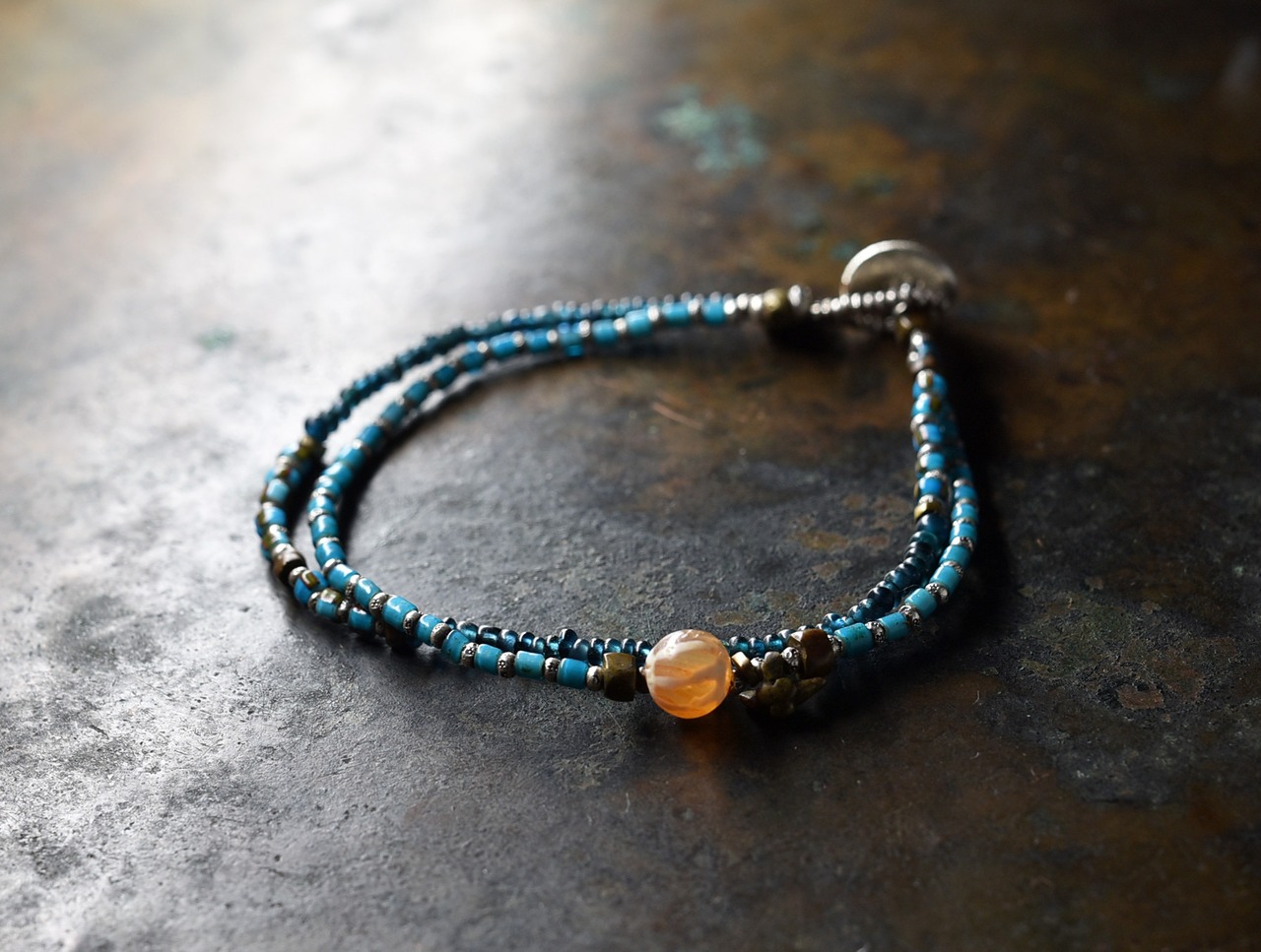 エッチドカーネリアンとインディゴブルーのアンティークビーズ、ターコイズブルーホワイトハーツ、カレンシルバー、oldオリッサブラスを繋いだブレスです。