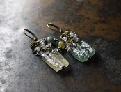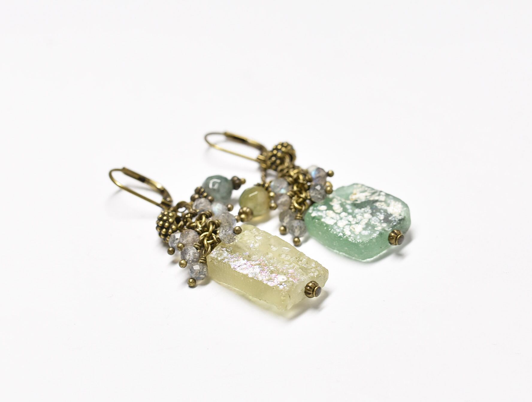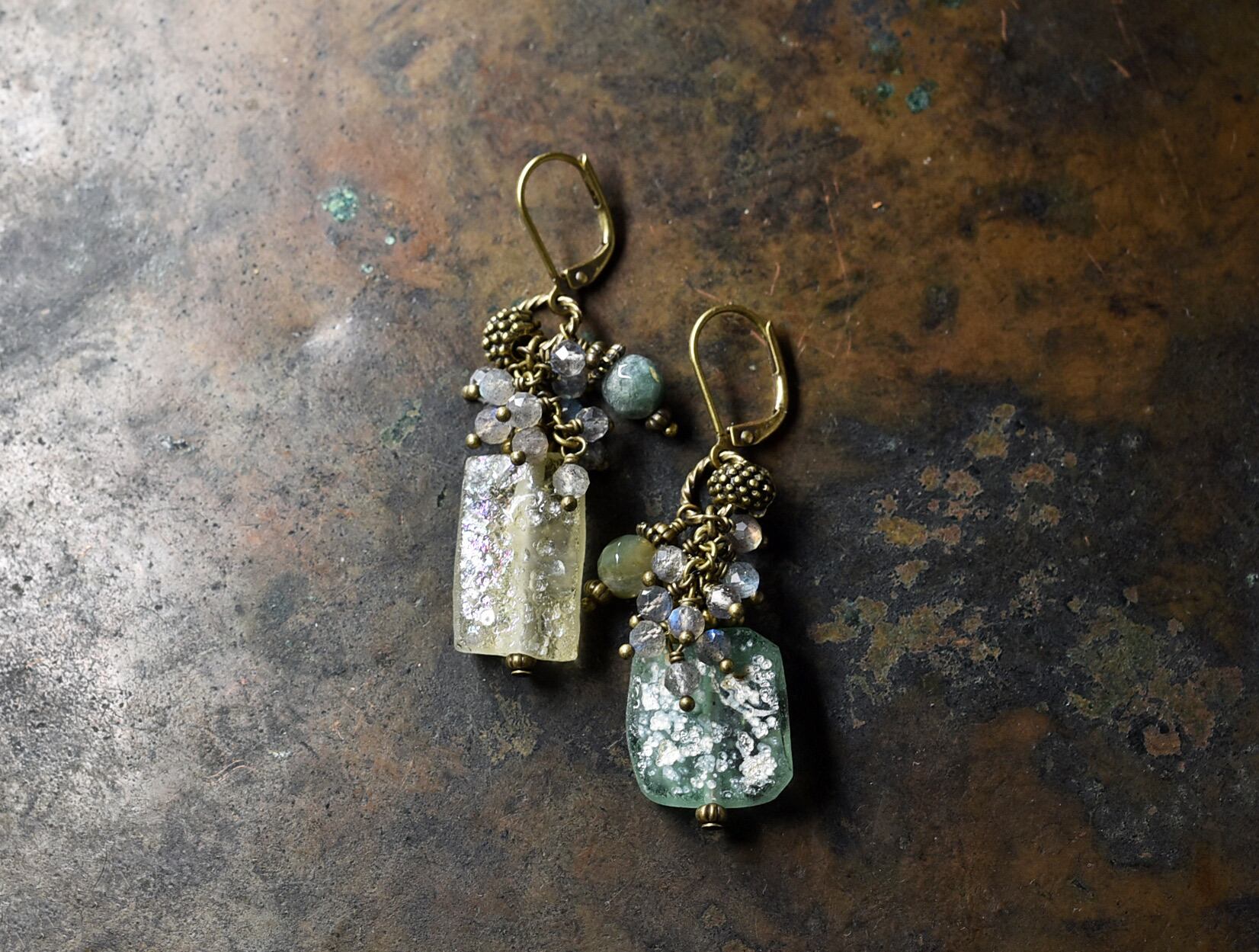 銀化ローマングラスとたわわなラブラドライト、インディアンアゲートのピアス