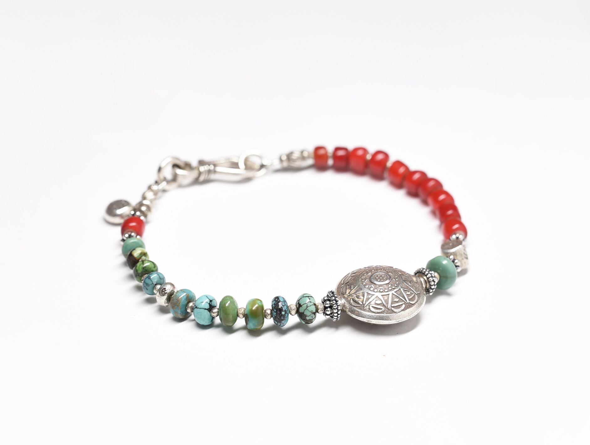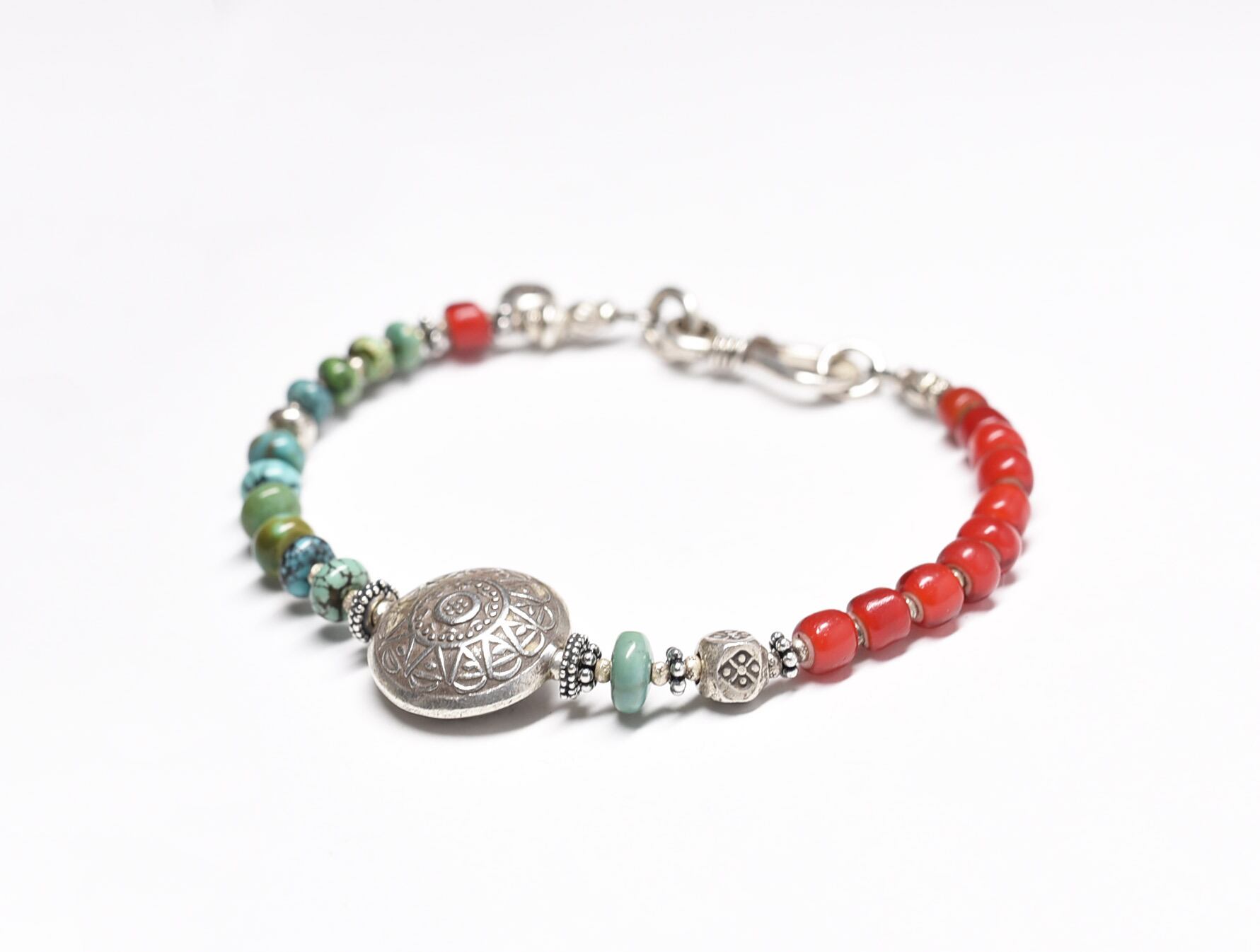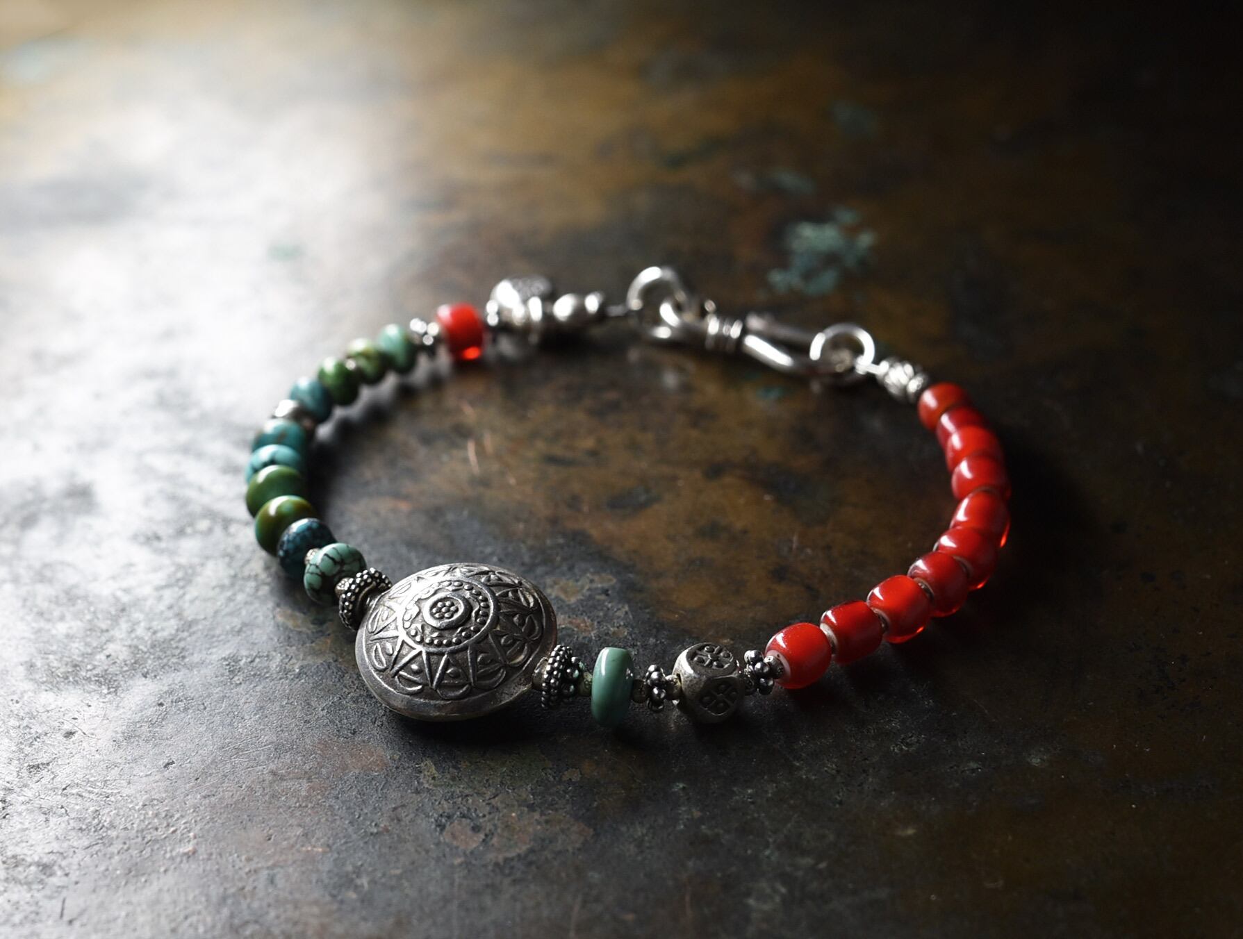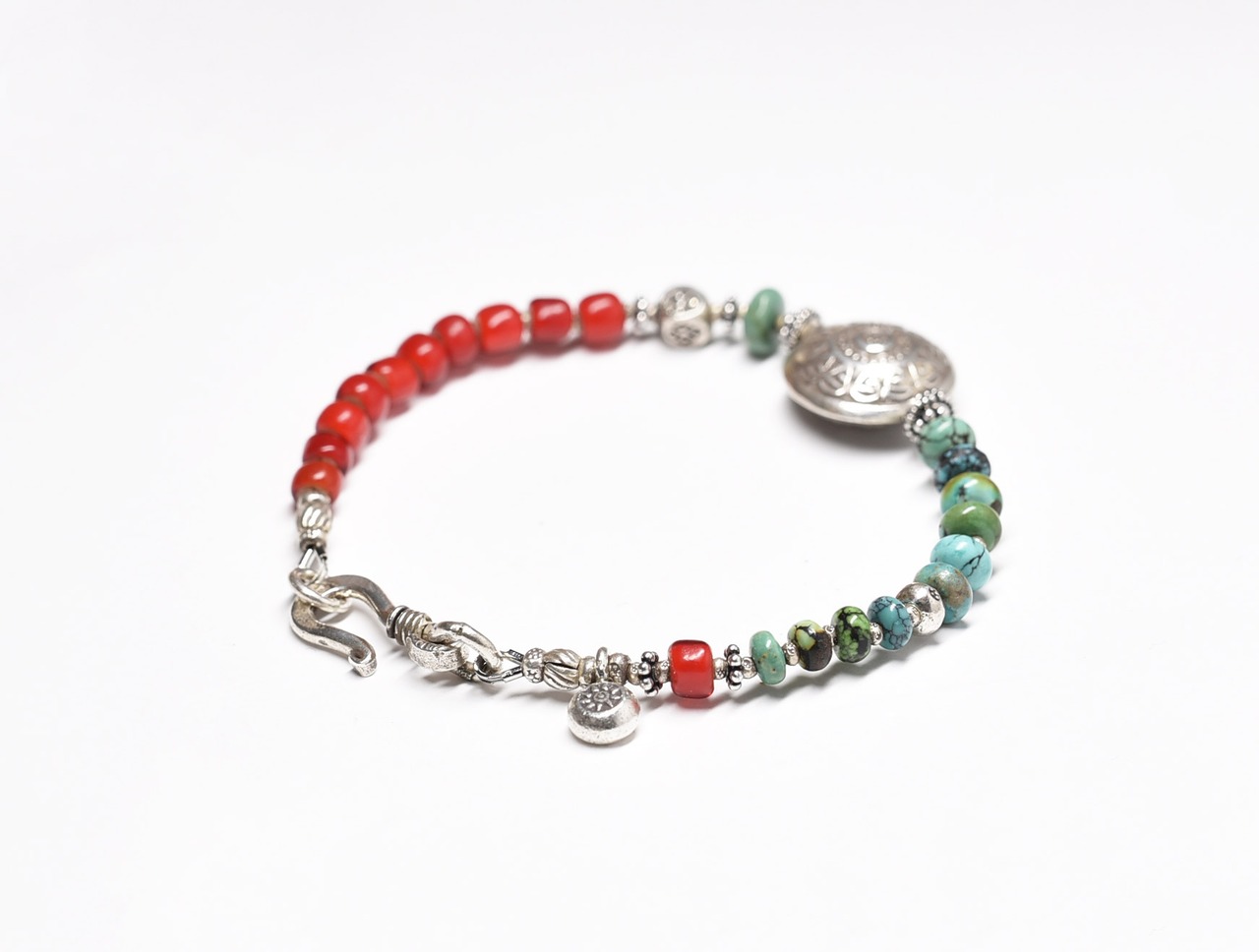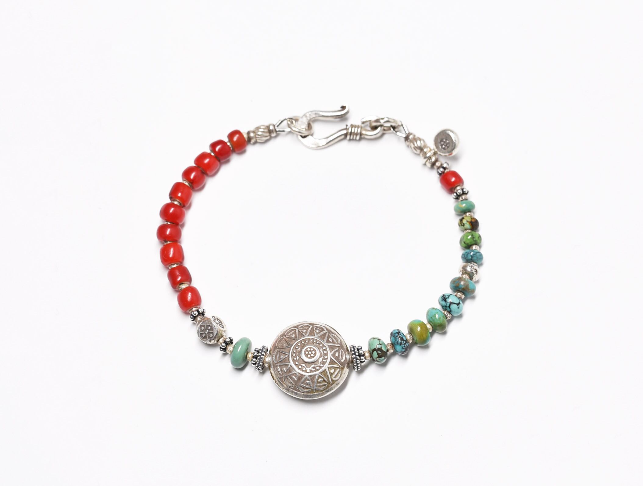 魔法陣のようなカレンシルバーをトップにアンティークホワイトハーツ、ターコイズ、カレンシルバービーズ繋いだややボリュームのあるブレスです。