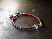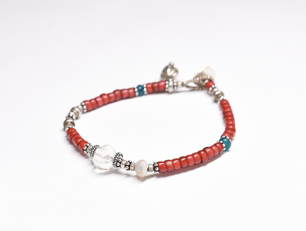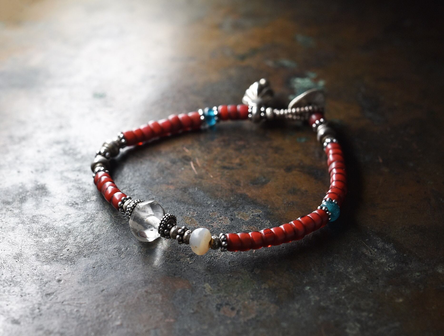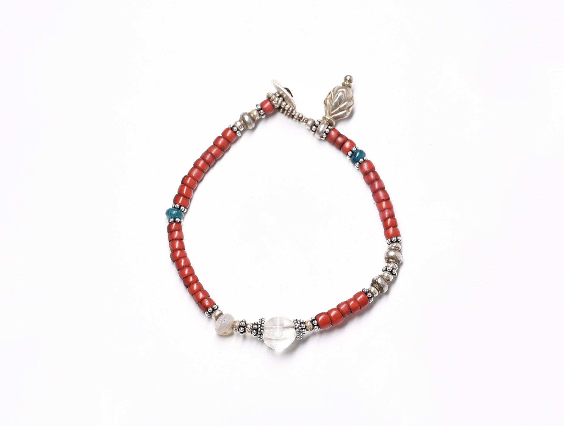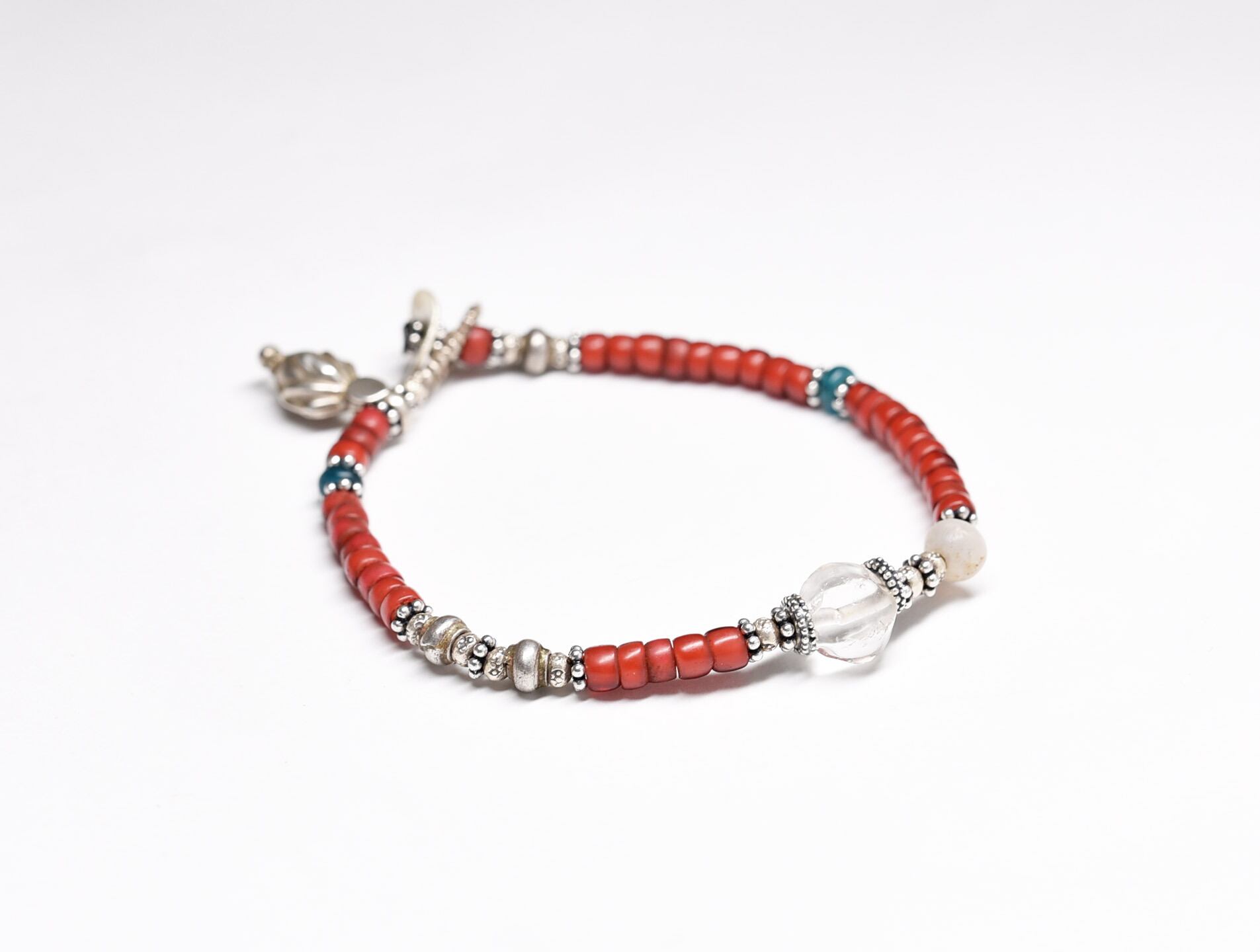 古代水晶と古代瑪瑙、金赤ホワイトハーツ、oldチンシルバー、エメラルドブルービーズのブレス