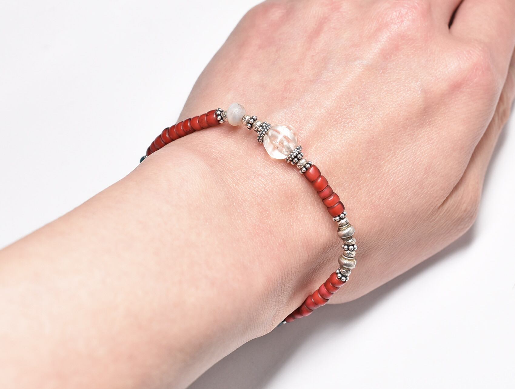 ロウビキ紐で繋いでいるので、最初はやや硬めですが、身に着けていただくうちにしなやかになっていきます。