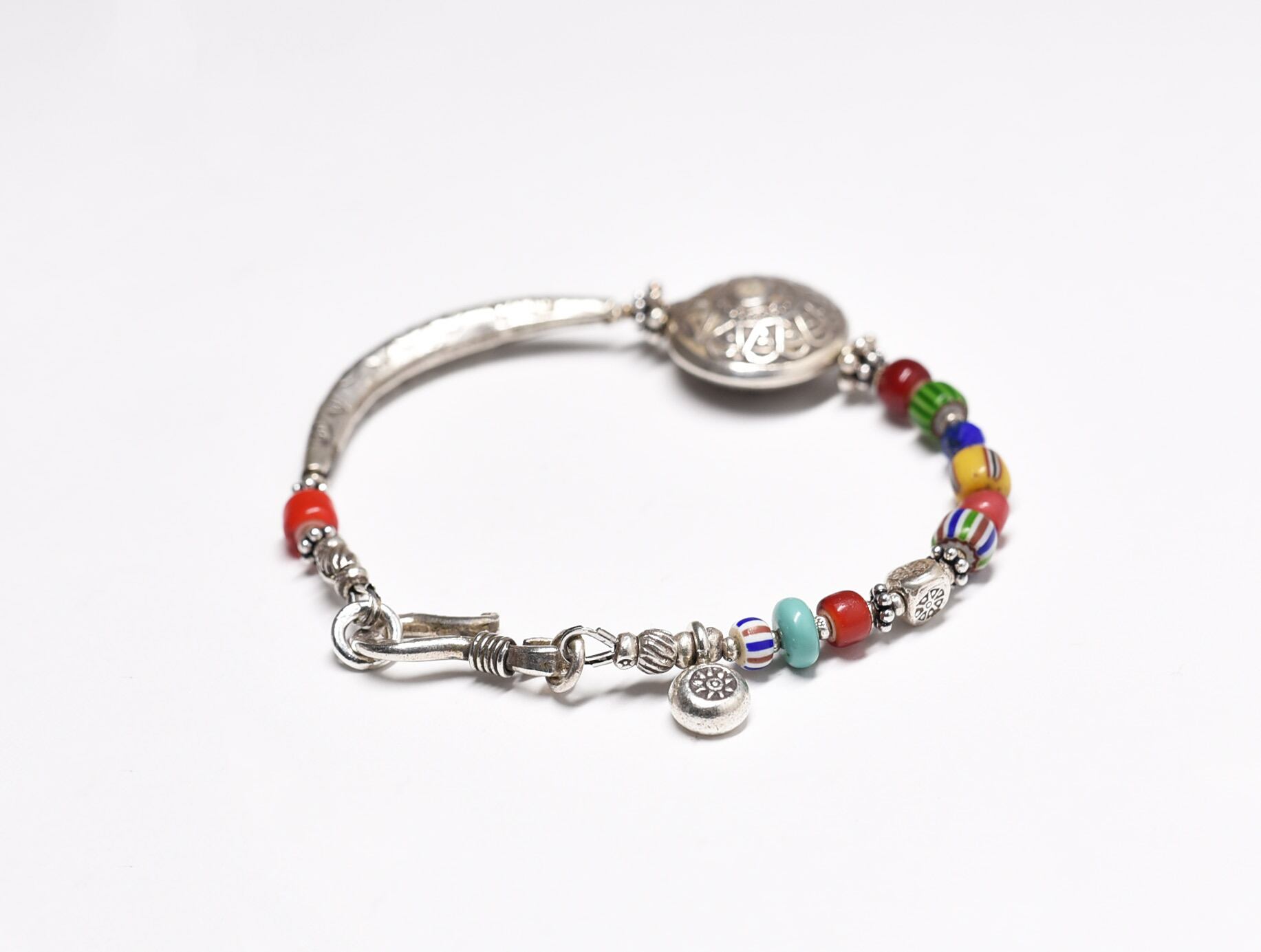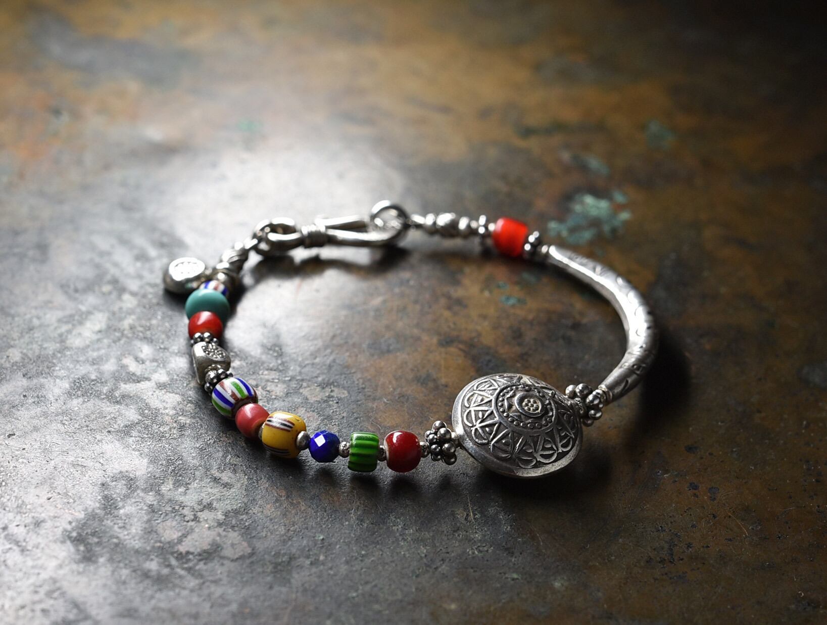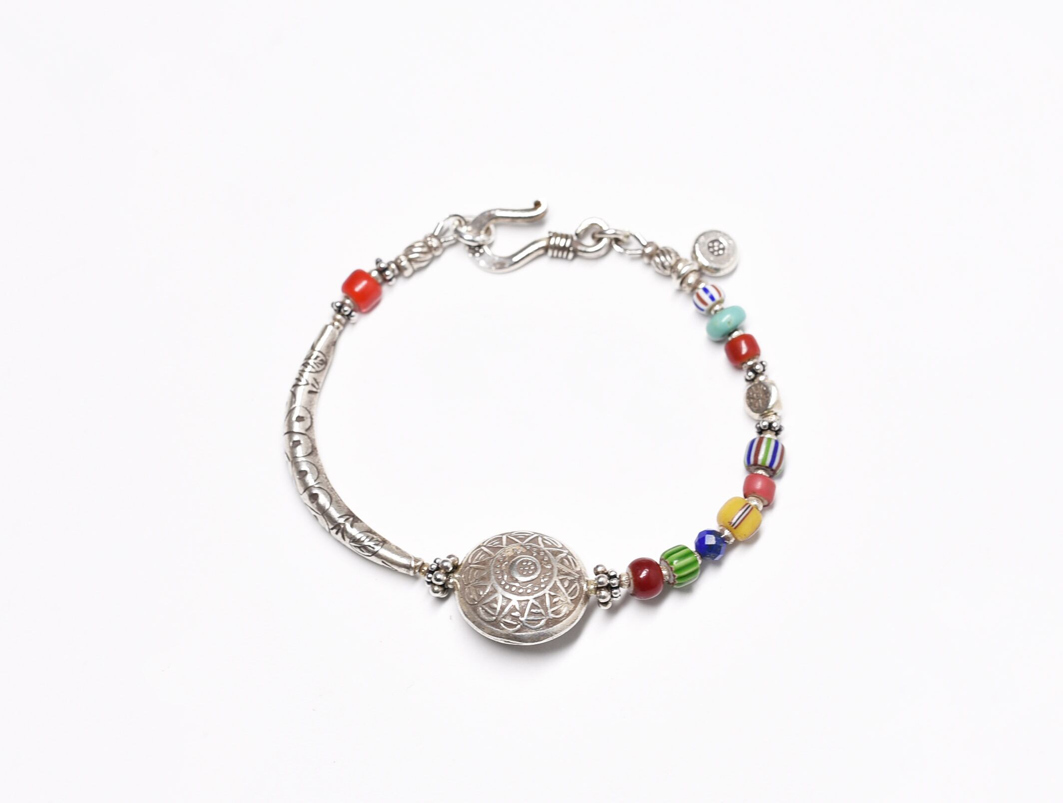 魔法陣のようなカレンシルバーをトップに湾曲カレンシルバー、色んなベネチア産のアンティークビーズや天然石、カレンシルバービーズをミックスした賑やかなブレスです。