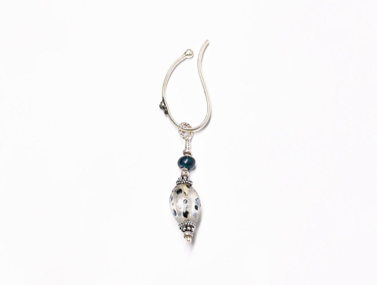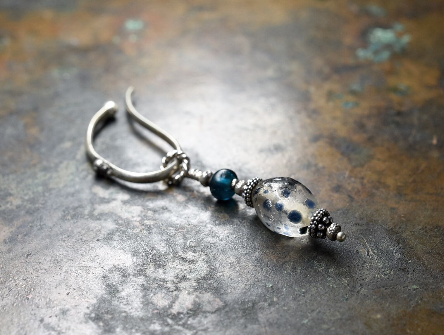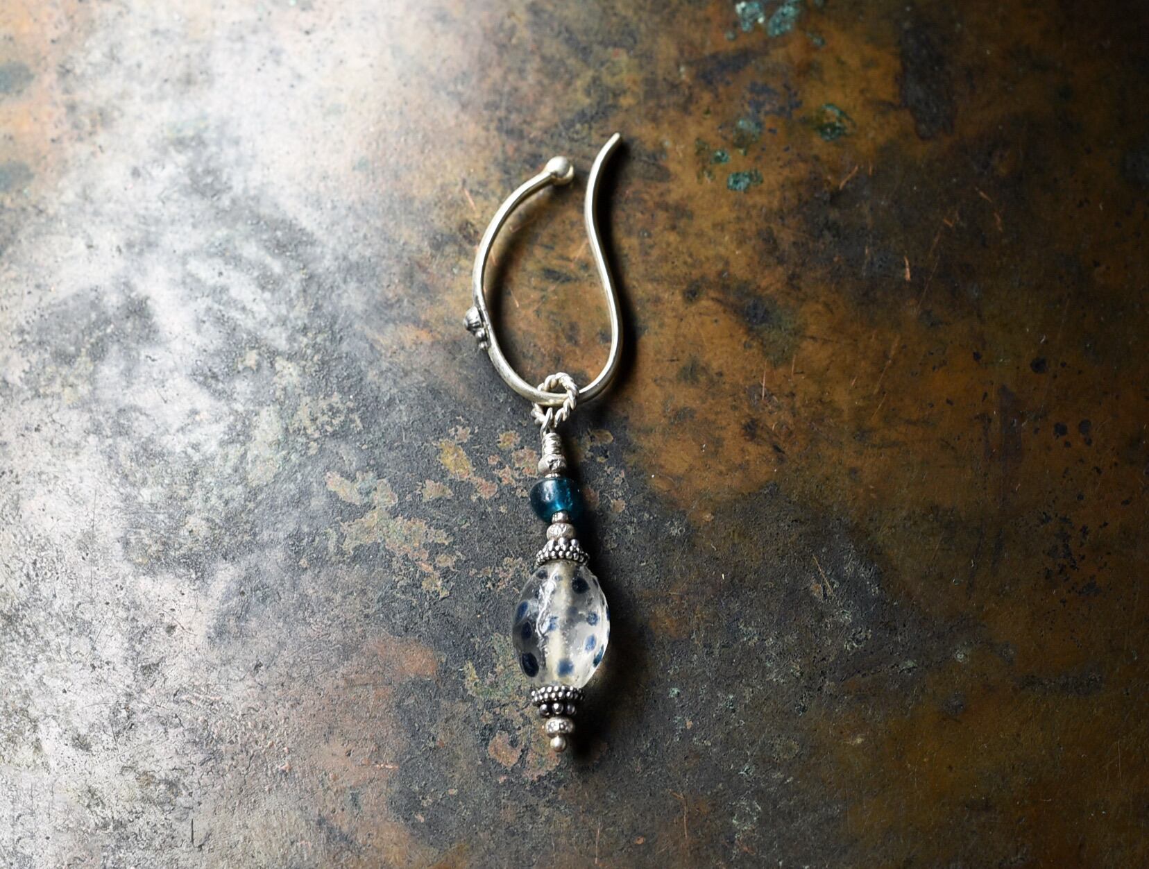 古代施釉水晶とインディゴブルーアンティークビーズ、カレンシルバービーズなどを繋いだインドシルバーのイヤーカフです。