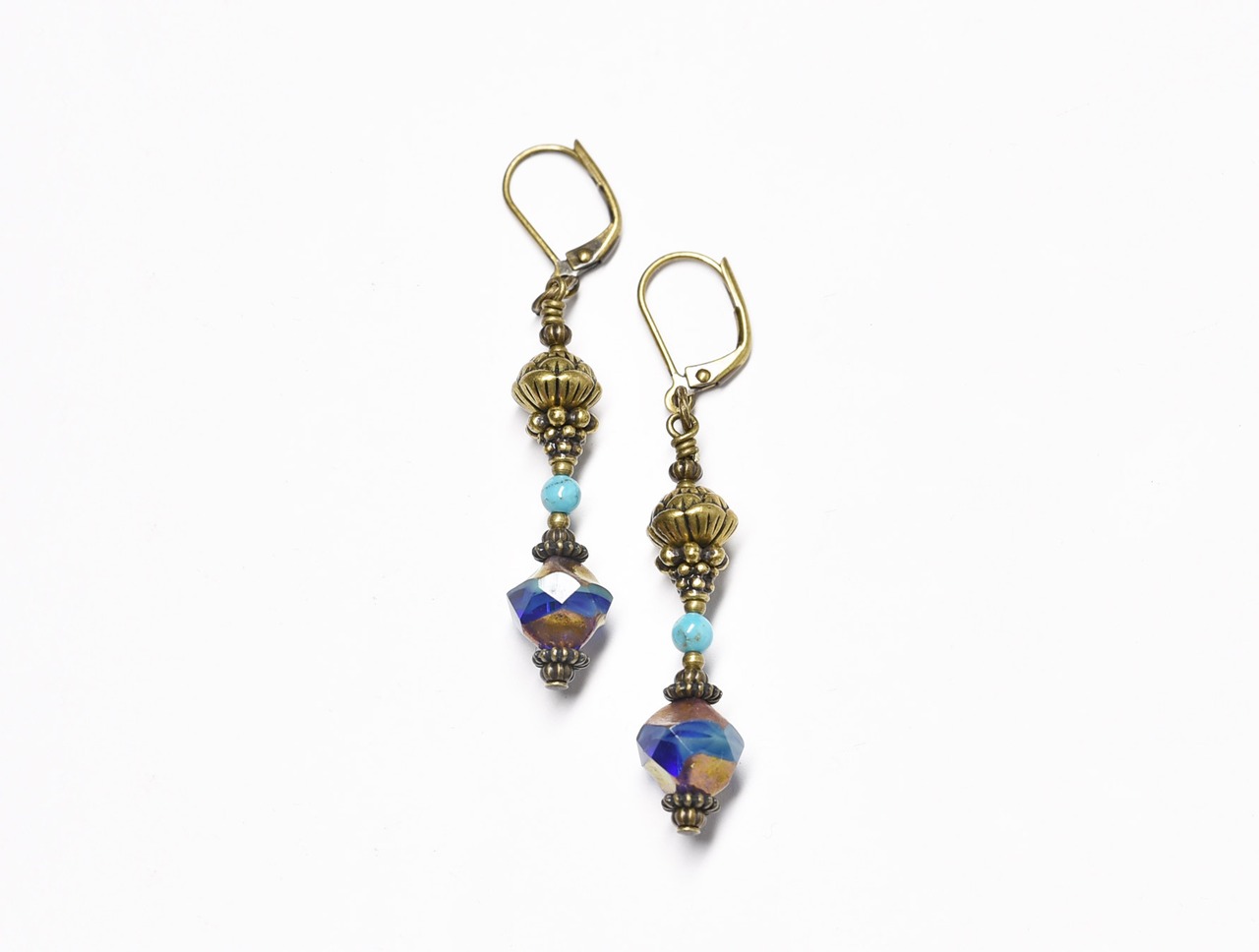 ブルー&ターコイズチェコビーズとターコイズ、蓮華ブラスを繋いだピアスです。