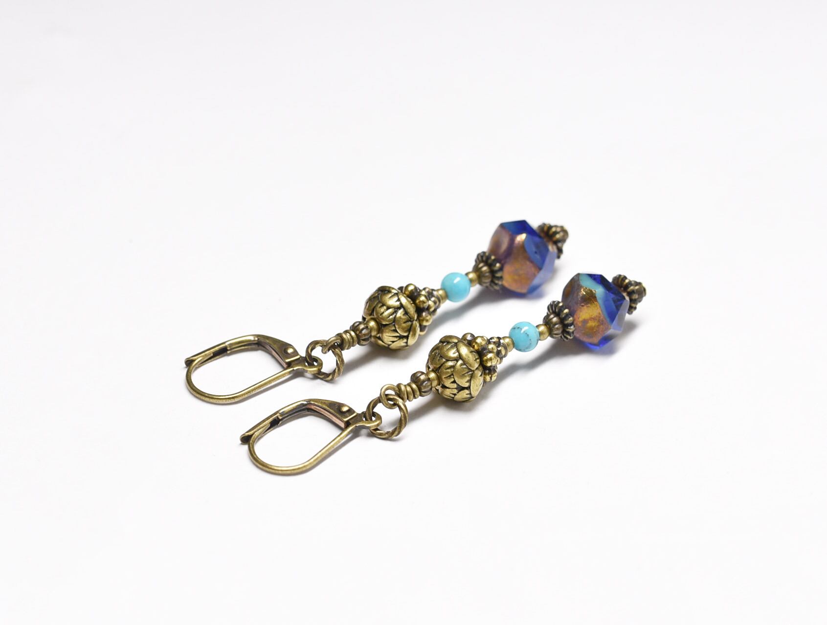 ブルー&ターコイズチェコビーズとターコイズ、蓮華ブラスのピアス(再販)