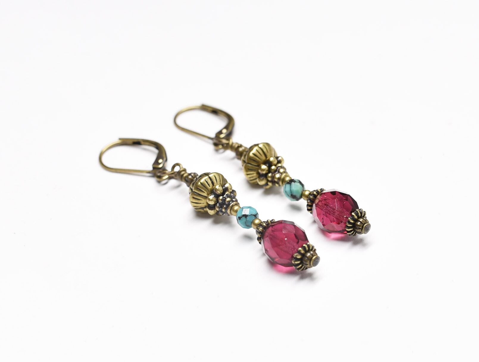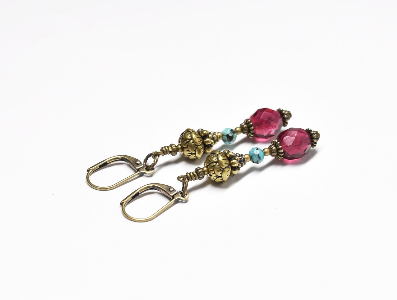 ラズベリーカラーヴィンテージビーズとターコイズ、蓮華ブラスを繋いだピアスです。