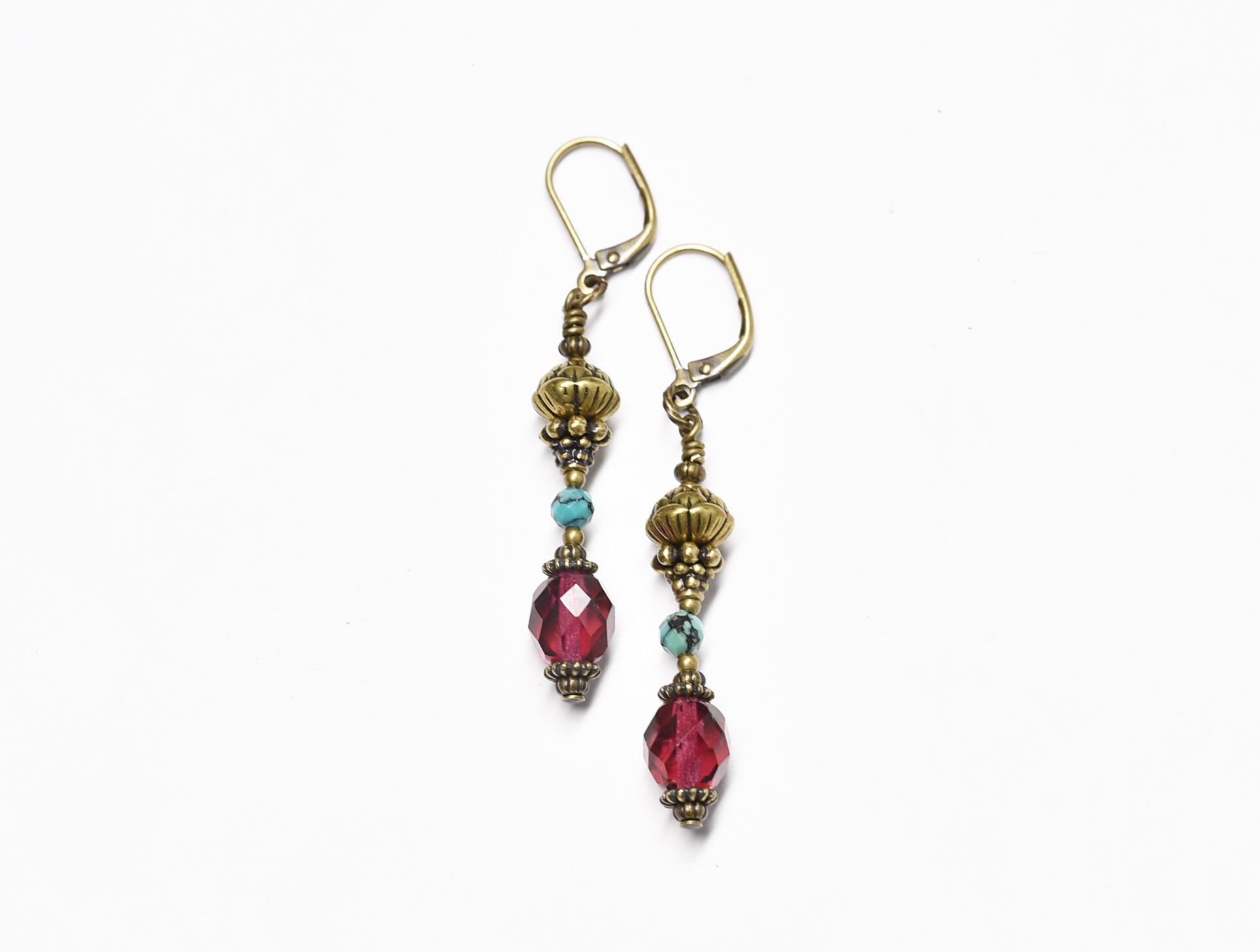 ラズベリーカラーヴィンテージビーズとターコイズの蓮華ブラスのピアス