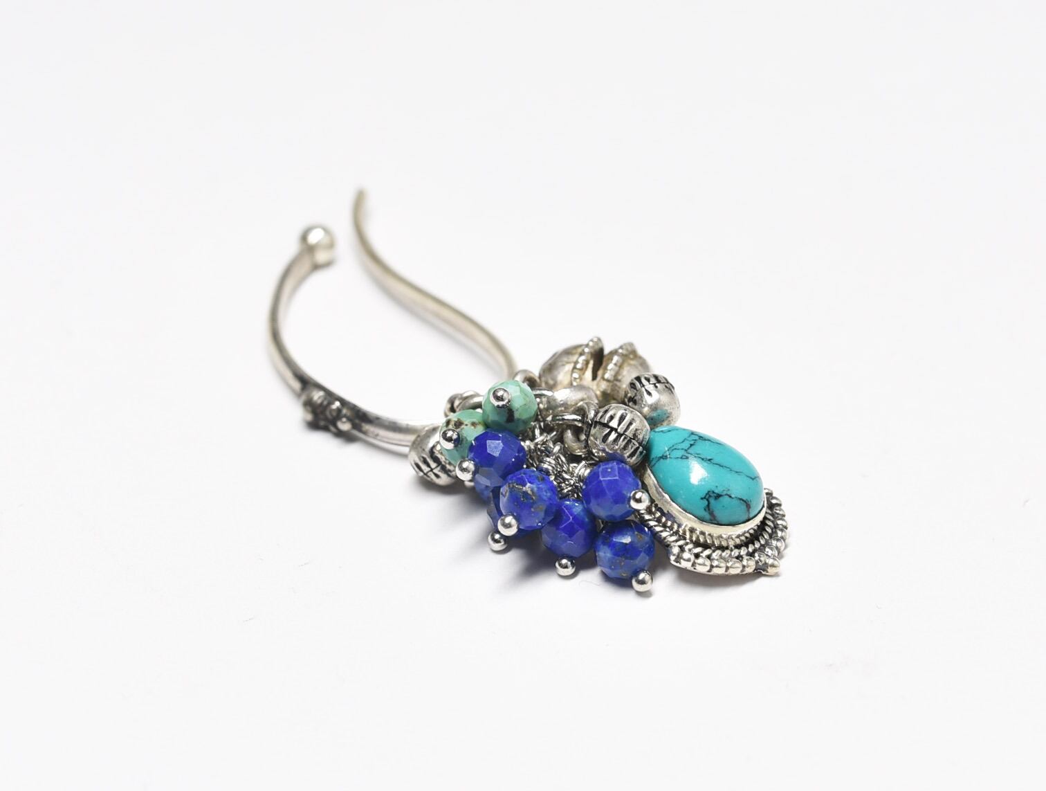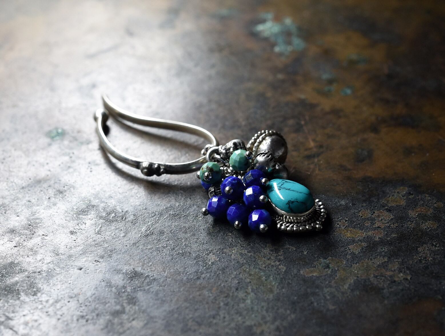 装飾シルバー枠ターコイズとたわわなターコイズと鈴を繋いだインドシルバーイヤーカフです。