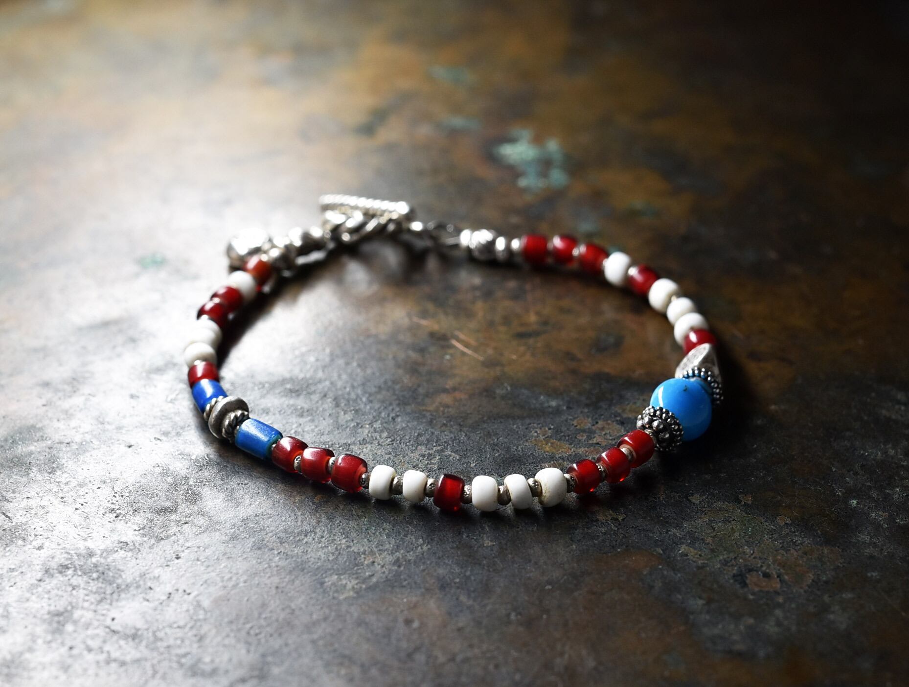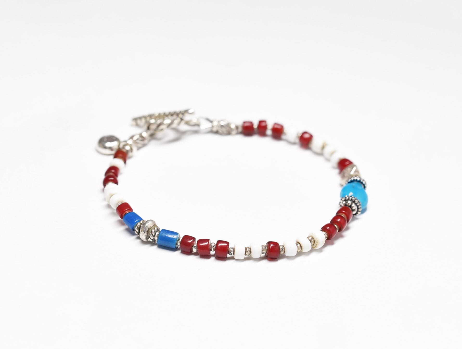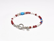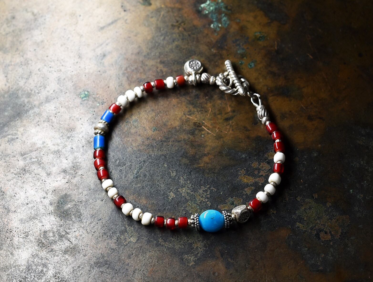 キングマンターコイズと濃赤&ブルーホワイトハーツ、ホワイトビーズ、カレンシルバーのブレス